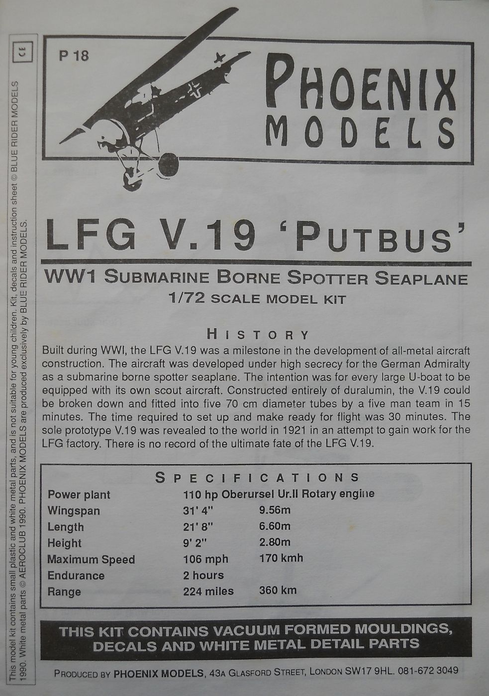 Вакуумформованная модель от фирмы Phoenix Kit упакована в полиэтиленовый пакет. Масштаб 1/72. Основные детали отформованы на одном листе пластика с довольно неплохой проработкой. В наборе присутствуют деталировка из белого металла и профили из пластика. Декали выглядят неплохо. Инструкция даёт минимальную информацию и не содержит схемы сборки.