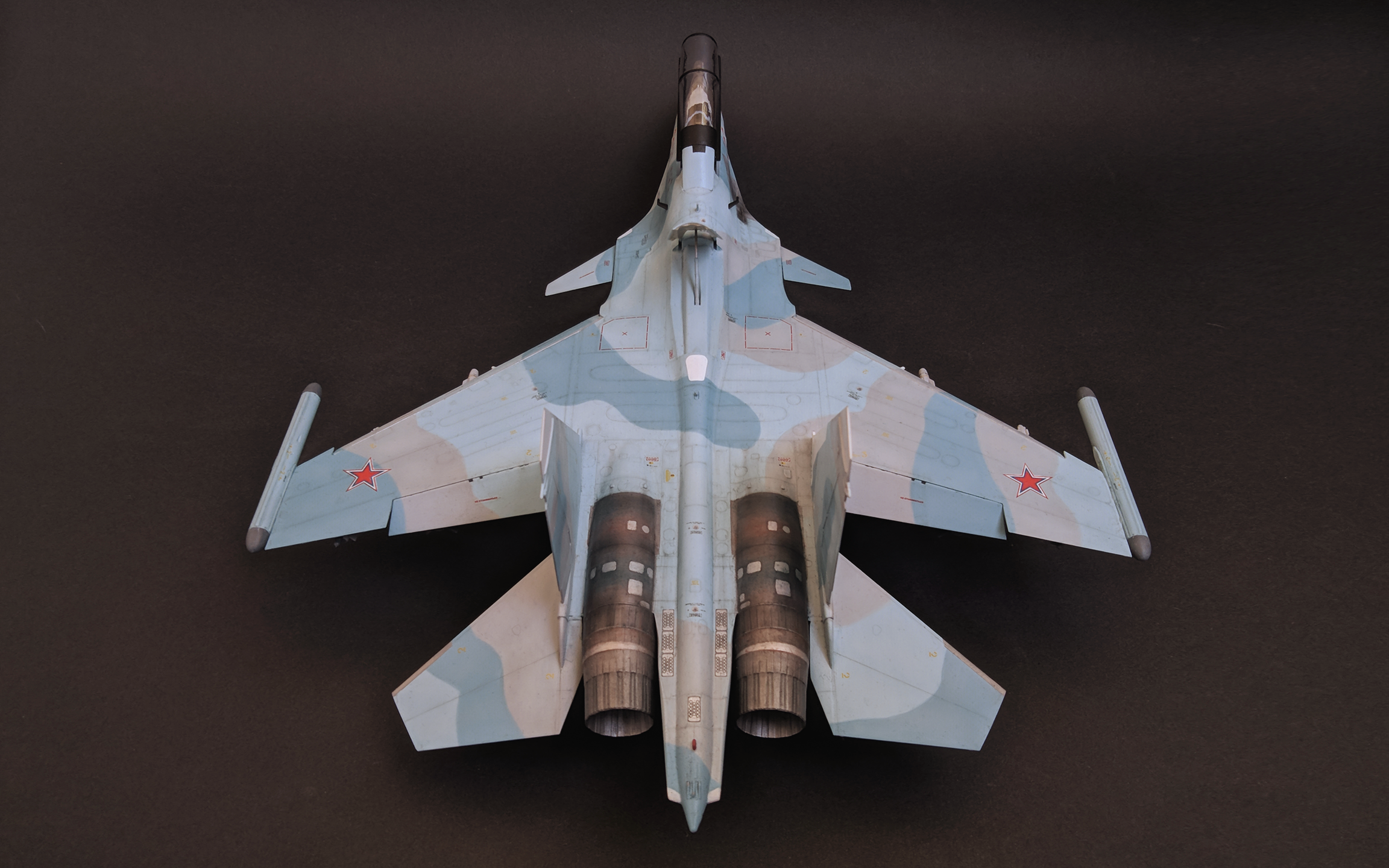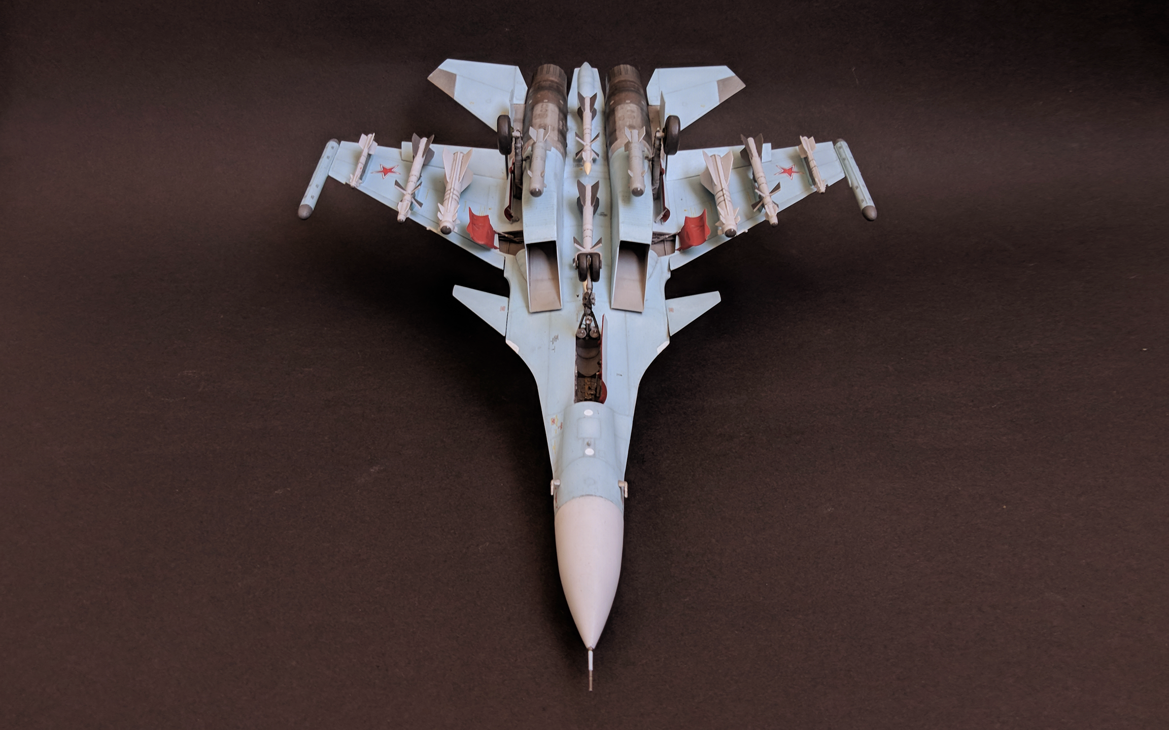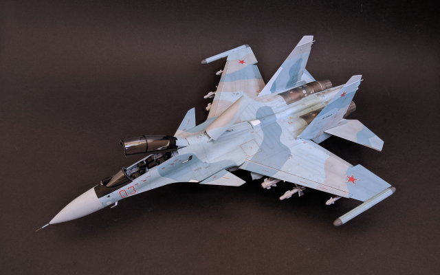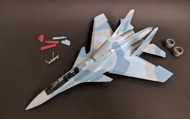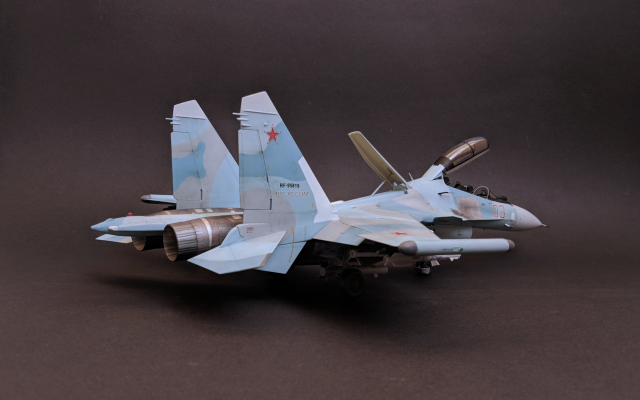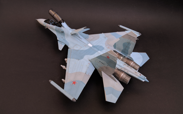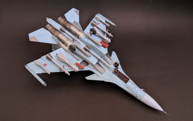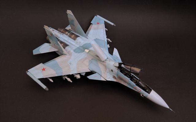 Впервые строил модель самолёта ОКБ Сухого, и вот результат. Сам набор от Звезды в целом показался приятным, за исключением некоторых моментов: несколько утяжин, не очень удобное членение прозрачных деталей фонаря и расположение питателей на них, совсем неглубокая расшивка, ошибки в инструкции.. Что порадовало - детализация ниши носовой стойки шасси, стыкуемость вроде ничего, много разнообразного вооружения, механизацию можно сделать в разных вариантах из коробки. Некоторые радиопрозрачные панели даются декалью, что немного упрощает окраску. По матчасти не могу сказать - с сушками не знаком, к сожалению.