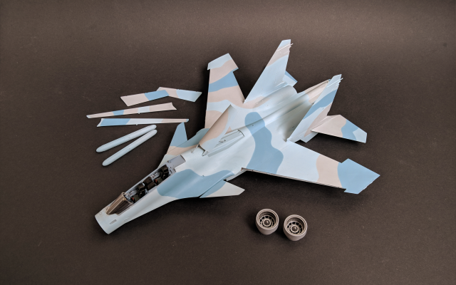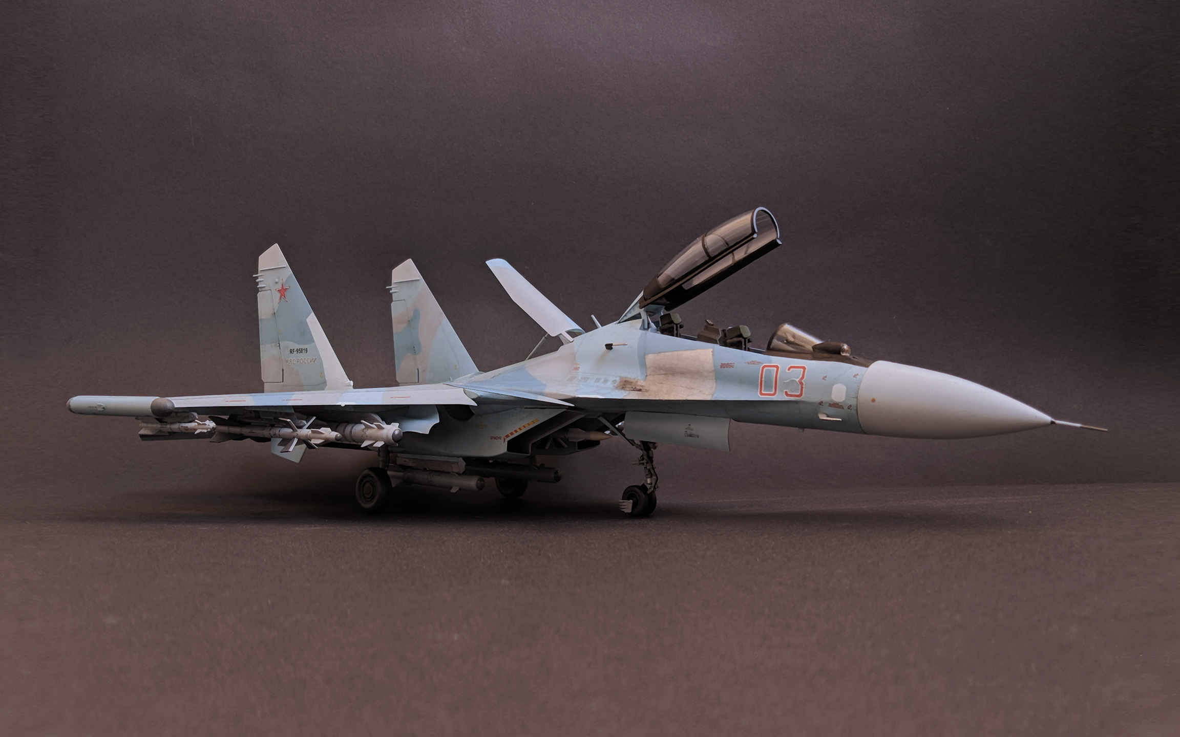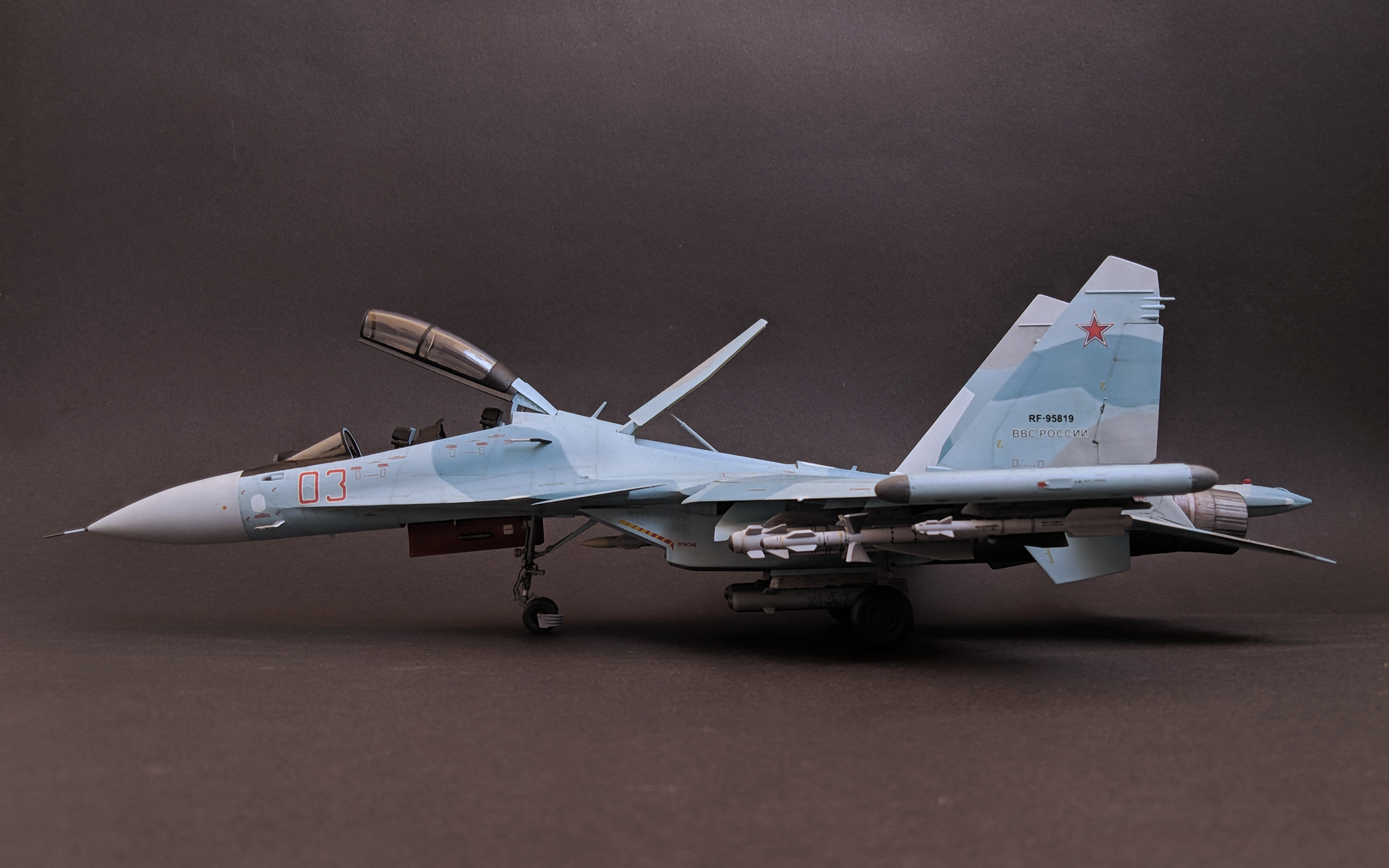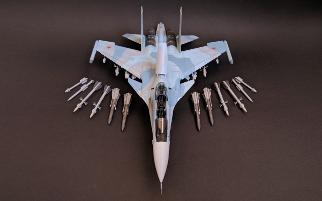 Впервые строил модель самолёта ОКБ Сухого, и вот результат. Сам набор от Звезды в целом показался приятным, за исключением некоторых моментов: несколько утяжин, не очень удобное членение прозрачных деталей фонаря и расположение питателей на них, совсем неглубокая расшивка, ошибки в инструкции.. Что порадовало - детализация ниши носовой стойки шасси, стыкуемость вроде ничего, много разнообразного вооружения, механизацию можно сделать в разных вариантах из коробки. Некоторые радиопрозрачные панели даются декалью, что немного упрощает окраску. По матчасти не могу сказать - с сушками не знаком, к сожалению.