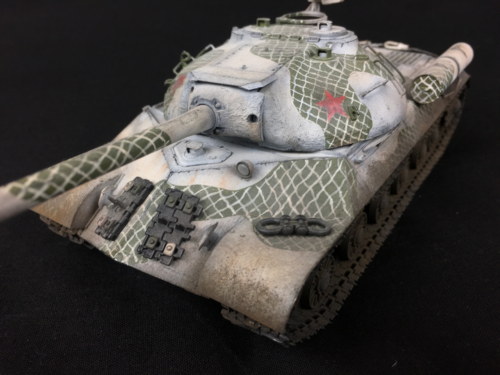 Так как я люблю нестандартные и эпатажные работы, а не скучные монотонные, я пустился во все тяжкие и сделал камуфляж по мотивам того, в который красили танки 1-ой гвардейской танковой бригады в 1941 году. Подумал, что пусть оно совсем не исторично, зато красиво. Меня вот эта нестандартность воодушевляет и вдохновляет, что в нашем деле главное. Самое интересно и примечательное, что зеленые камуфляжные пятна я рисовал кистью тамиевской краской. В то время я не задумывался о том, что Тамия - краска совсем не под кисть, но я просто делал и на удивление получилось очень даже прилично.