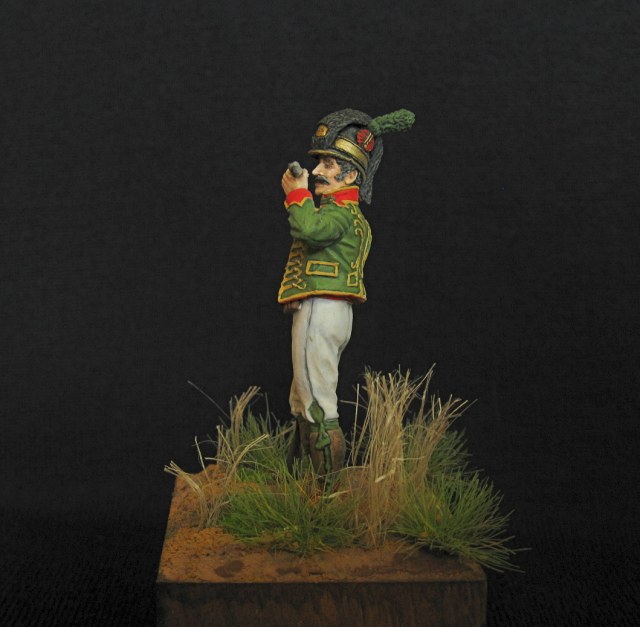 Здравствуйте. Вот такой испанец, по уставу 1802 года. Немного развернул левую руку, для удобства работы с лицом. Акрил, эмаль. 54 мм.