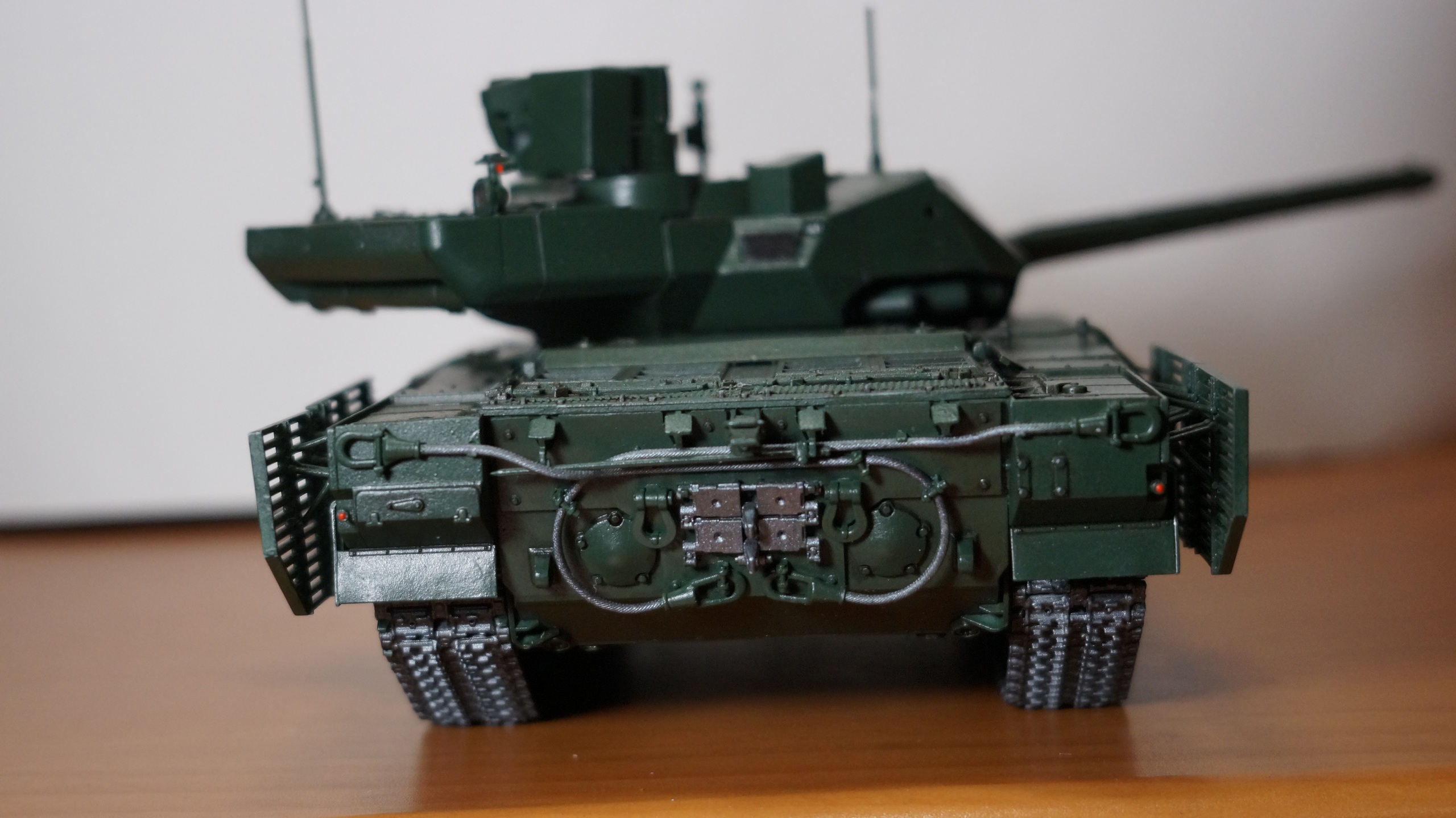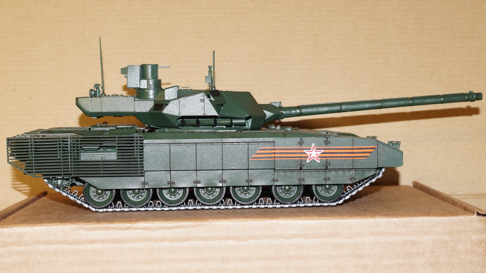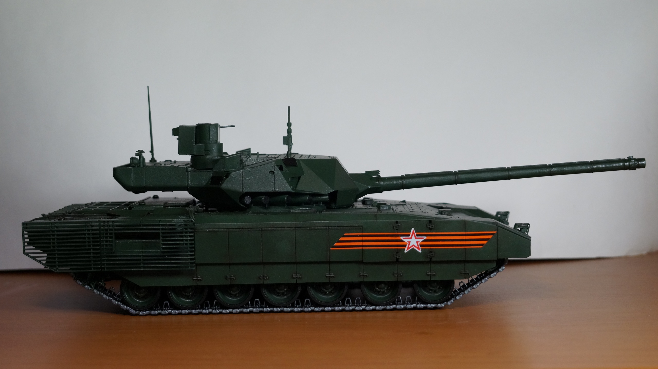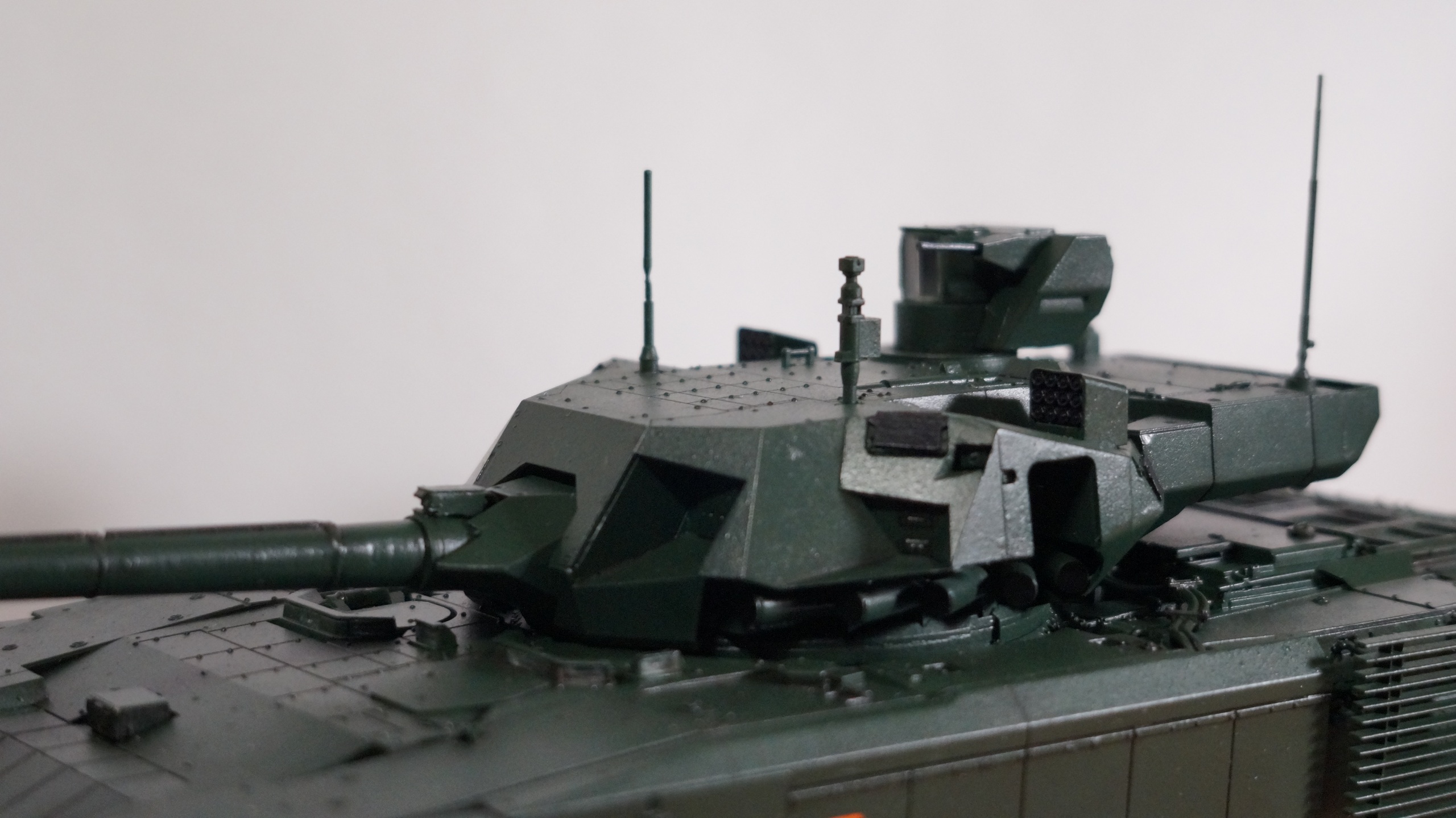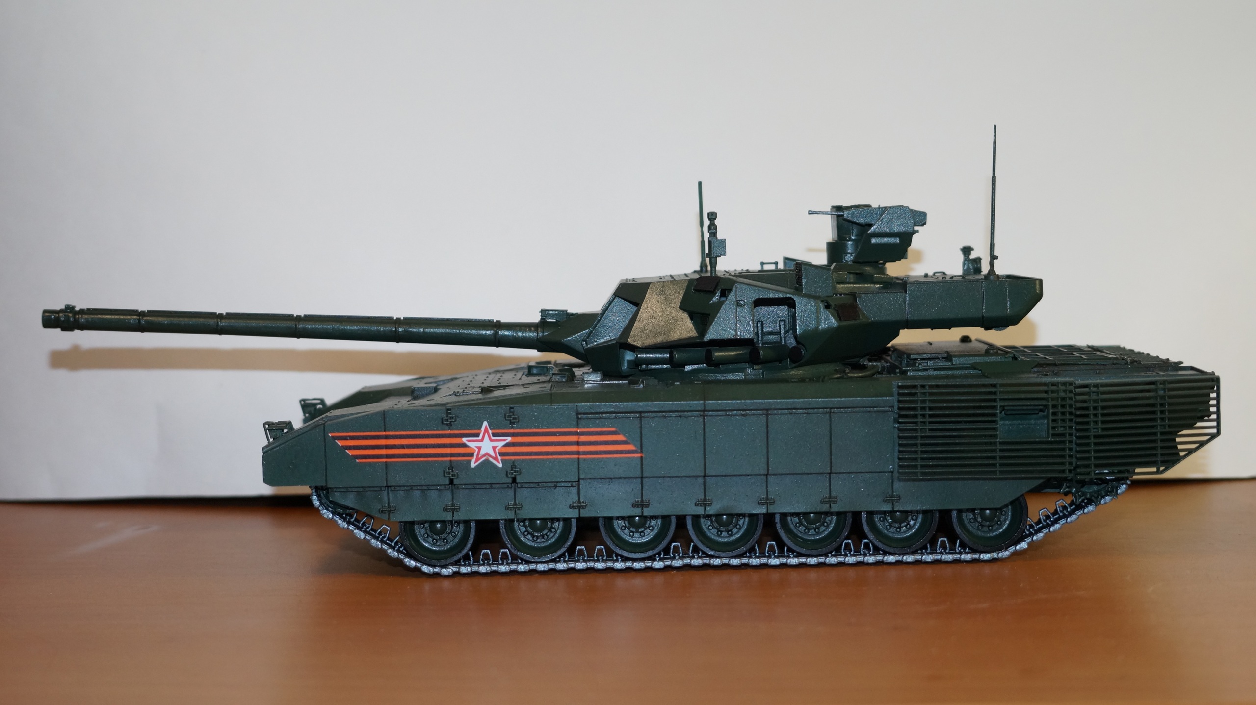 Вот собрал очередную модель от "Звезды" - Т-14 "Армата" в парадном варианте. Собрал из коробки, ничего не изменяя и не добавляя. Корпус, башню и, частично, гусеницы красил аэрографом, резиновые подушки на гусеницах, бандажи на катках и черные бронещитки на башне - кистью. Для аэрографа использовал краски от AK-interaktive, для кисти - от "Звезды". Для окраски корпуса и башни смешал две краску темно-зеленого и зеленого цветов в пропорции примерно 50:50, получился цвет, пусть и не парадной окраски настоящих танков, но близкий к нему. А после того, как задул окрашенную модель глянцевым лаком - цвет стал, по моему, еще ближе, хотя все равно не тот. После нанесения глянцевого лака поверхность модели почему-то покрылась белесым налетом. Раньше такого не было. Однако после того как лак просох, налет легко смывался влажной салфеткой. После того как лак просох, нанес смывку Dark Brown от AK-interaktive, а в заключении задул все это матовым лаком. Как получилось - судить Вам, коллеги.