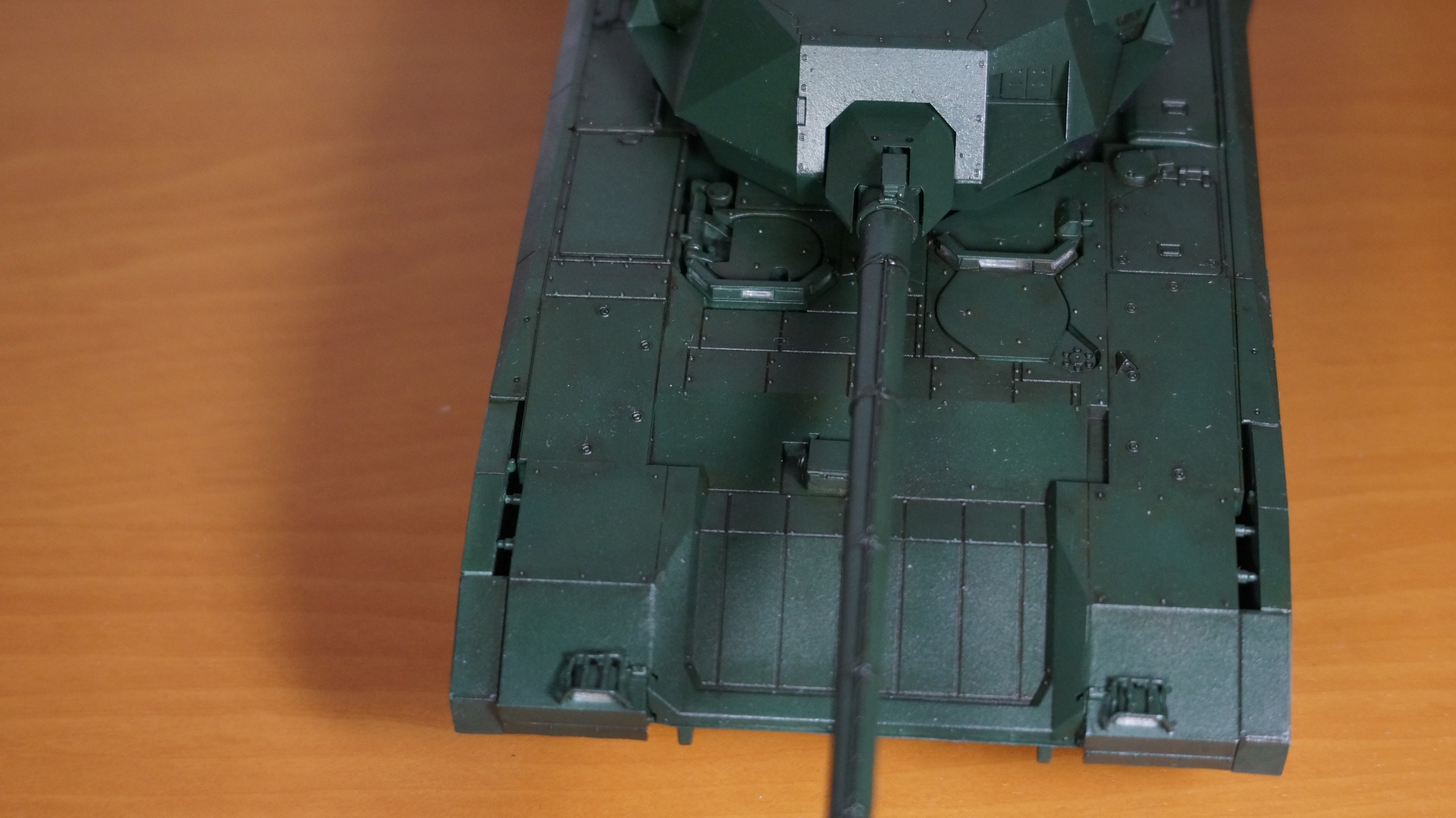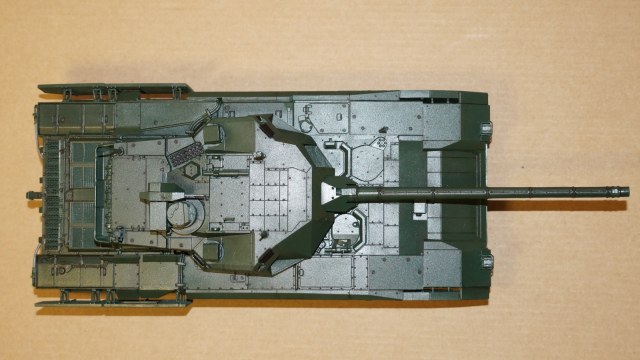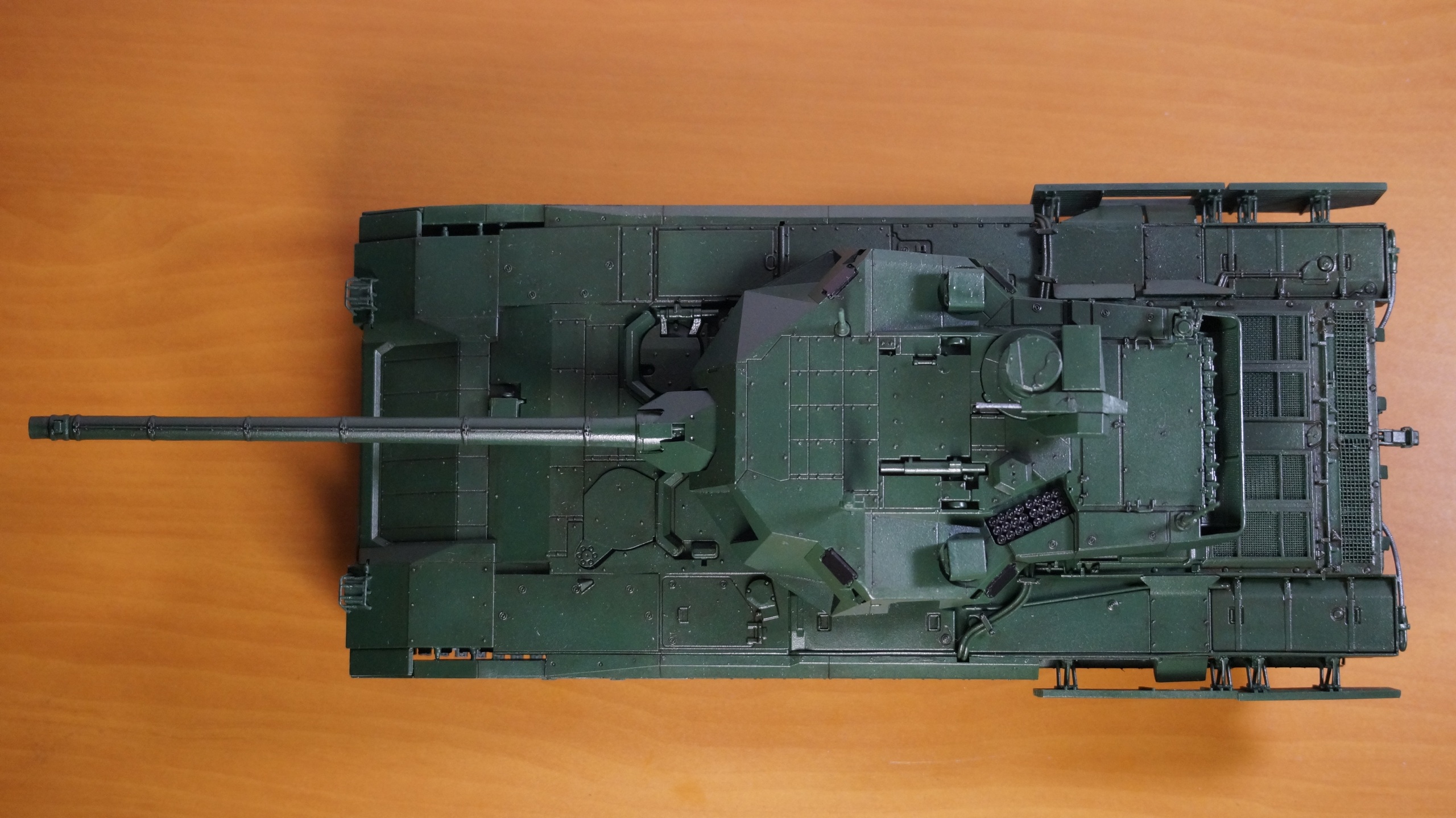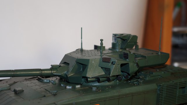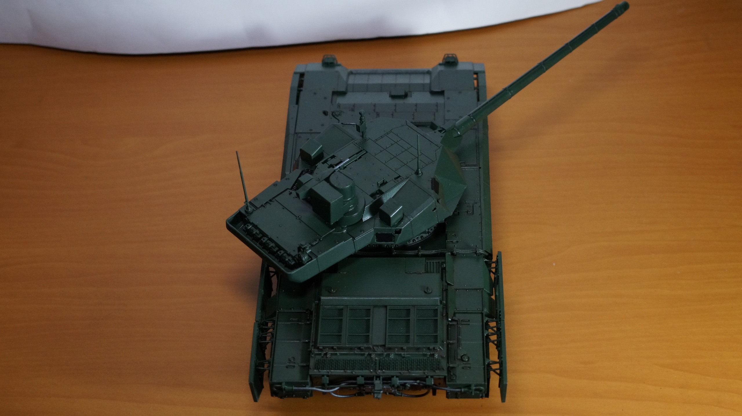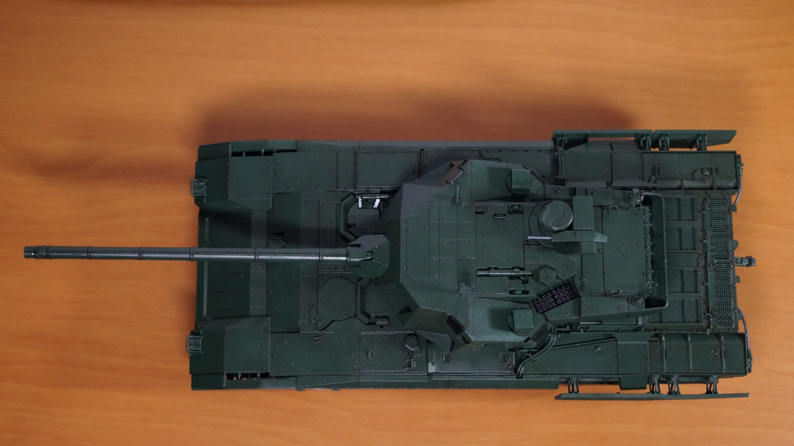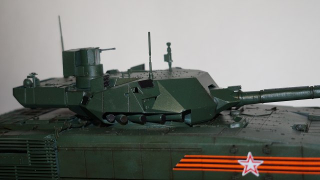 Вот собрал очередную модель от "Звезды" - Т-14 "Армата" в парадном варианте. Собрал из коробки, ничего не изменяя и не добавляя. Корпус, башню и, частично, гусеницы красил аэрографом, резиновые подушки на гусеницах, бандажи на катках и черные бронещитки на башне - кистью. Для аэрографа использовал краски от AK-interaktive, для кисти - от "Звезды". Для окраски корпуса и башни смешал две краску темно-зеленого и зеленого цветов в пропорции примерно 50:50, получился цвет, пусть и не парадной окраски настоящих танков, но близкий к нему. А после того, как задул окрашенную модель глянцевым лаком - цвет стал, по моему, еще ближе, хотя все равно не тот. После нанесения глянцевого лака поверхность модели почему-то покрылась белесым налетом. Раньше такого не было. Однако после того как лак просох, налет легко смывался влажной салфеткой. После того как лак просох, нанес смывку Dark Brown от AK-interaktive, а в заключении задул все это матовым лаком. Как получилось - судить Вам, коллеги.