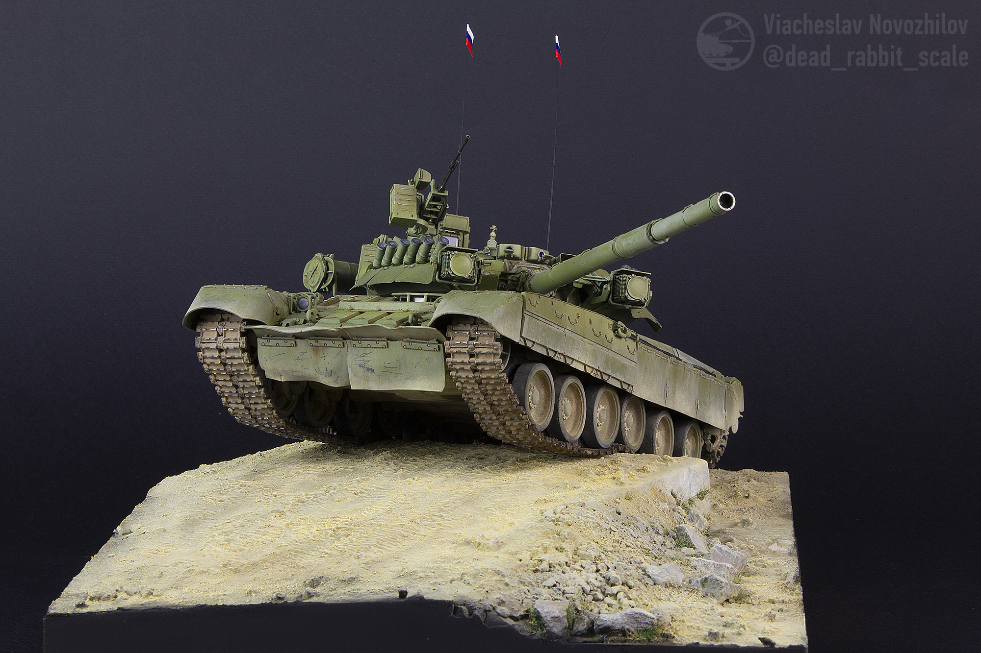 Не привычно видеть твою модель на диорамке. Исполнение понравилось все в меру,танк только выехал на полигон,отсюда вывод - грязи еще не успел на себя накидать.