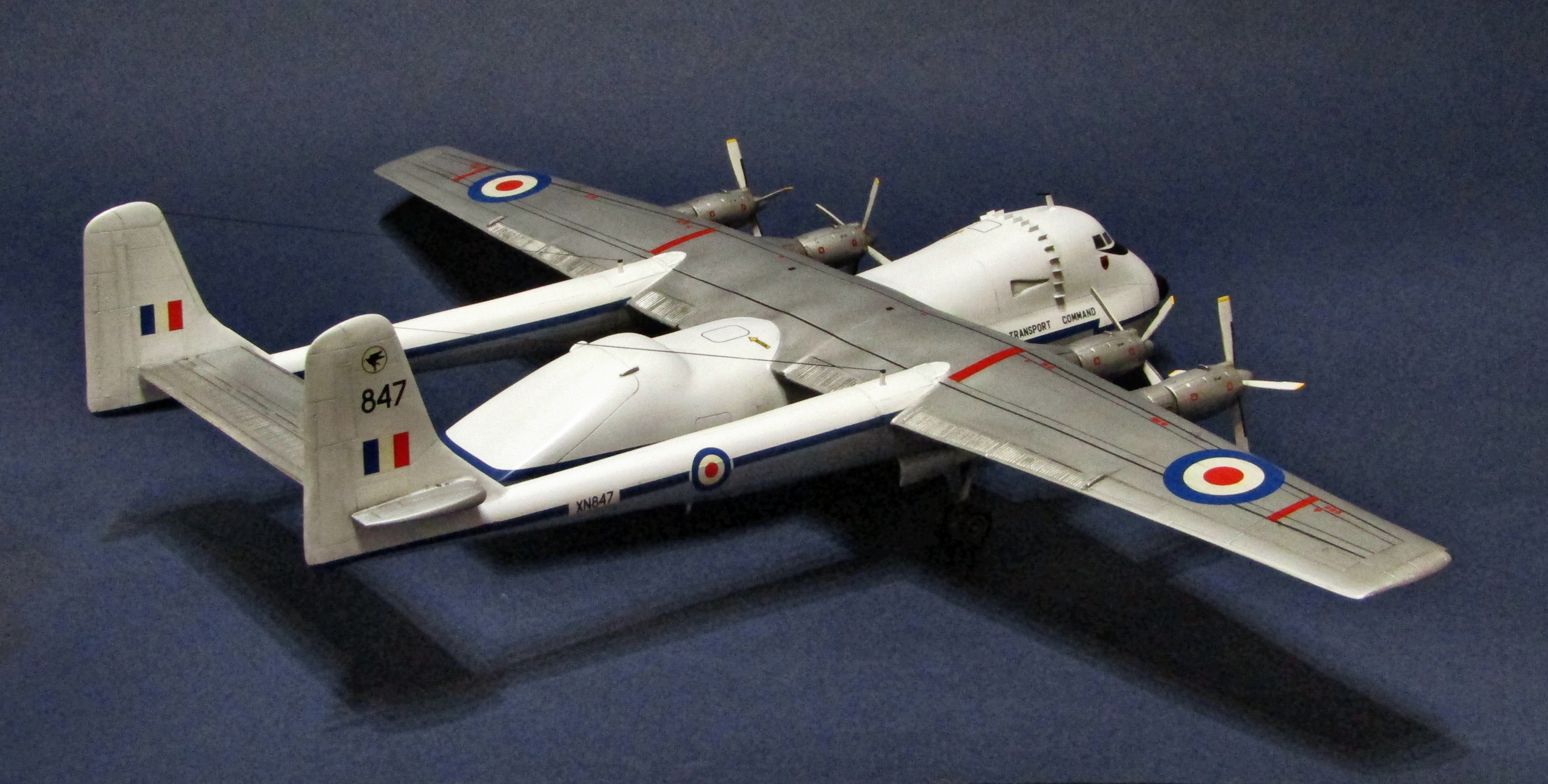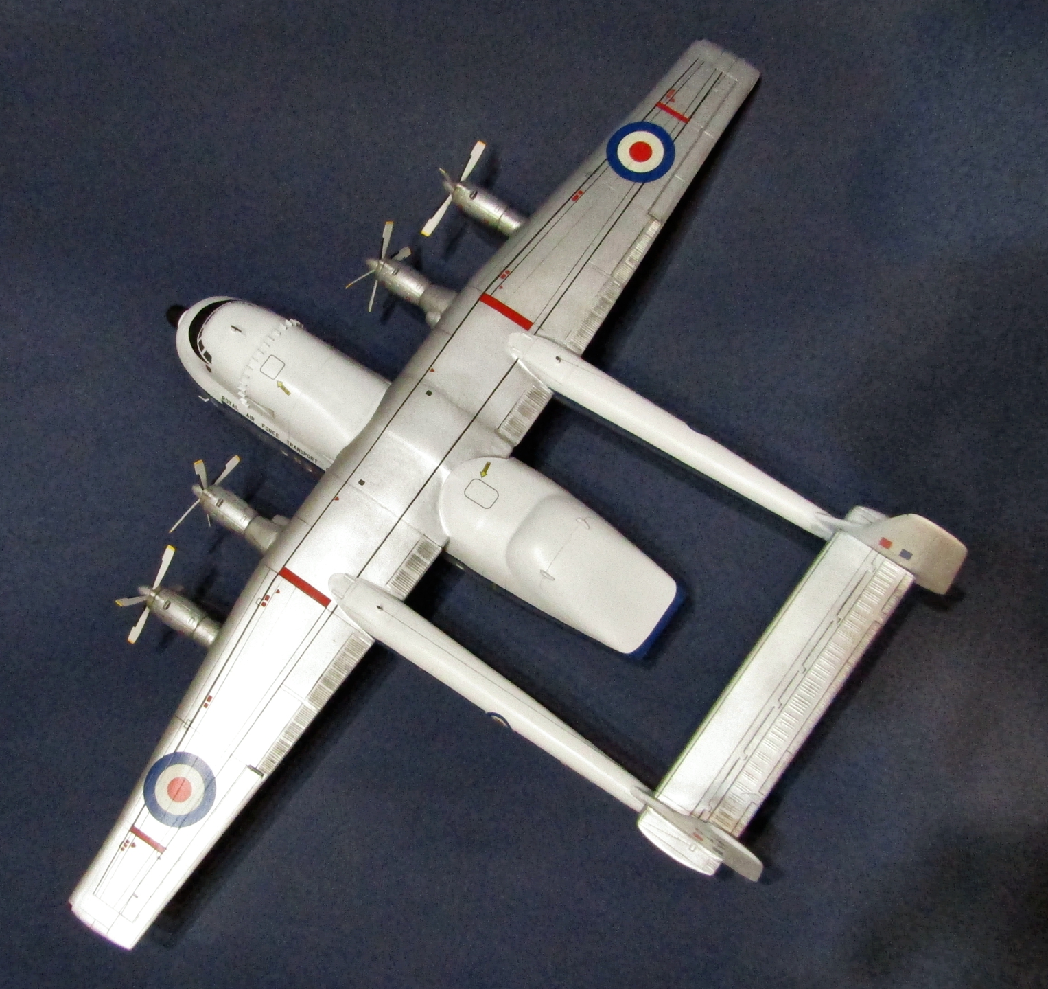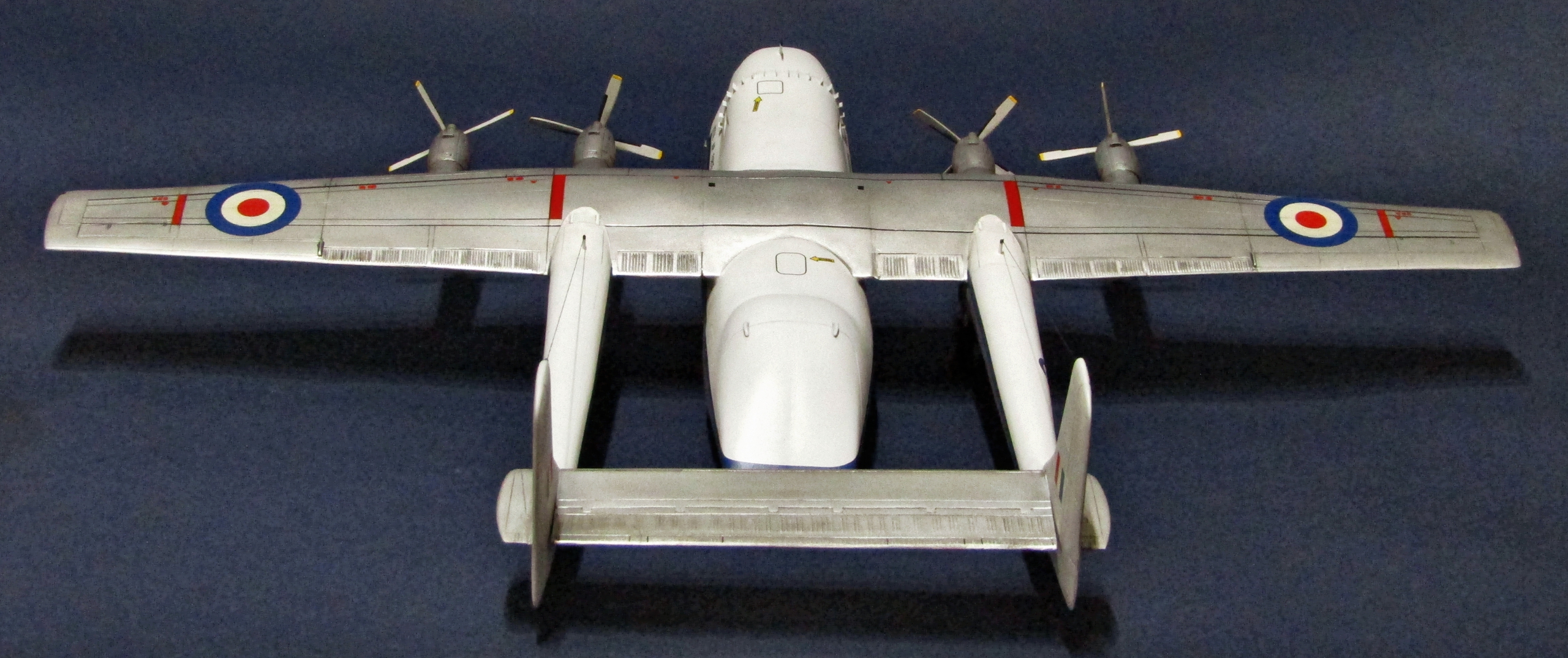 Приветствую коллеги! Ну вот и закончил очередной запил дровишек от Mach2. В принципе набор не такой страшный в сравнении с Avro 685, который я ранее собирал. Всё стыкуется достаточно хорошо, но конечно шпаклёвки надо иметь много - я использовал серую тамиевскую. Декали в наборе даются превосходного качества, не рвутся и ложатся во все углубления и без применения специальных жидкостей. Для развесовки над передней нишей шасси уложил стальные болты, но и их не хватило, пришлось в дальнейшем растачивать полости во всех 4-х двигателях и добавить в каждый ещё по болту, вот тогда-то желаемое равновесие и установилось) Доработок не делал, ну разве что антенны над фюзляжами ну и "прямоугольнички" вырезал из дошира за кабиной (честно говоря не знаю что это такое и как называется). Маски нарезал из revell'овской ленты - для овалов вырезал трафарет из тонкого листа алюминия. Грунтовал серой Ганзой 1500. Белый и синие полосы - эмаль Тамии, металлики - Pacific 88, смывка - Тамия, финишное покрытие - полуглянцевый акриловый лак Тамии. Чёрныеи красные полосы на крыле - самостоятельно заклеивал масками и задувал аэрографом. В принципе всё, что мог рассказал, хочу только добавить что работать над этим пухленьким монстром лично мне понравилось, всё-таки очень необычный аппарат, приятного просмотра коллеги...