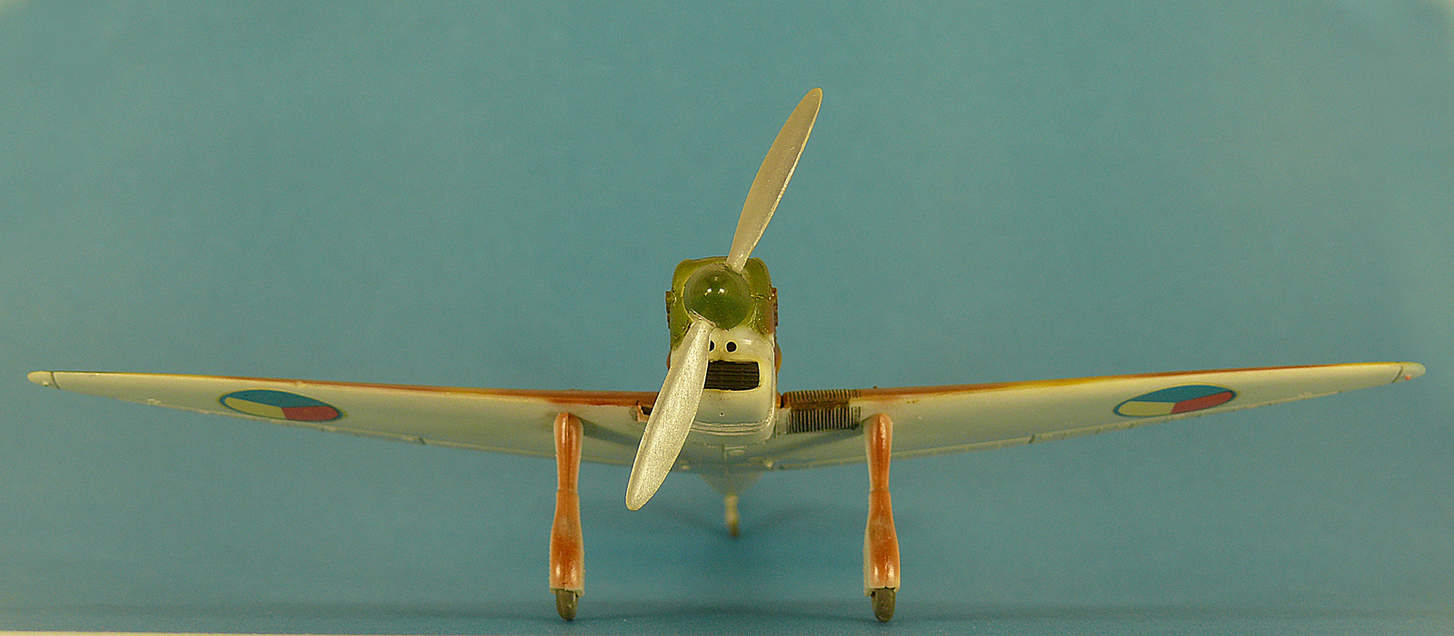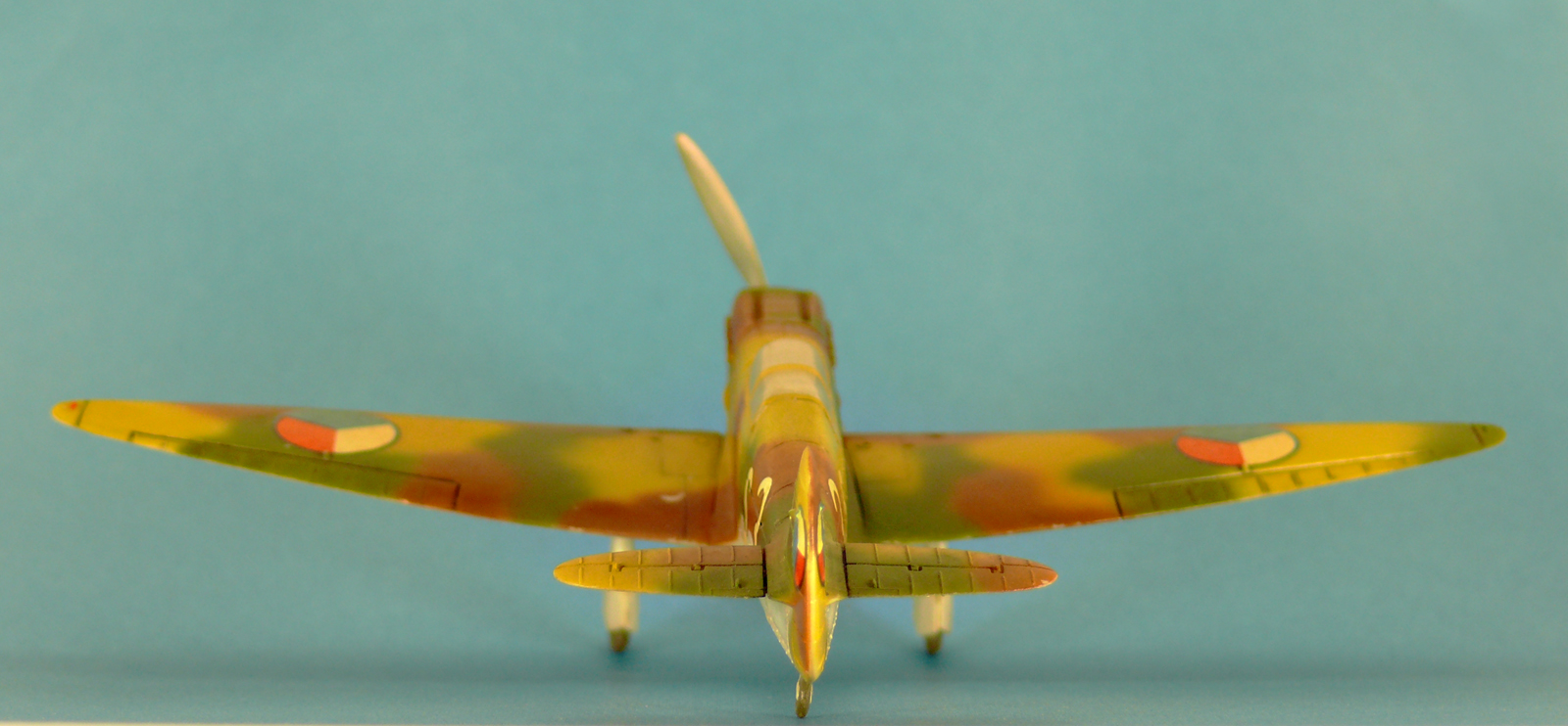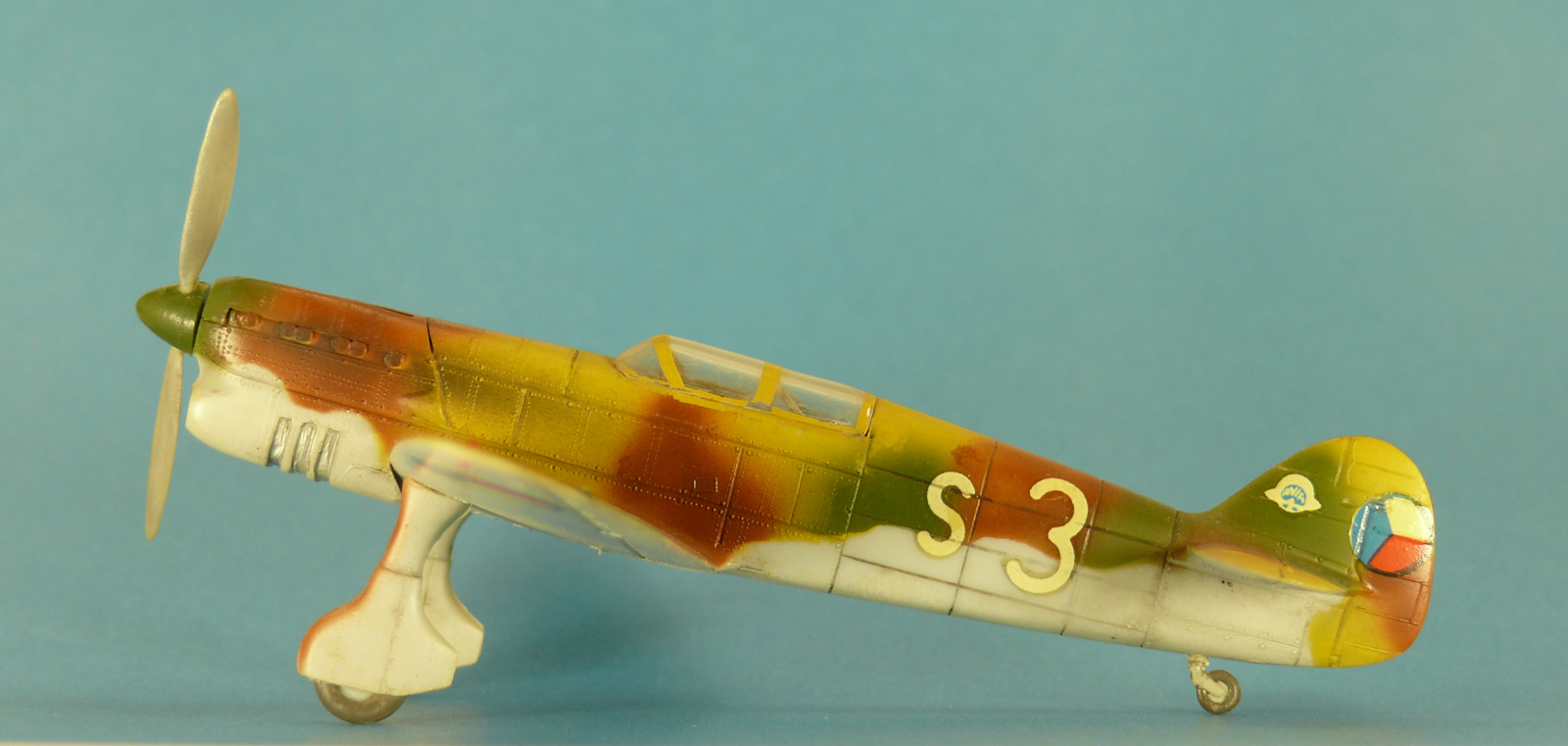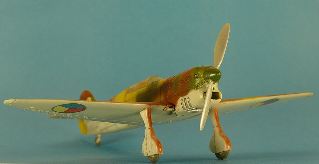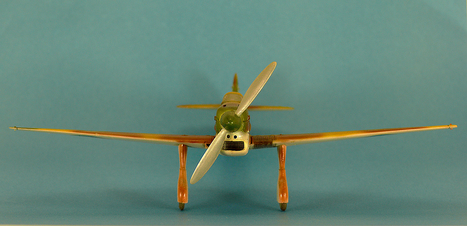 Совершенно изкоробочный вариант, пытался доработать только низ обтекателя радиатора, уровень конечно песочный, но она мне очень нравится. Это одна из первых моих моделей покрашенных аэрографом. Красил нитрой без грунтовки, поэтому со временем краска кое где откололась. Красил без масок, цвета мешал на глаз по образцам на коробке модели. Швы заливал маслом на уайт-спирите. Переплет кабины сначала надувал на полиэтиленовую пленку, затем резал на полоски, отсоединял от полиэтилена и приклеивал спиртом к остеклению.