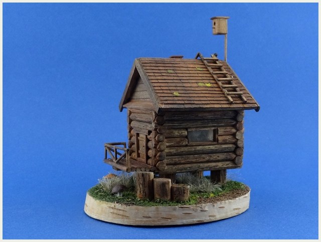 Душевненько так. Чую ,что придется тебе делать еще аналогичное,достанут друзья-приятели. Поэтому совет наперед- лапа рубится в верхнем бревне,а не в нижнем. Так удобнее и в реале и в модели. И в верхнем бревне рубится желоб,который "надевается" на нижнее. Я на первых моделях тоже резал лапу на нижнем и в нее укладывал, потом обнаружил как правильно. Хорошая работа
