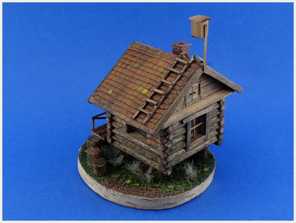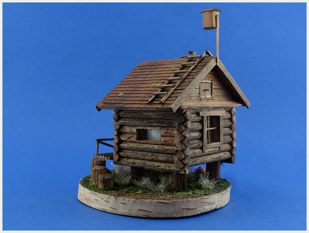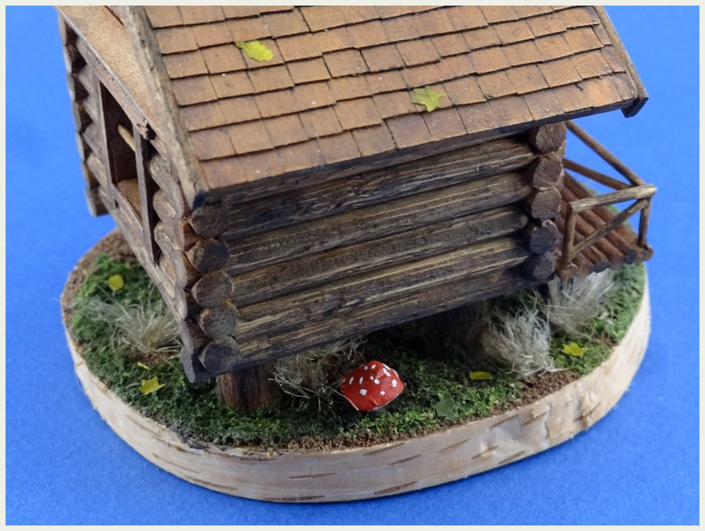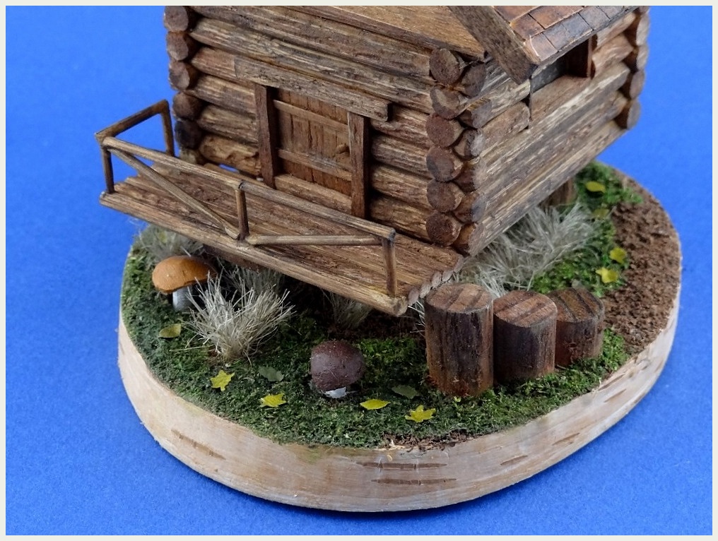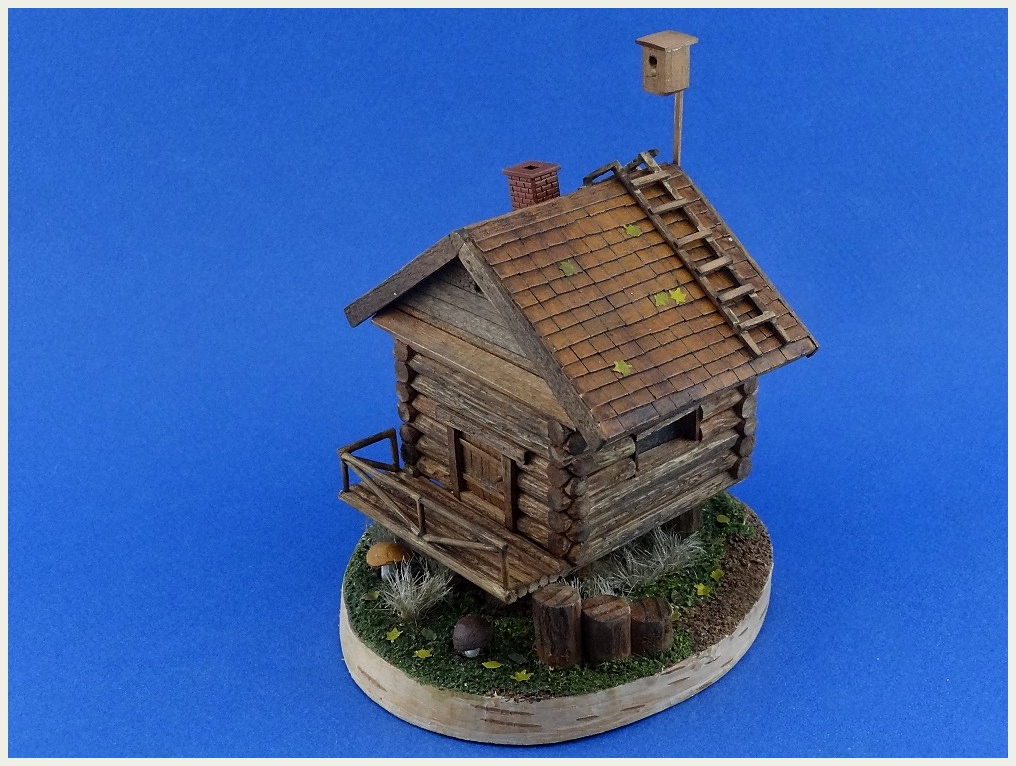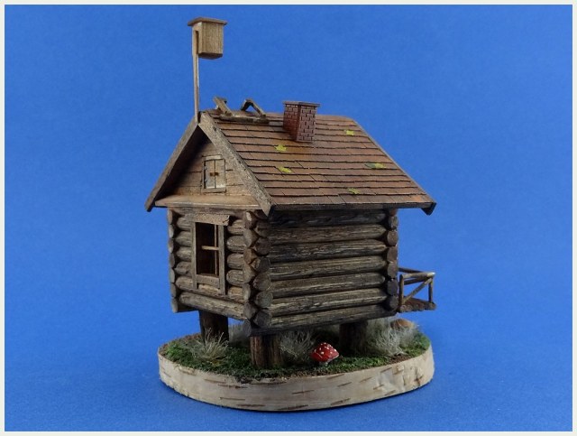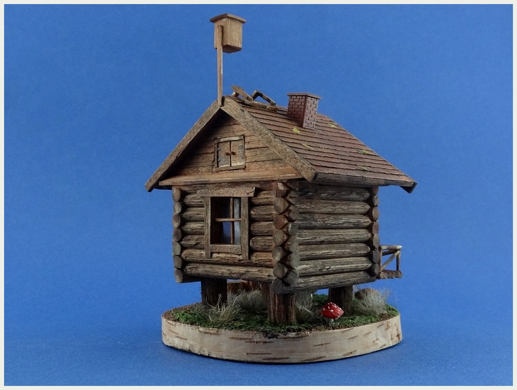 В сборке избы применялся в основном натуральный материал - древесина. Каркас сделан из круглых палочек разного диаметра. Дымоход из пластика. Крыша сделана из линеек, имитация черепицы - лист картона. Подставка - декоративный деревянный круг. Основным наполнением проекта выступили: грибы, лестница на крыше и скворечник. Трава имитирована из пакли, сушенного молотого чая. Размеры модели: высота 12,5 см, длина/ширина 9x5 см.