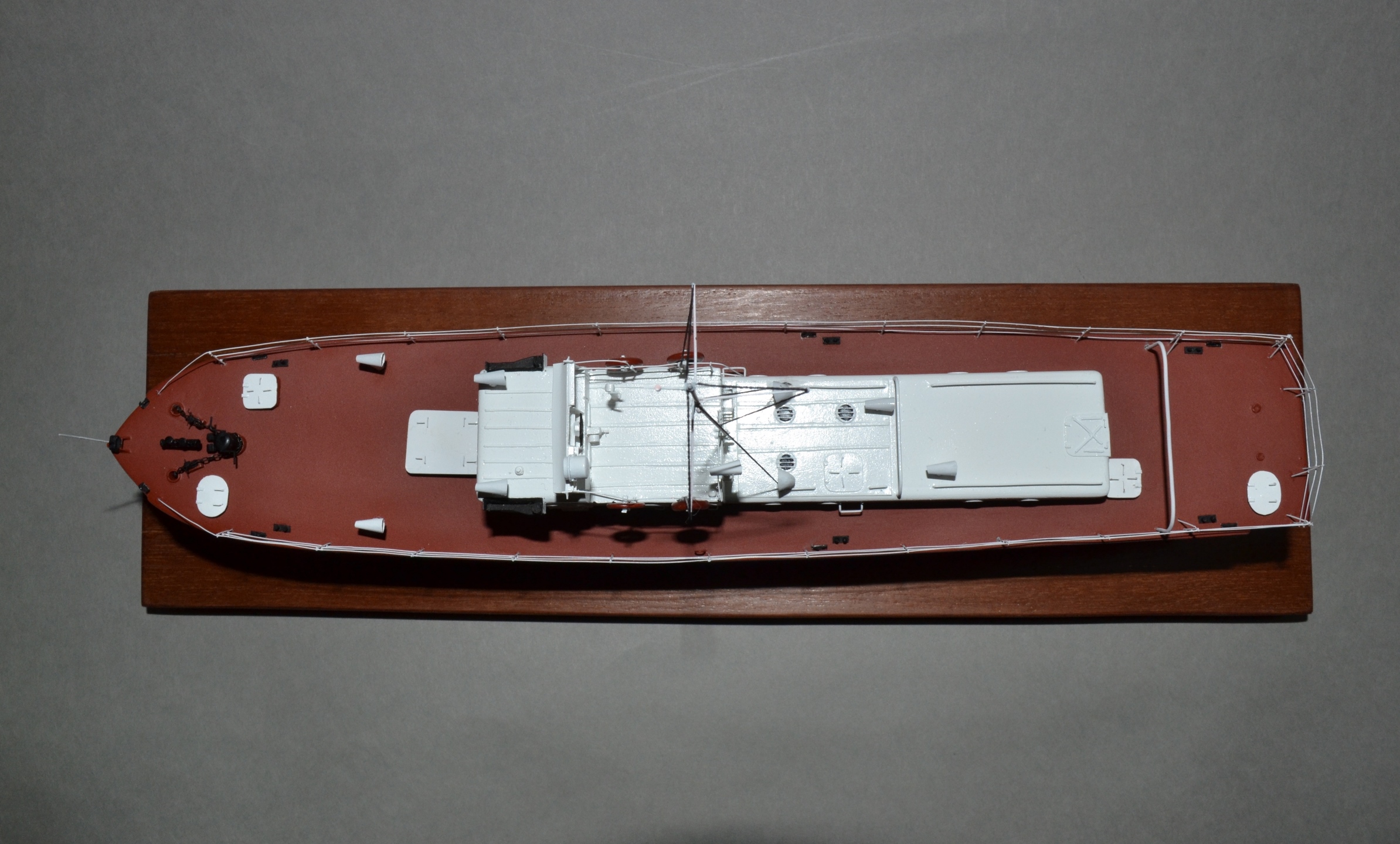 Набор из картона, шпации заполнил пенопластом, надстройка из пластика, мелочевка из проволоки и пластика, леерные стойки травленые, подставку оклеил шпоном.