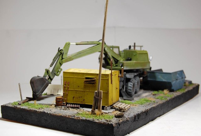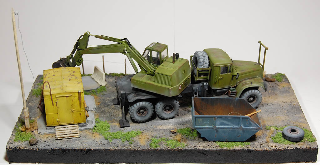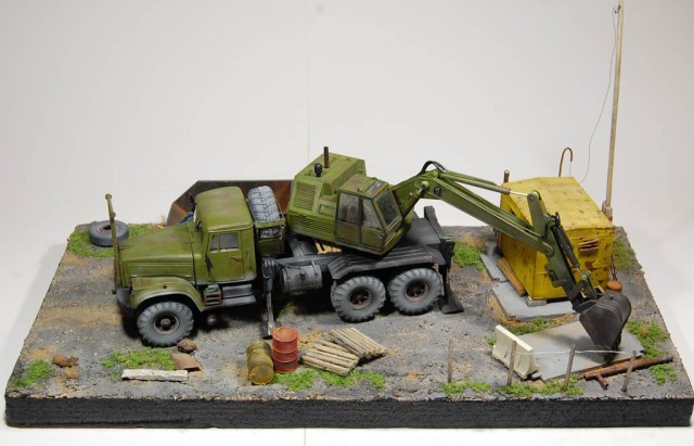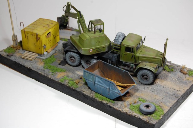 Здравия всем!Собрал подставку с Кразом за пару месяцев,процесс меня порадовал!Использовал материалы:Пенополистирол,шпатлевка по дереву,песок обычный,красилось основание Гуашью,модель Краза,бытовка и контейнер красились Тамией и солевым методом.Плюшки от АВД:бытовка,контейнер,колесо,от Опуса:2 бочки,ящик и дорожный блок.Столб самодельный-приставки из худ.глины а сам столб из шпажек для шашлыка.Ссылка на видео обзор https://www.youtube.com/watch?v=zh4U5M3X-Xs