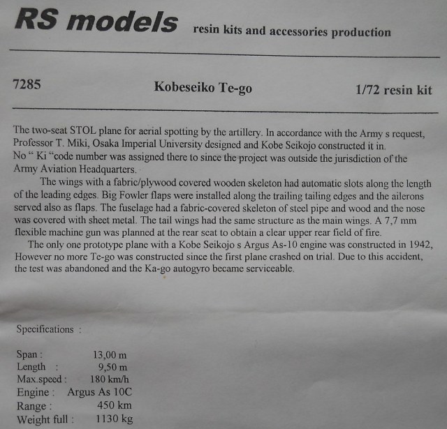 Модель из смолы от фирмы RS Models в масштабе 1/72 (номер по каталогу 7285) упакована в прочную картонную коробку с верхним открытием. Литьё среднего качества, имеются незначительные дефекты. Деталировка кабины довольно бедная. Ваку-остекление смотрится относительно нормально, хотя отдельные фрагменты придётся сделать самостоятельно. Декали выглядят неплохо, несмотря на возраст. Инструкция относительно наглядна и информативна.