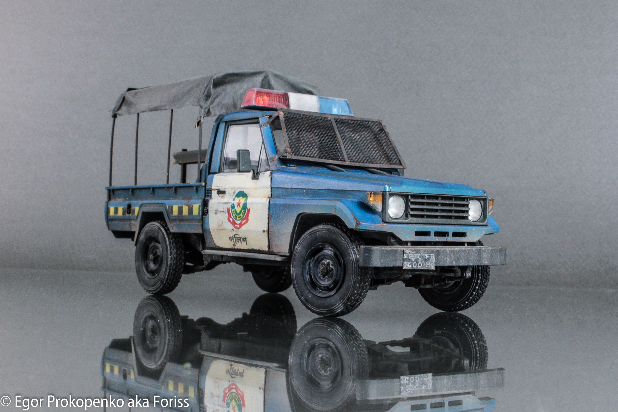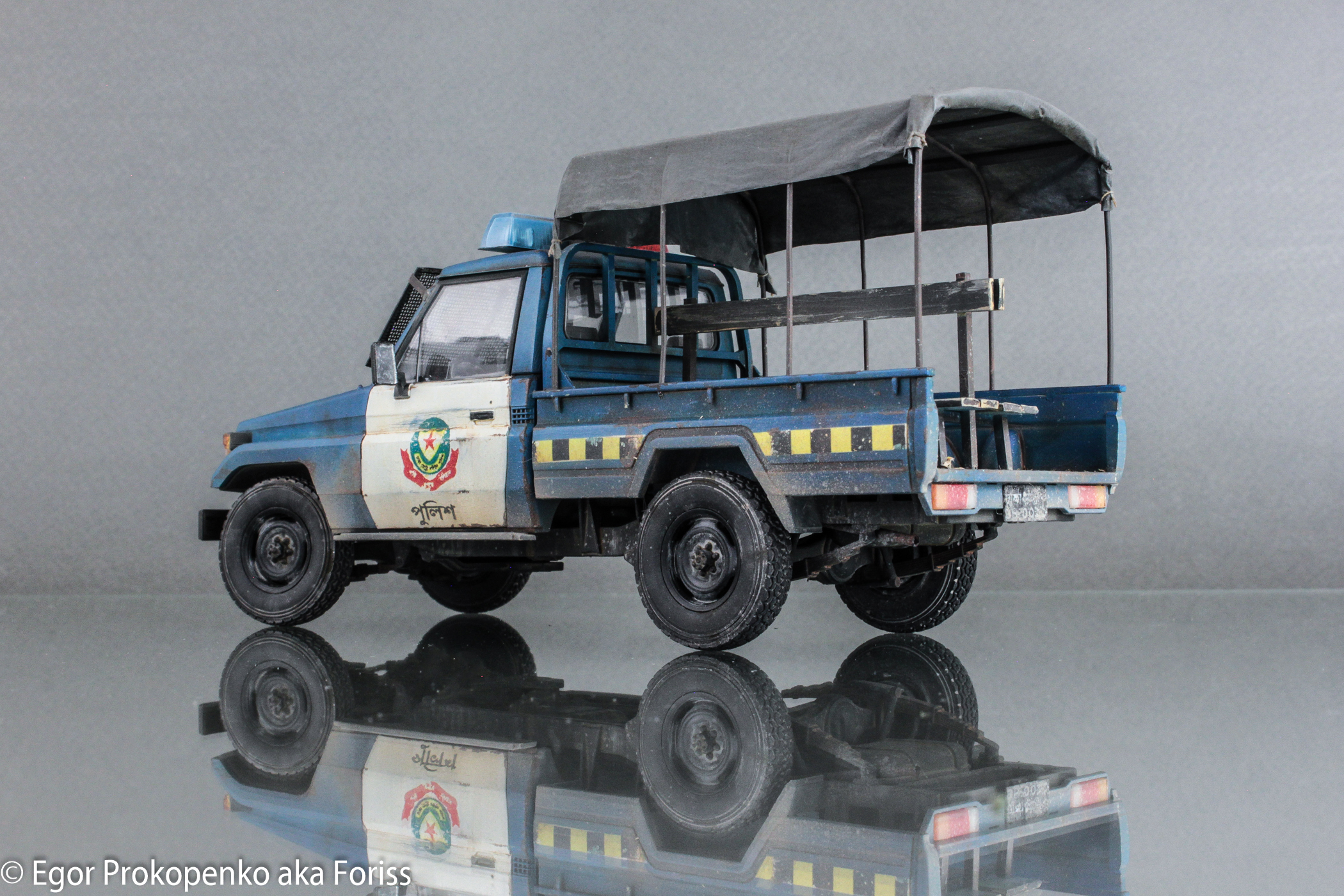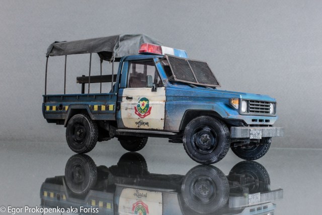 Дошли руки отснять работу, которую завершил еще в августе текущего года, и которая уже успела побывать на выставке «Кузница Победы 2019» в г. Новокузнецке в сентябре, где взяла 1 место в соответствующей номинации – это Тойота Ленд Крузер, автомобиль полиции Народной Республики Бангладеш.