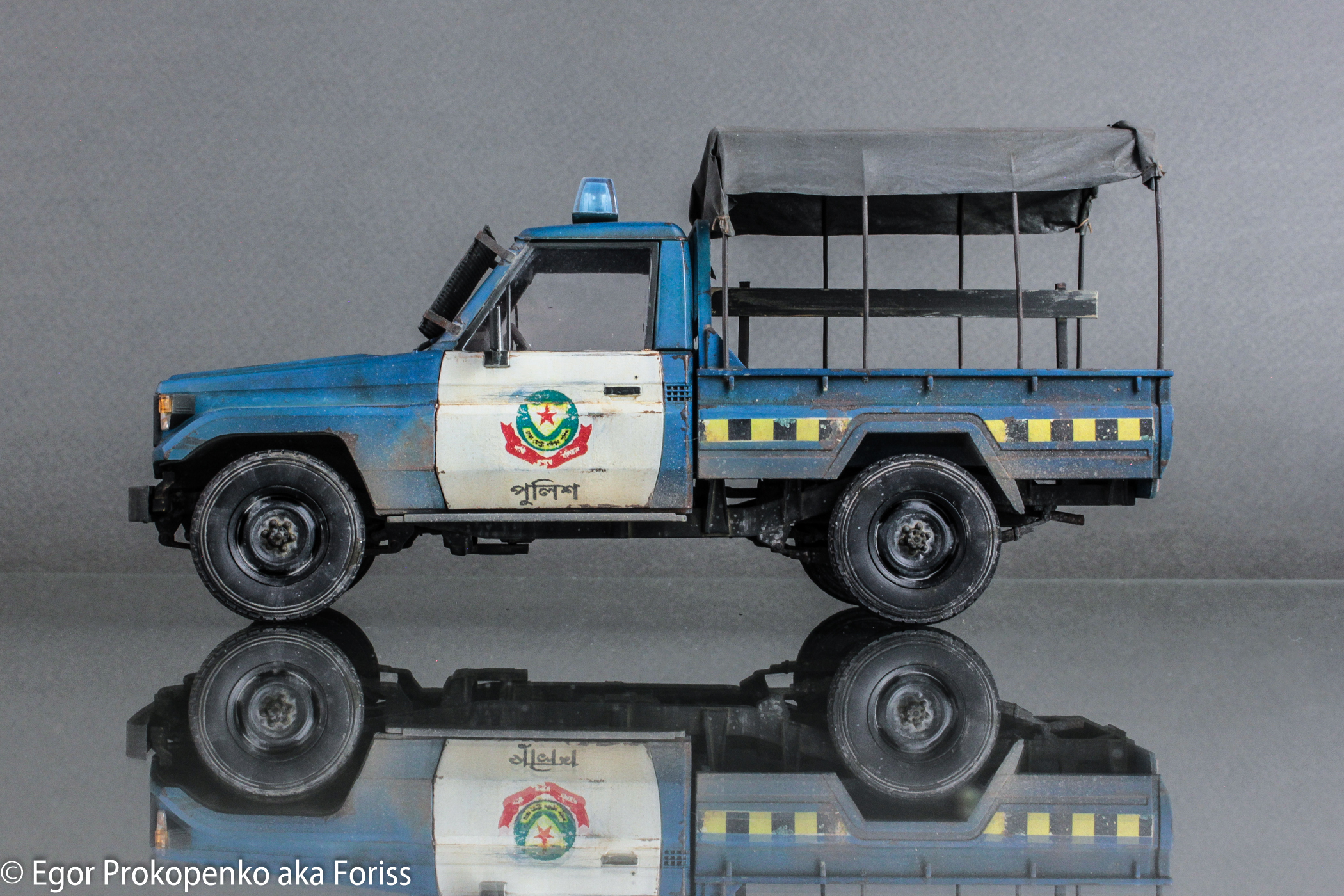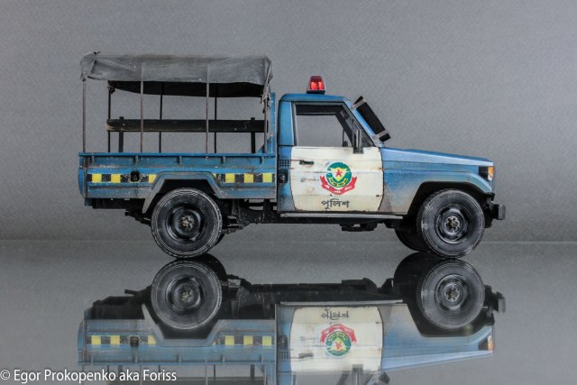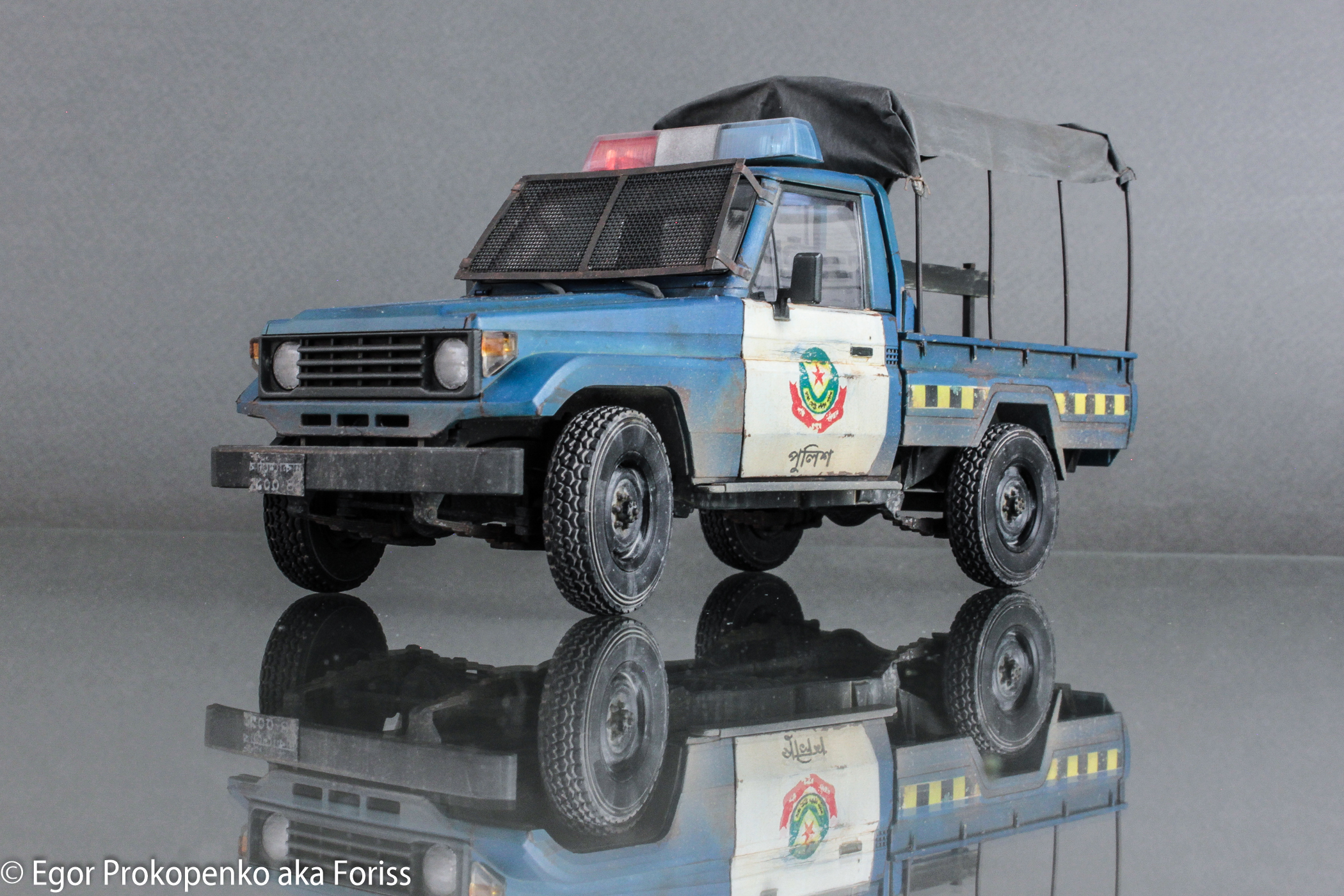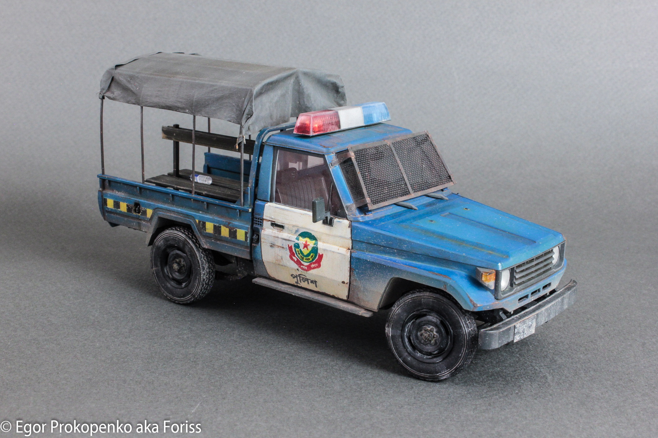 Дошли руки отснять работу, которую завершил еще в августе текущего года, и которая уже успела побывать на выставке «Кузница Победы 2019» в г. Новокузнецке в сентябре, где взяла 1 место в соответствующей номинации – это Тойота Ленд Крузер, автомобиль полиции Народной Республики Бангладеш.