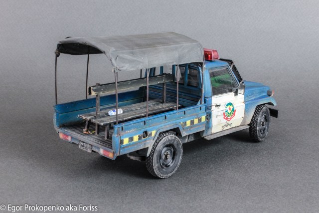 За основу был взят набор от Менг; наполнение кузова, лавка, тент, защита лобового стекла и прочее – самодел; доработанная до схожего состояния мигалка из модельных закромов.