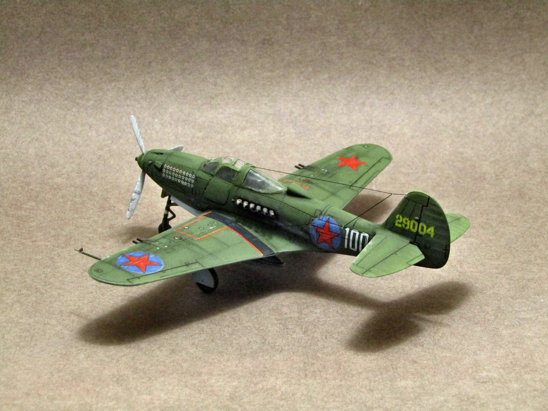 Приветствую уважаемые коллеги! Представляю Вашему вниманию попытку изобразить машину известного аса Великой Отечественной войны Александра Покрышкина. Из доработок: стволы из мед.игл, антенна из эластомерной нити, ремни на сидении хотя их и не видно, перекладинка в воздухозаборнике за фонарём, расточены выхлопные патрубки и добавлена фара из самоклеящихся страз. Декали заказывал у А.Бацких. Покраску осуществлял по серому Ганзовскому грунту 1500 Акановскими акрилами, смывка чёрной тамией, везеринг маслом и акварельными карандашами, матовое покрытие от revell. Маски нарезал сам. Вот собственно и всё по постройке, по синим полям за звёздами не уверен что сделал правильно, возможно они были и тёмно-зелёными. Приятного просмотра...