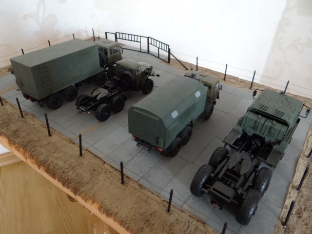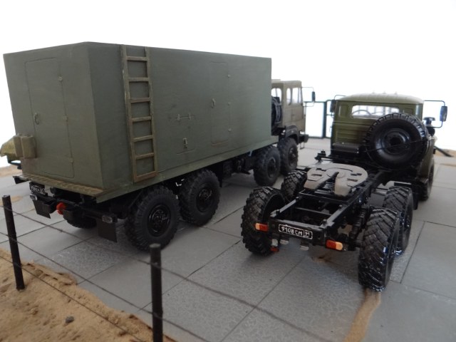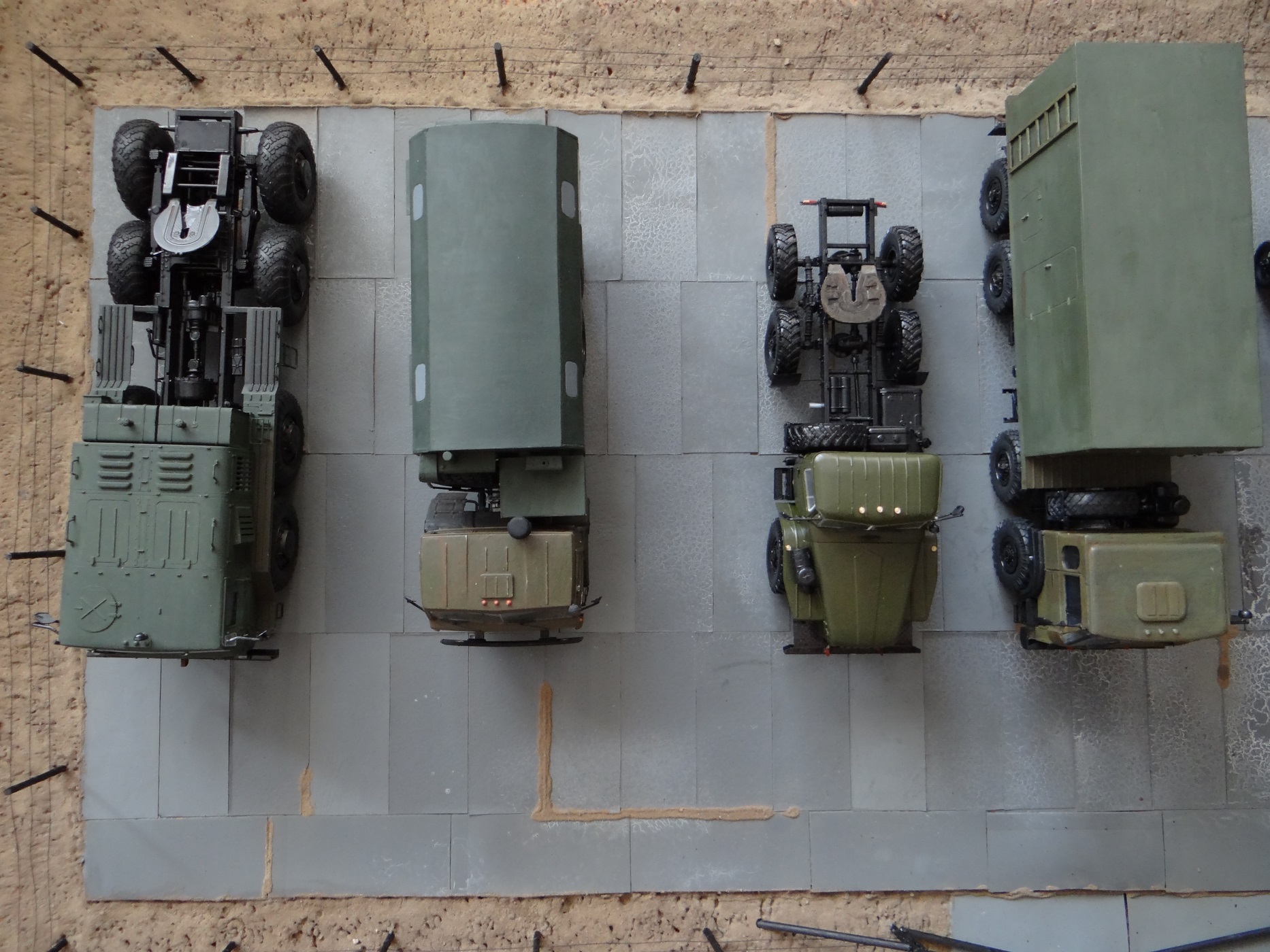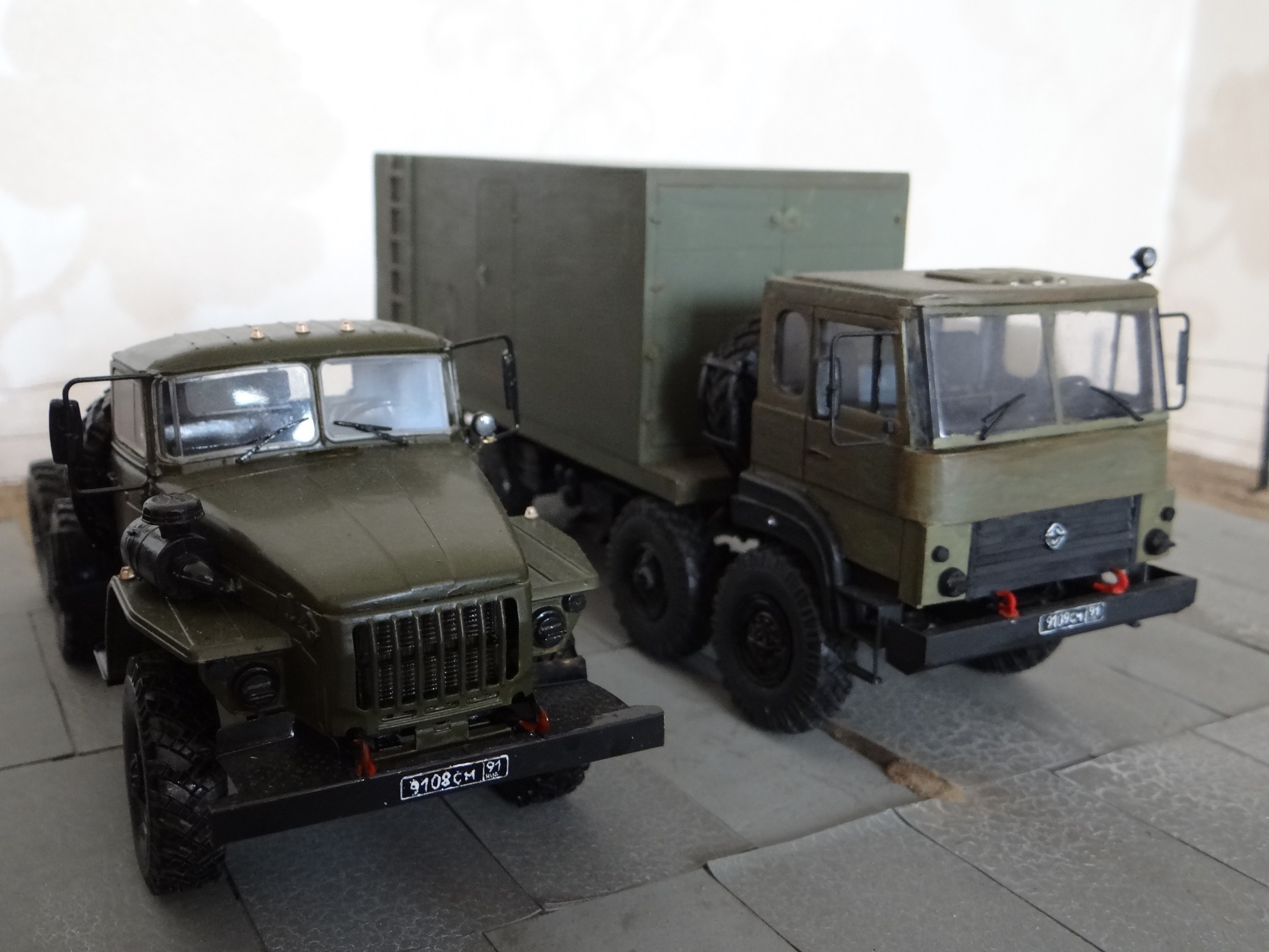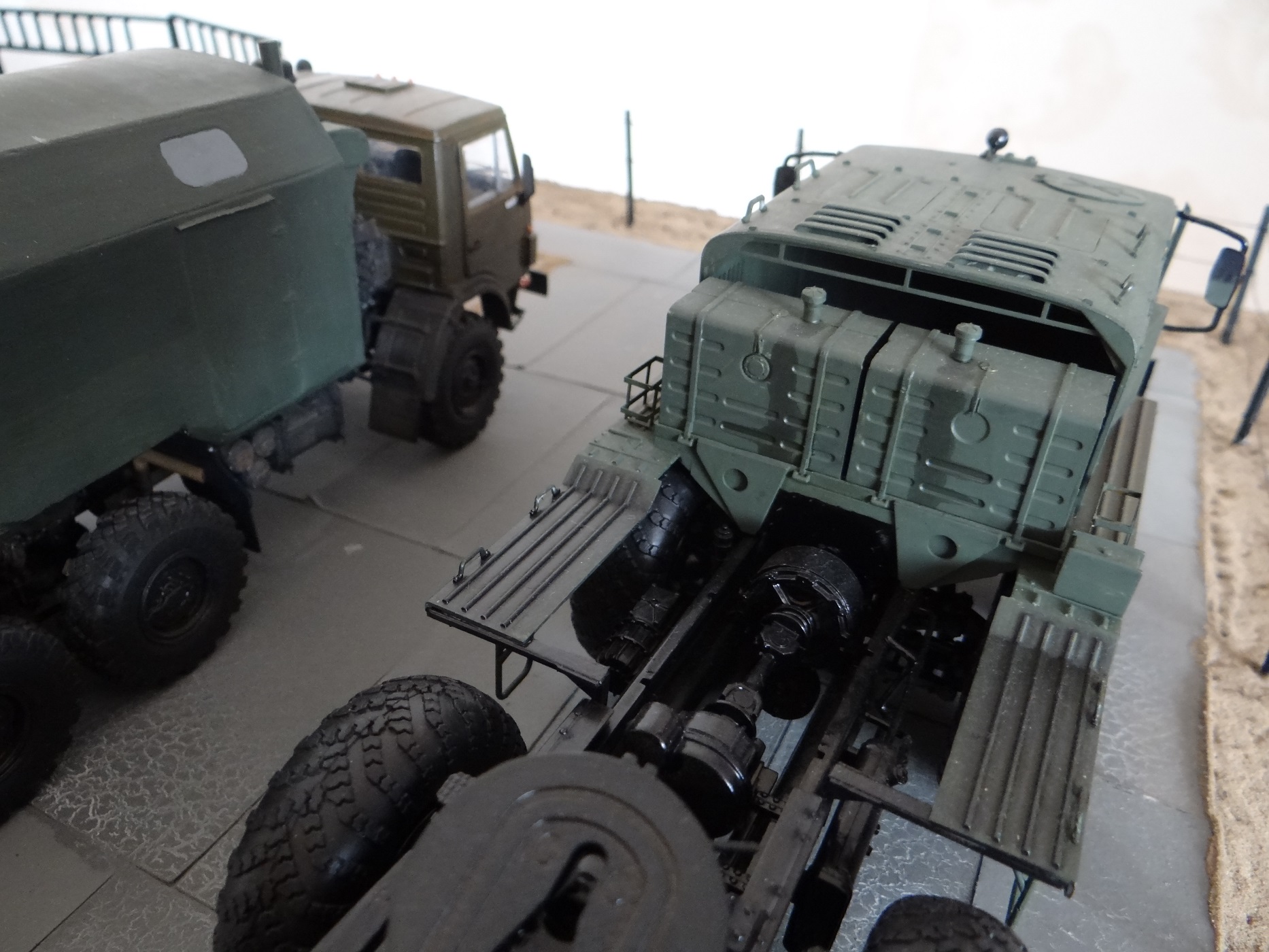 Приветсвую, моделисты! Представляю небольшую диораму стоянки автомобильной техники в 1/35 масштабе. МАЗ-537 – трумпетер без доработок, КАМАЗ-43101 – ICM, фототравление – микродизайн, кунг – самодел, тамиевский пластик + картон, седельный тягач Урал-44202 переделан из модели от звезды, само седельное устройство – самодел из пробки от бутылки, колеса смола. И самое главное – четырехосный тягач Урал-532361, шасси – глубокая модернизация урала звездовского, удлинил раму, поставил дополнительный мост, сделал новое рулевое управление на две передние оси, кабина полностью самодел, пластик и картон, ну и сам кузов тоже пластик от тамии. Пропорции и размеры соблюдены. Один комплект фототравления от микродизайна на две машины) Основание – пенопласт, плиты – картон, забор – остатки литников и нить. Покраска акрилом Тамия, аркан. Смывка - тамия, пигменты - мастерпигмент. Есть небольшие недоделки и неточности! По покраске сам прогнозирую оценку не выше удовлетворительно, красил все кистью, без применения аэрографа.