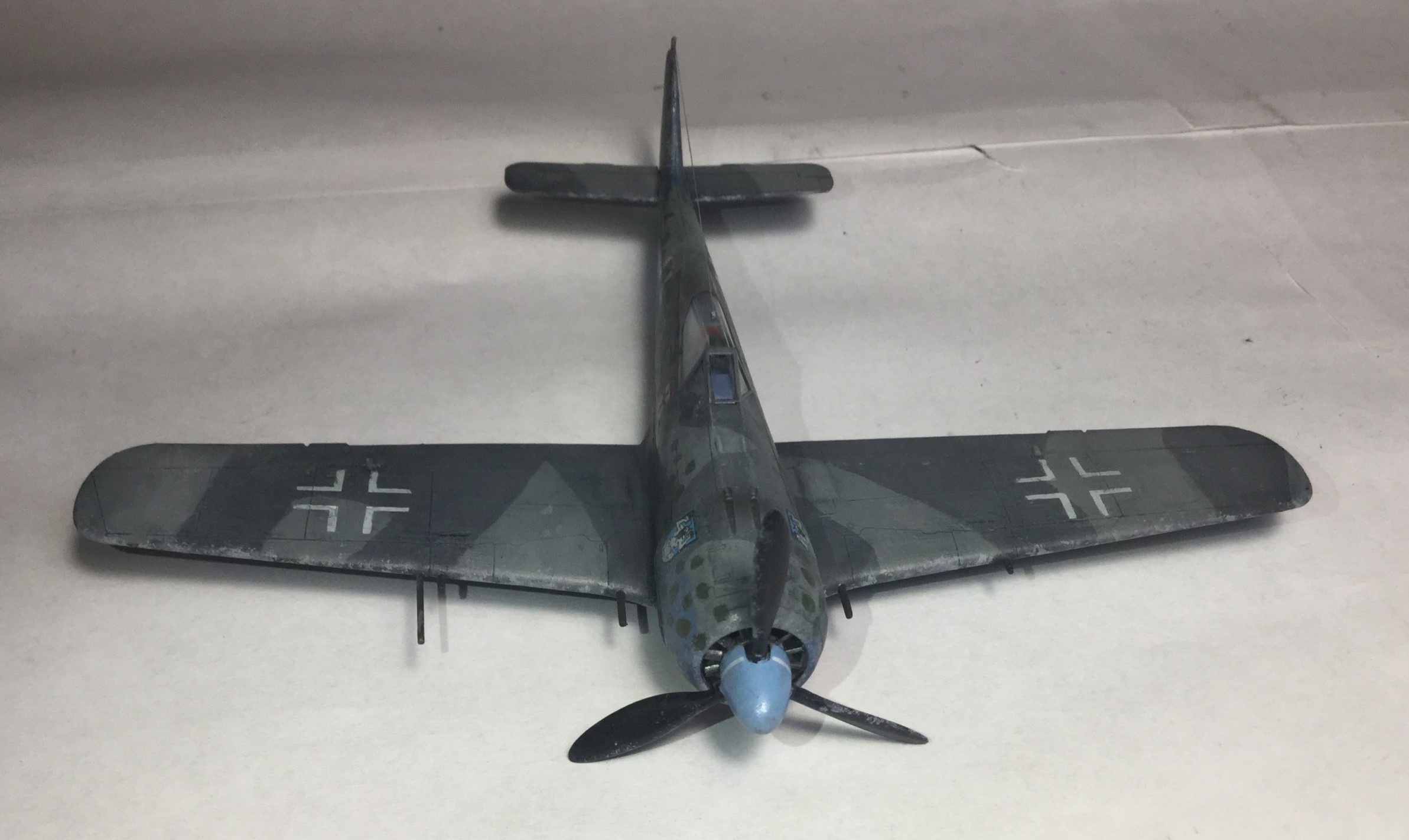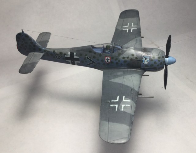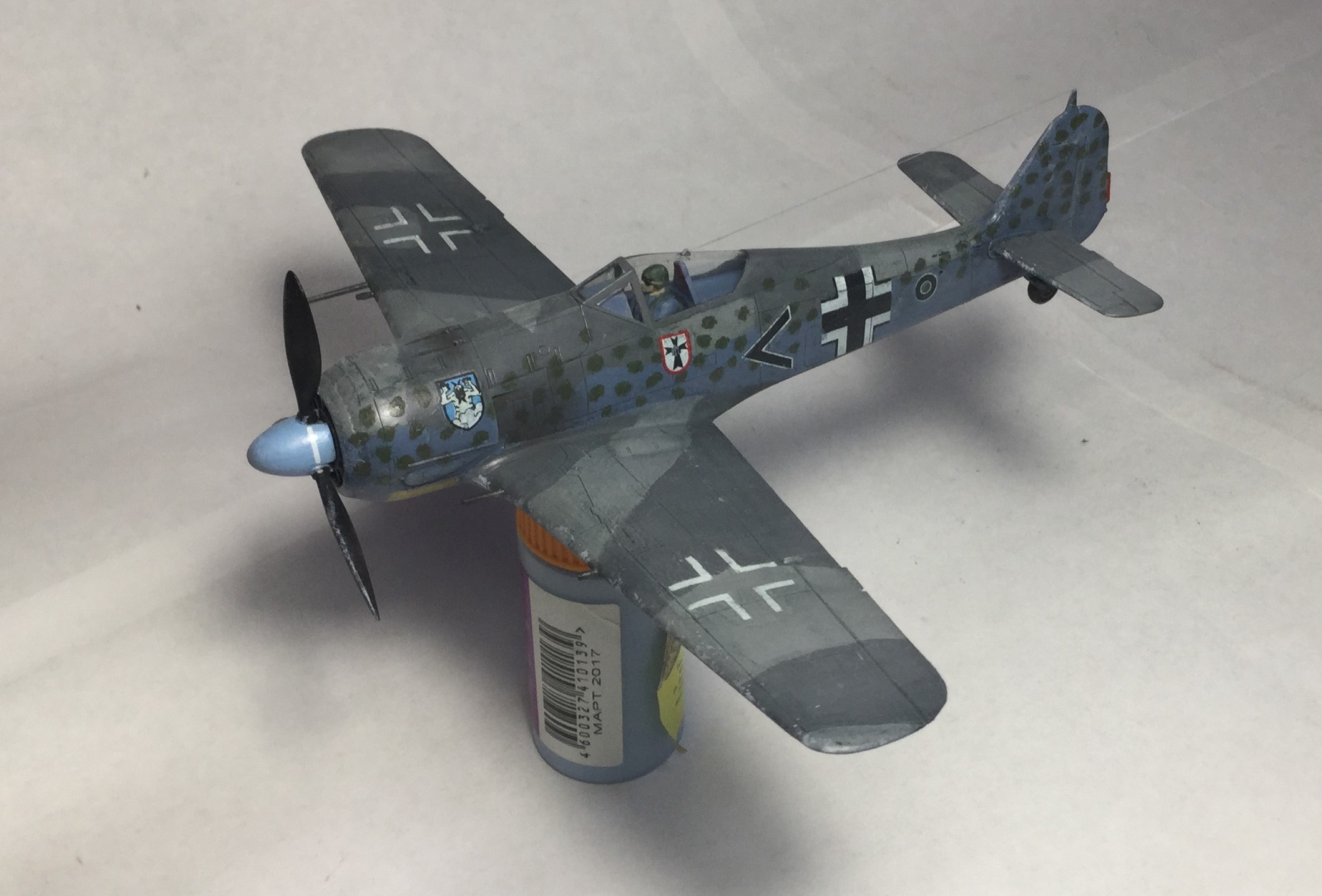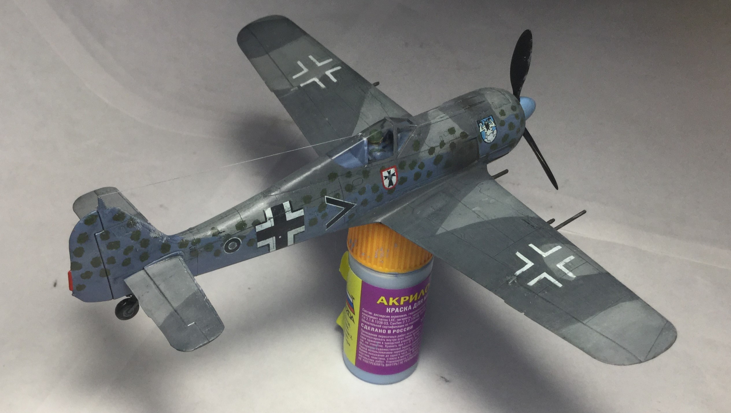 Всем доброго дня. Сделал модель Фокке Вульфа 190 от Звезды. Качество хорошее, кое где были небольшие щели, но нестрашные. Красил звездой, а лак разбавлял, хотя разводы чуть- чуть остались. Смывка самодельная, получилась очень хорошая. Пигменты Wilder. Камуфляж сделал с точками, и они получились не ровные, красил кисточкой. Собирал из коробки, только антенна из бисерной нити.