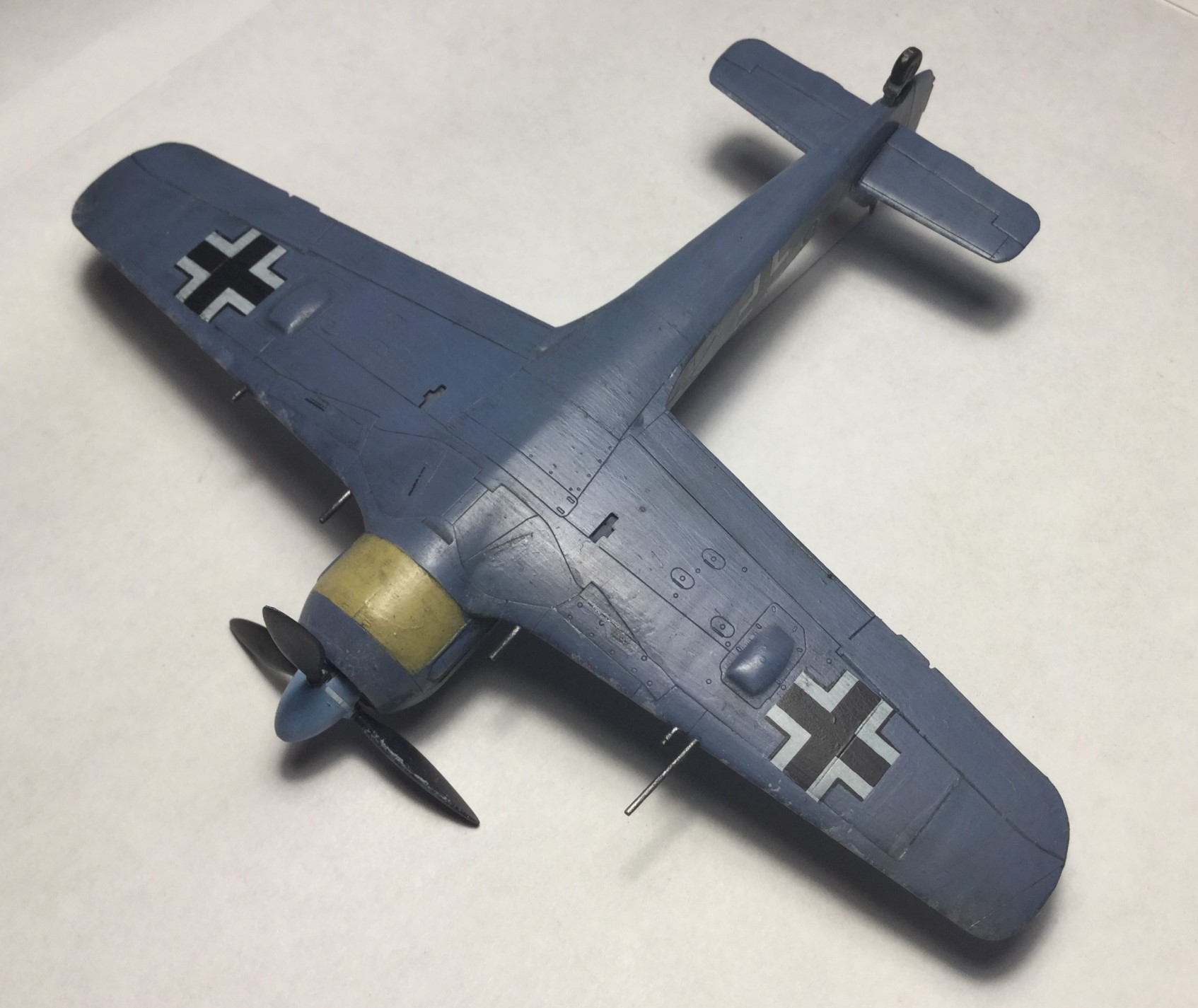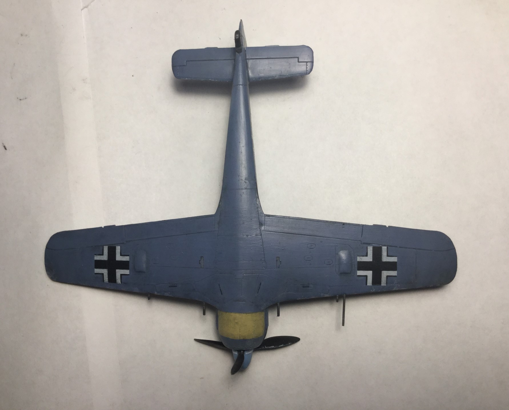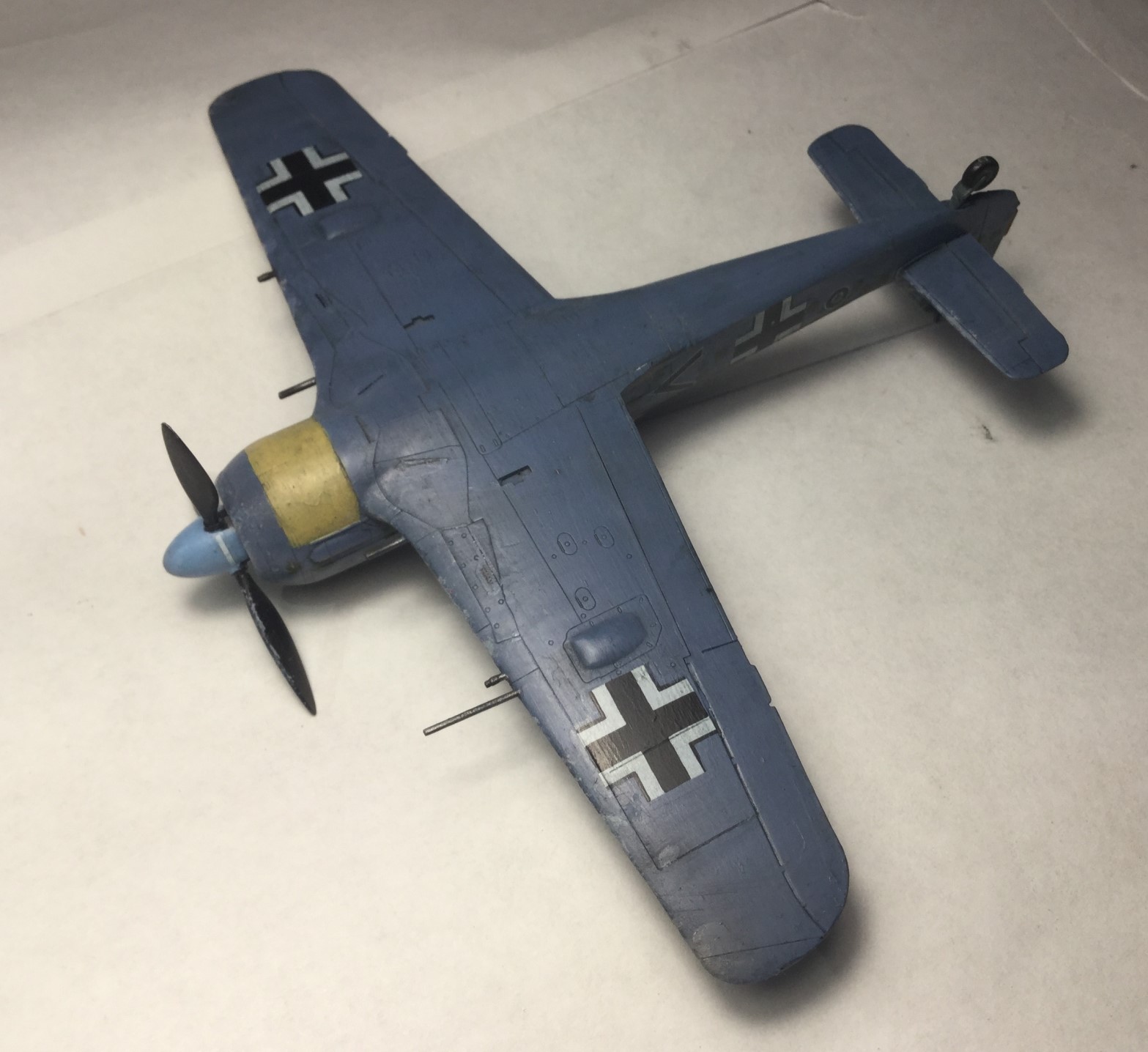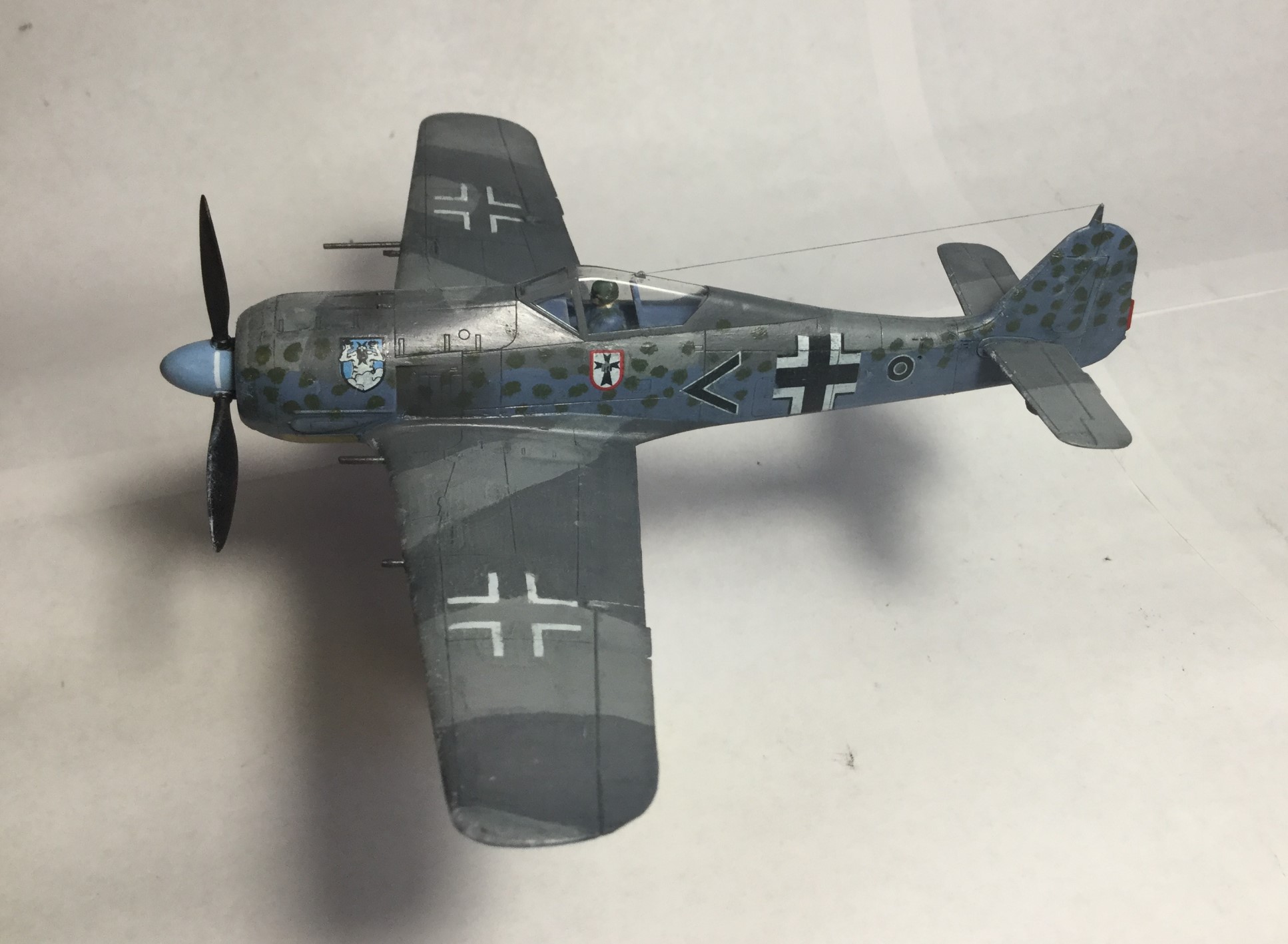 Всем доброго дня. Сделал модель Фокке Вульфа 190 от Звезды. Качество хорошее, кое где были небольшие щели, но нестрашные. Красил звездой, а лак разбавлял, хотя разводы чуть- чуть остались. Смывка самодельная, получилась очень хорошая. Пигменты Wilder. Камуфляж сделал с точками, и они получились не ровные, красил кисточкой. Собирал из коробки, только антенна из бисерной нити.