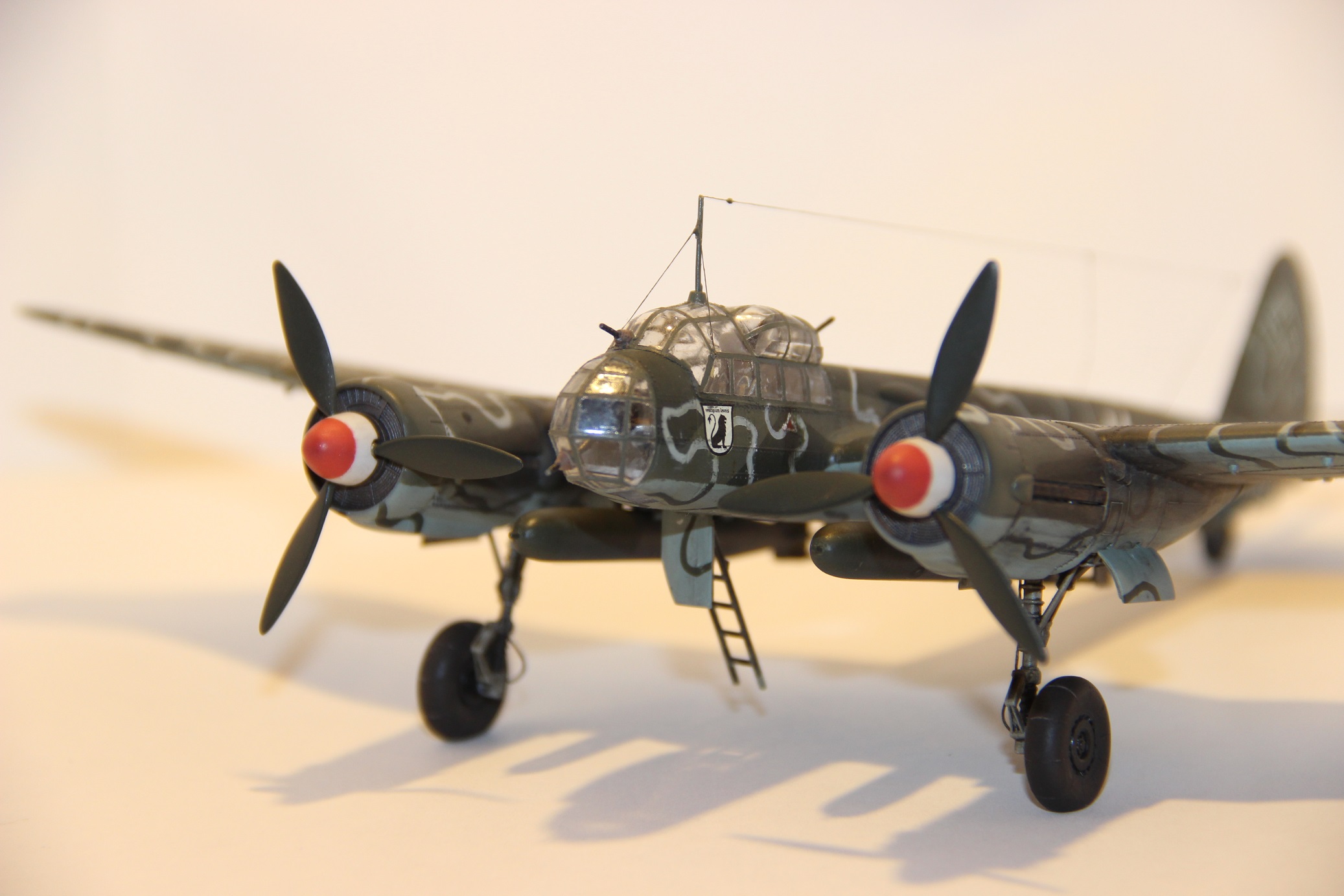 Красил акрилами Tamiya и Mr.Hobby. Камуфляж стандартный RLM70/71/65, змейки накрашивал через трафареты из маскировочной ленты RLM76/70. Символы и кресты на нижних плоскостях крыльев и бортах задувал также через трафареты, на верхних плоскостях и для свастики использовал набор декалей для Ju-88.