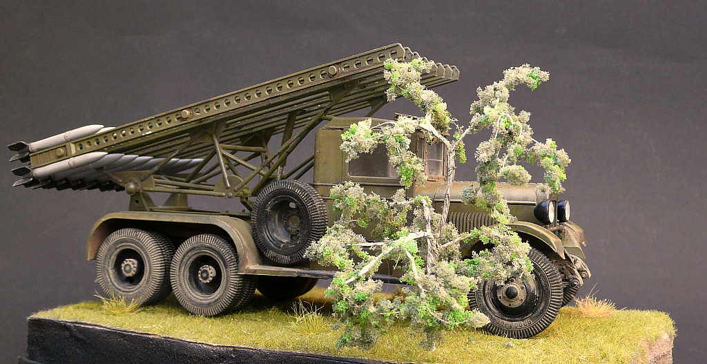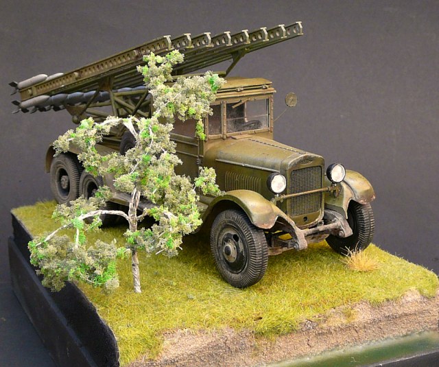 -Модель решил разместить на виньетке,что бы не так было скучно Катюше,основание из пеноплекса,дерево из проволоки,трава(синтетика флок)
