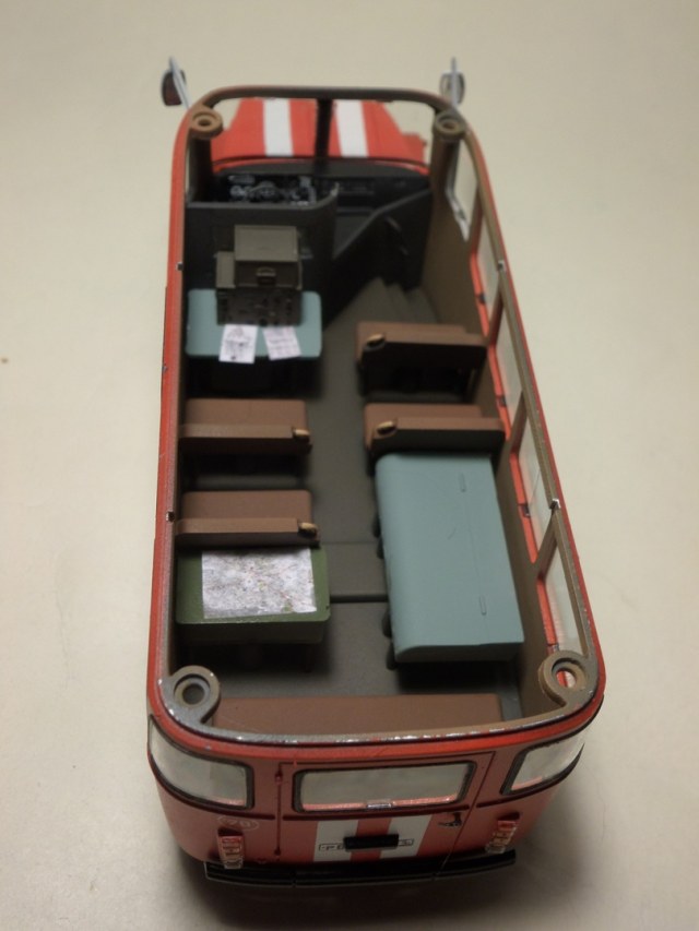 Сборка без проблем, все из коробки, только добавлены мелочи по интерьеру: столы, радиоборорудование, ящики с имуществом. Для удобства просмотра крыша съемная.