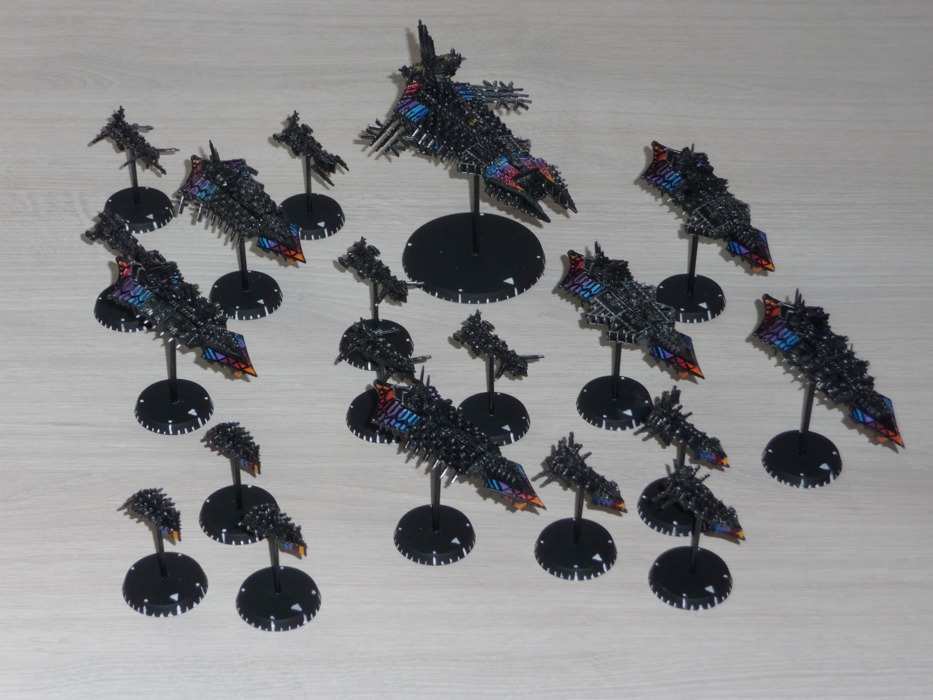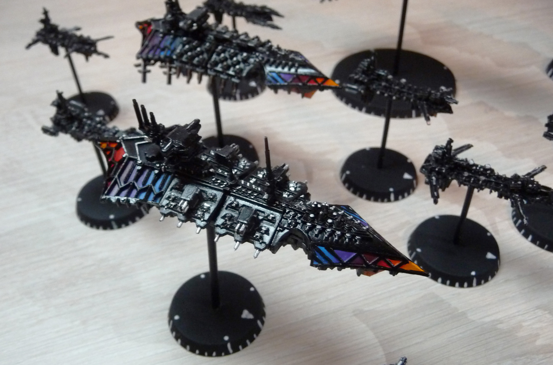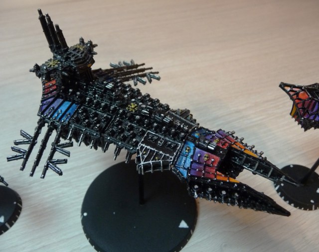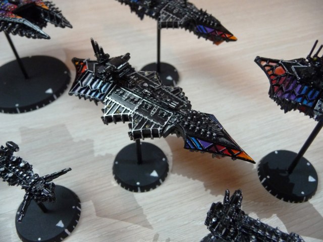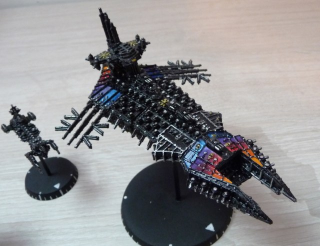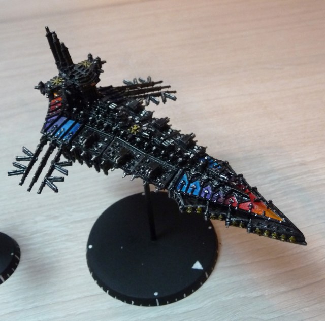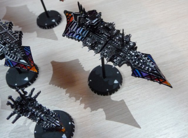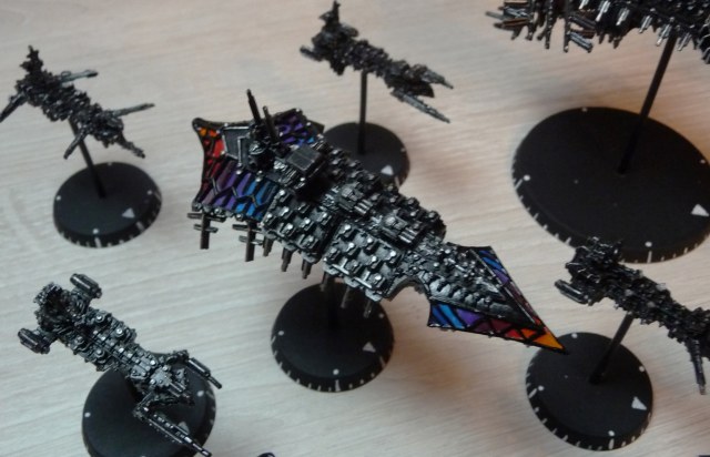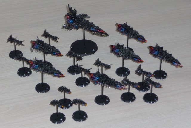 Флот Хаоса - 1 линкор, 6 крейсеров, 12 эскортов. Линкор и крейсеры модульные, на магнитах - можно собрать практически любую модель корабля хаоса из BFG.
