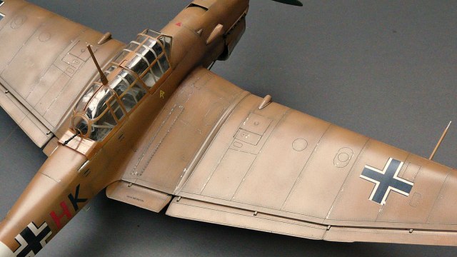 Ну как бы нет. я бы использовал термин "Не провальная". Впечатление двойственное: человек действительно старался сделать хорошо, но при этом как то не думал, что творит: если бомбу, (точнее бомбы), можно списать на естественное желание всех моделистов обвешать модель оружием как новогоднюю ёлку игрушками, то излишний глянец уже наводит на мысль, что автор реально не заморачивайся построить простейшую логическую цепочку: пустыня-песок-абразив-пропеллер-ветер от винта-с чего бы глянцу взяться? И как следствие, отсутствия логики, жуткий результат по rlm 79 в стиле известной фразы из первого крепкого орешка " у них там есть учебник по борьбе с террористами вот они сейчас...... "