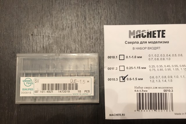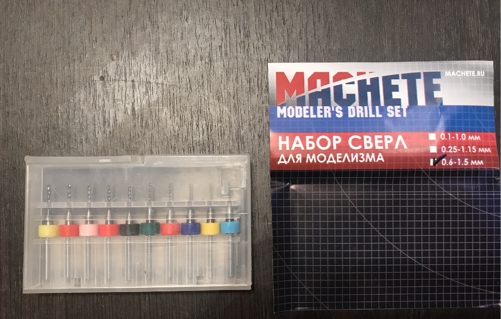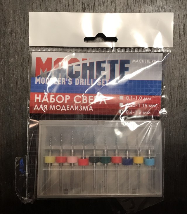 Еще один очень нужный девайс в нашем модельном деле-Микродрель ручная от фирмы MACHETE. Простая но необходимая вещича для моделистов. Не у всех есть возможность приобрести электрический инструмент, вот хорошее подспорье, недорогое и сверлит отлично. Корпус металлический, имеет насечки выштамповки для предотвращения выскальзывания из рук. Внутри корпуса дрели имеется еще один зажим для сверл. Диаметр подходящих сверл от 0.3- 3.2 мм. Сверла я тоже взял от фирмы MACHETE. Сделаны в Японии, очень острые, сверлят отлично, в наборе 10 сверл от 0,6 до 1,5 мм. Помимо этих фирма MACHETE выпускает еще 2 набора сверл, других диаметров. Сверла упакованы в пластиковый кейс, удобно открывается и имеет отличный доступ к сверлам, в общем рекомендую!