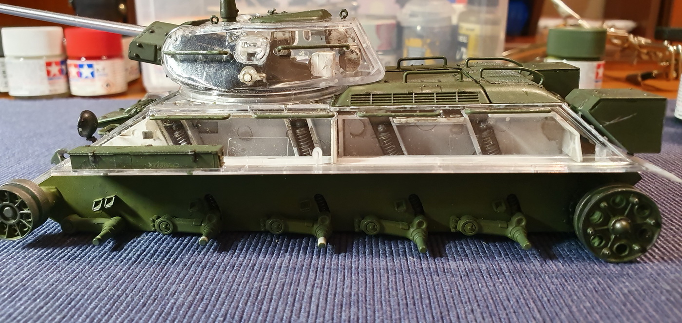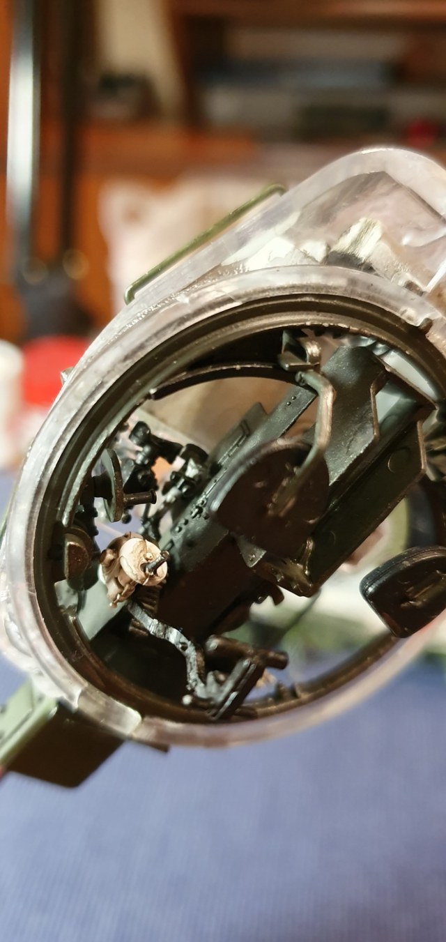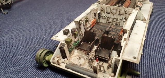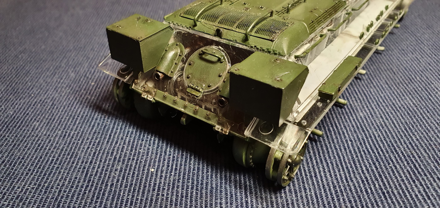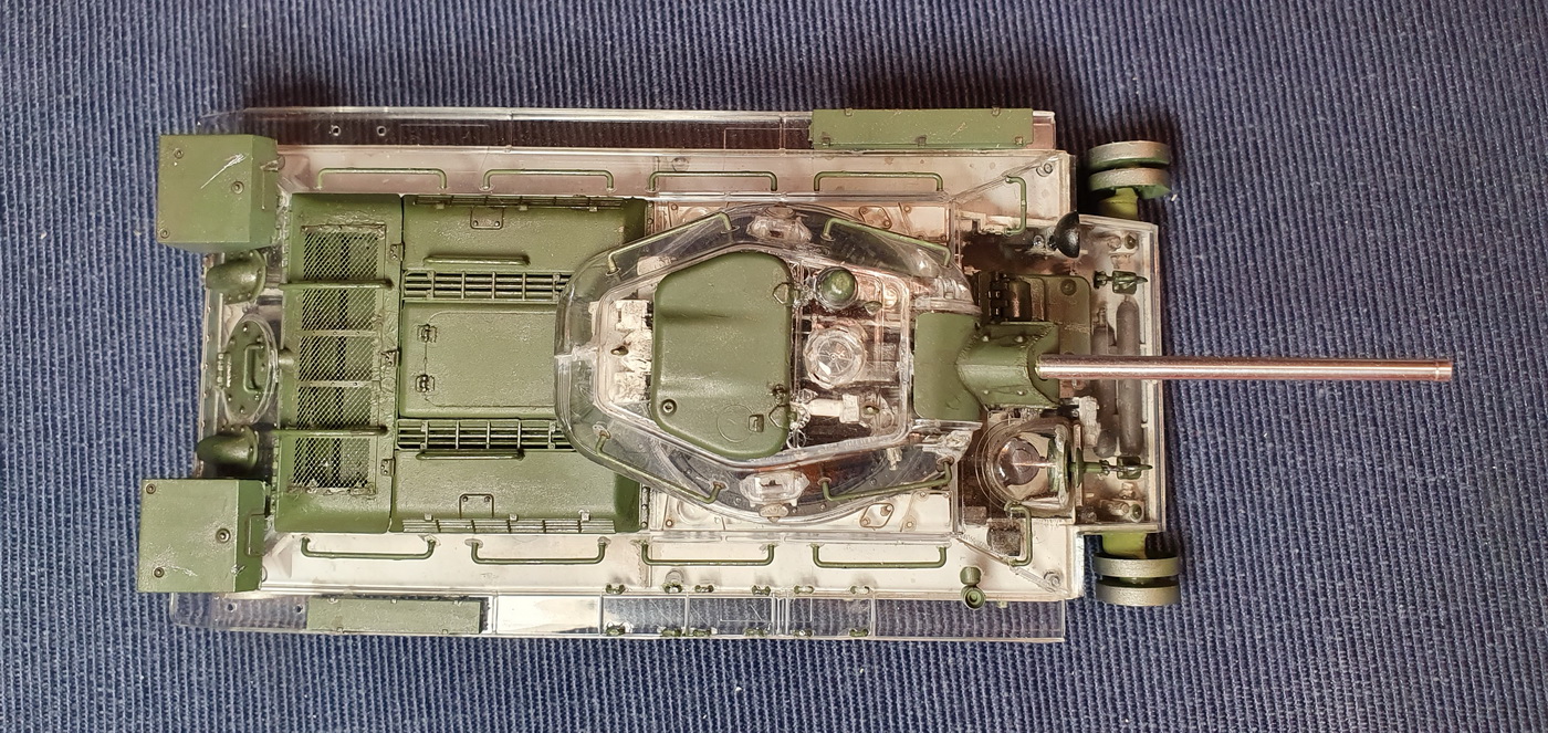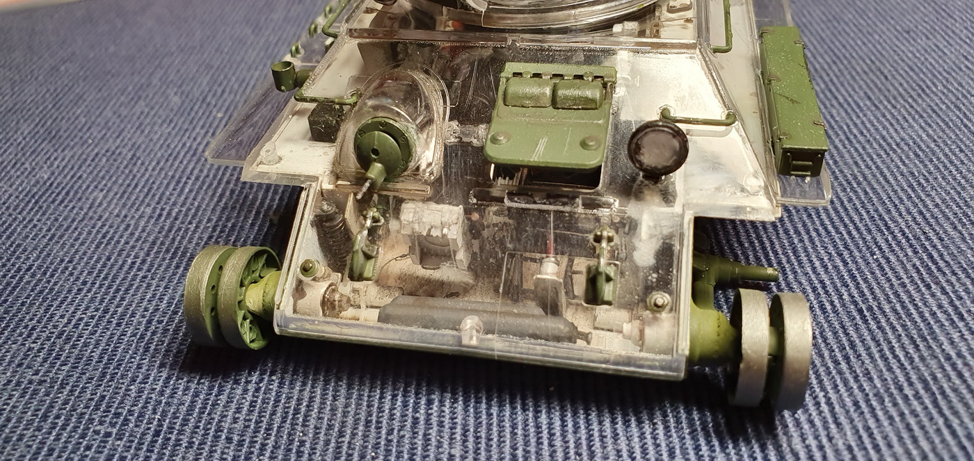 Складывается устойчивое впечатление, что красите кистью. На нутрянке это не заметно, но на внешних элементах бросается в глаза. Не торопитесь и работайте аккуратнее. Все следы от толкателей, особенно видимые надо обязательно зашпатлевать. На фото башни снизу на сиденьях это прям колет глаз. То же самое на ведущих колесах. Где следы от толкателей на прозрачных элементах - либо закрашивать эти места - либо думать, как замаскировать. Все это портит впечатление от работы. Тем более, что сама модель не простая, да и не дешевая.