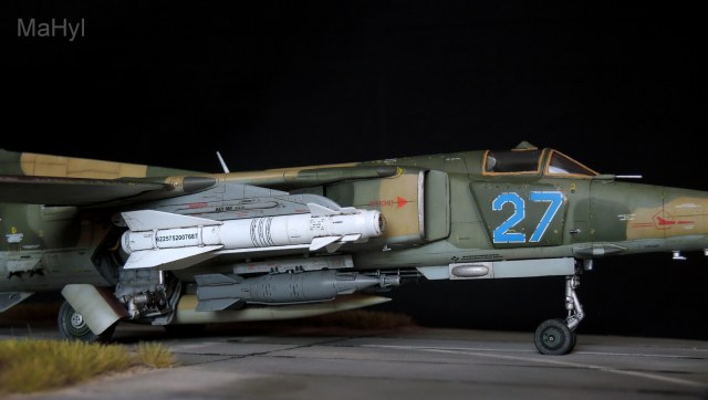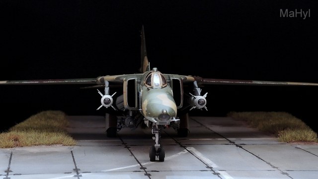 Пришлось делать отдельный эскиз камуфляжного рисунка на самолет, из-за отсутствия хоть какого-то единого рисунка на самолеты данного типа. Привязку к реальной машине не делал по определенным причинам, хотя камуфляж частично базируется на расцветке одной реальной машины из 16-ой воздушной армии. Красил и модулировал цвета Tamiya и Gunze, смывка, фильтры, масляные точки, подтеки, сколы. Декалей на этот самолет, в принципе не существует, поэтому использовал деки и из набора, и Бегемота, и от других наборов.