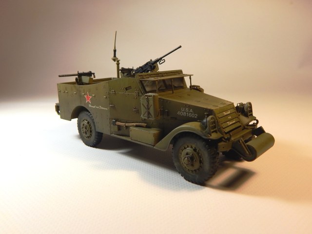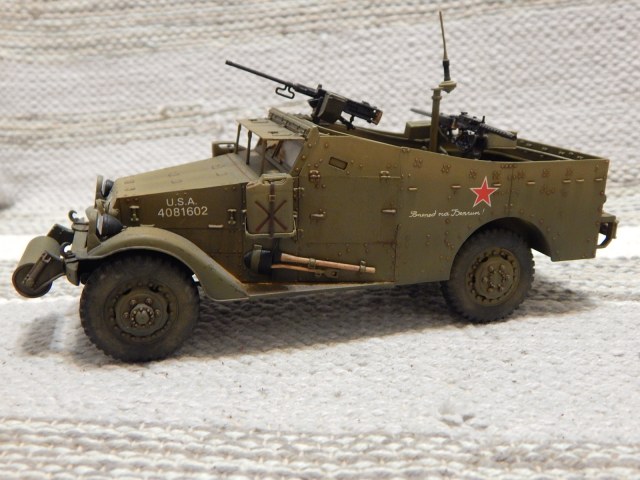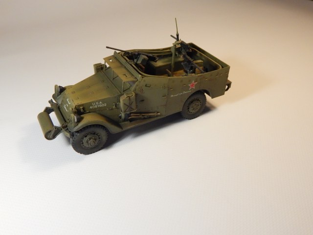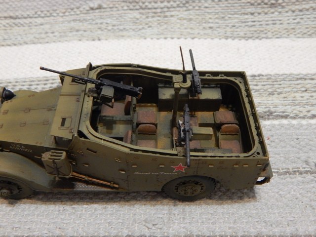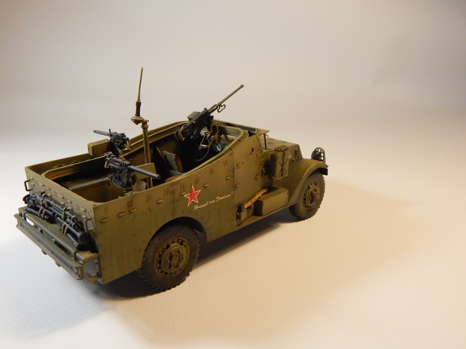 Неплохо получилось. Набор приятный. Но надо и голову, все-таки включать - опять сделана стойка с антенной, но нет радиостанции - зачем ее клеить? Это не автомобиль, в БТР - так, что что в "бронетехнику". Штатно "Скауты" запаской не комплектовались. Иногда на советские машины ее заначивали, но не всегда. Валик спереди - это подпружиненный барабан для преодоления препятствий. Из ошибок - зачем черные фары и "кожаная" обивка сидений. Брезент там был.Не надо было три пулемета "втыкать", их всегда два ставили - 30-тку и 50-тку.
