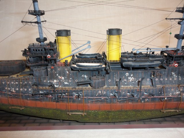 Спасибо за отзыв!!! По поводу ржавчины:потеки с палубы от стоек лееров,по борту корабля от сколов краски и различных "закоулков" где скапливается вода, а потом стекает, над ватерлинией в стыках между бронелистами, ниже ватерлинии также, но более темная ржавчина. Про водоросли, переход был долгим и по тропическим морям))). Опять же руководствовался фотографиями реальных кораблей.Глядя на них получается резкая граница))