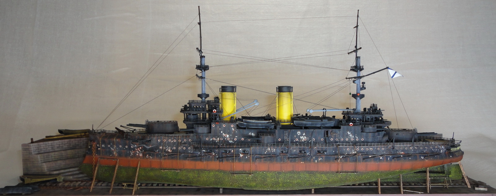 Во время постройки модели использовал опыт других моделистов с различных форумов, книгу с чертежами В.Ю. Грибовского « Эскадренные броненосцы типа «Бородино», а так же фотографии ремонта кораблей в доке.