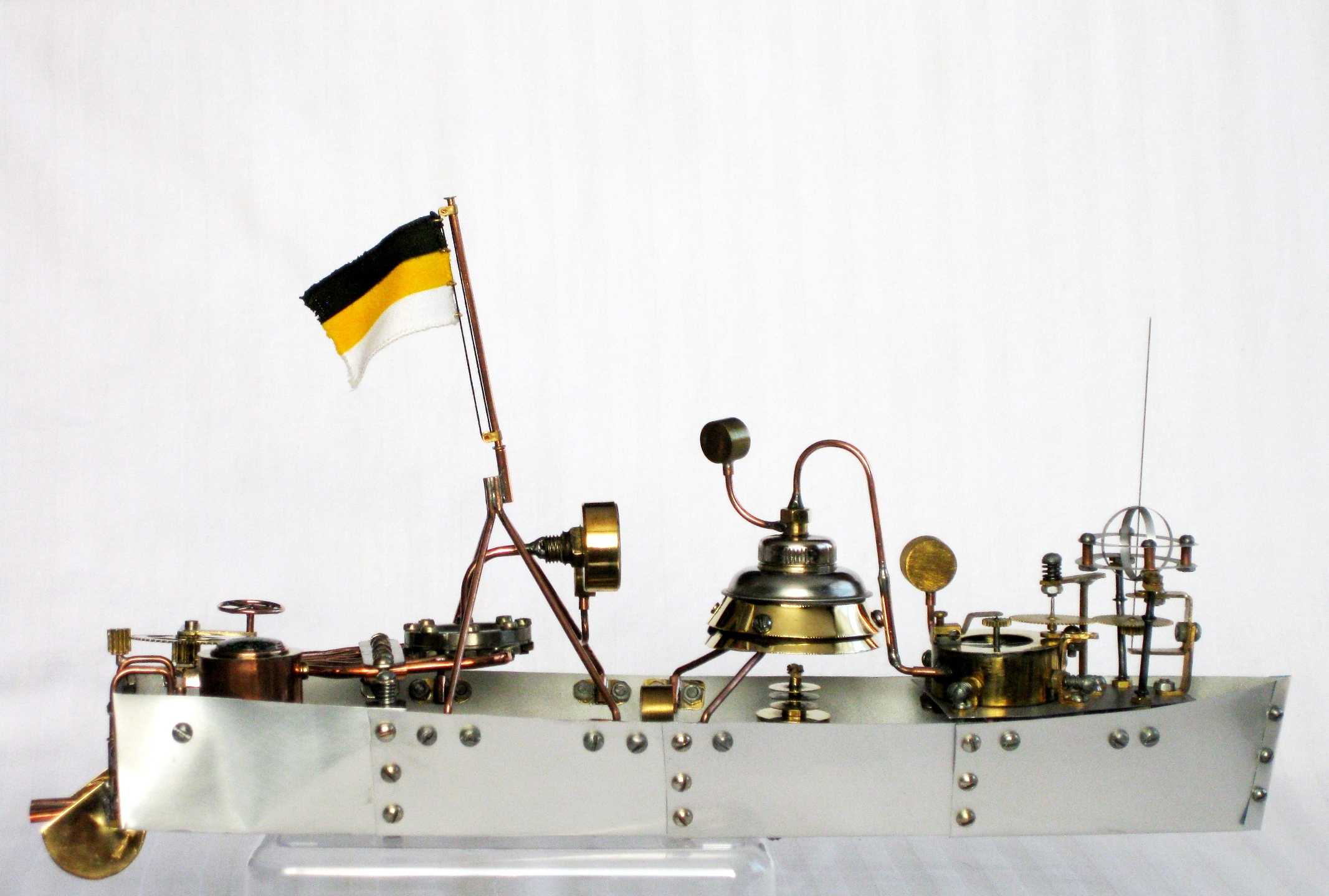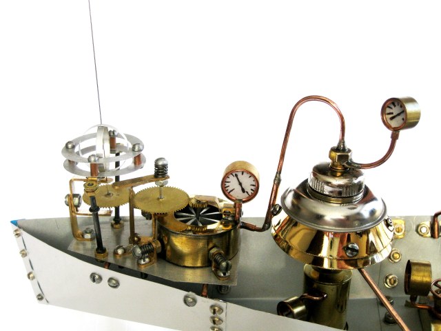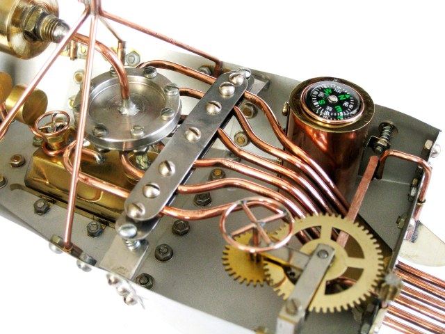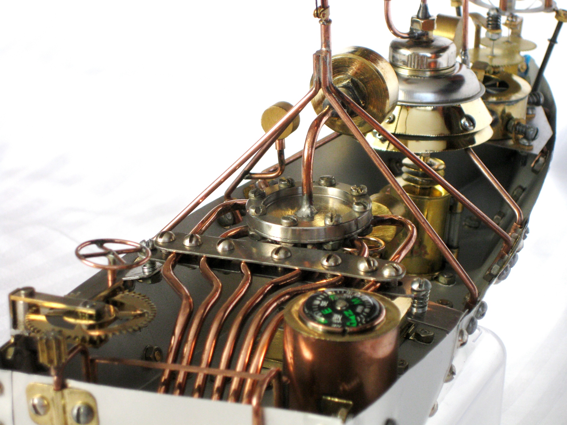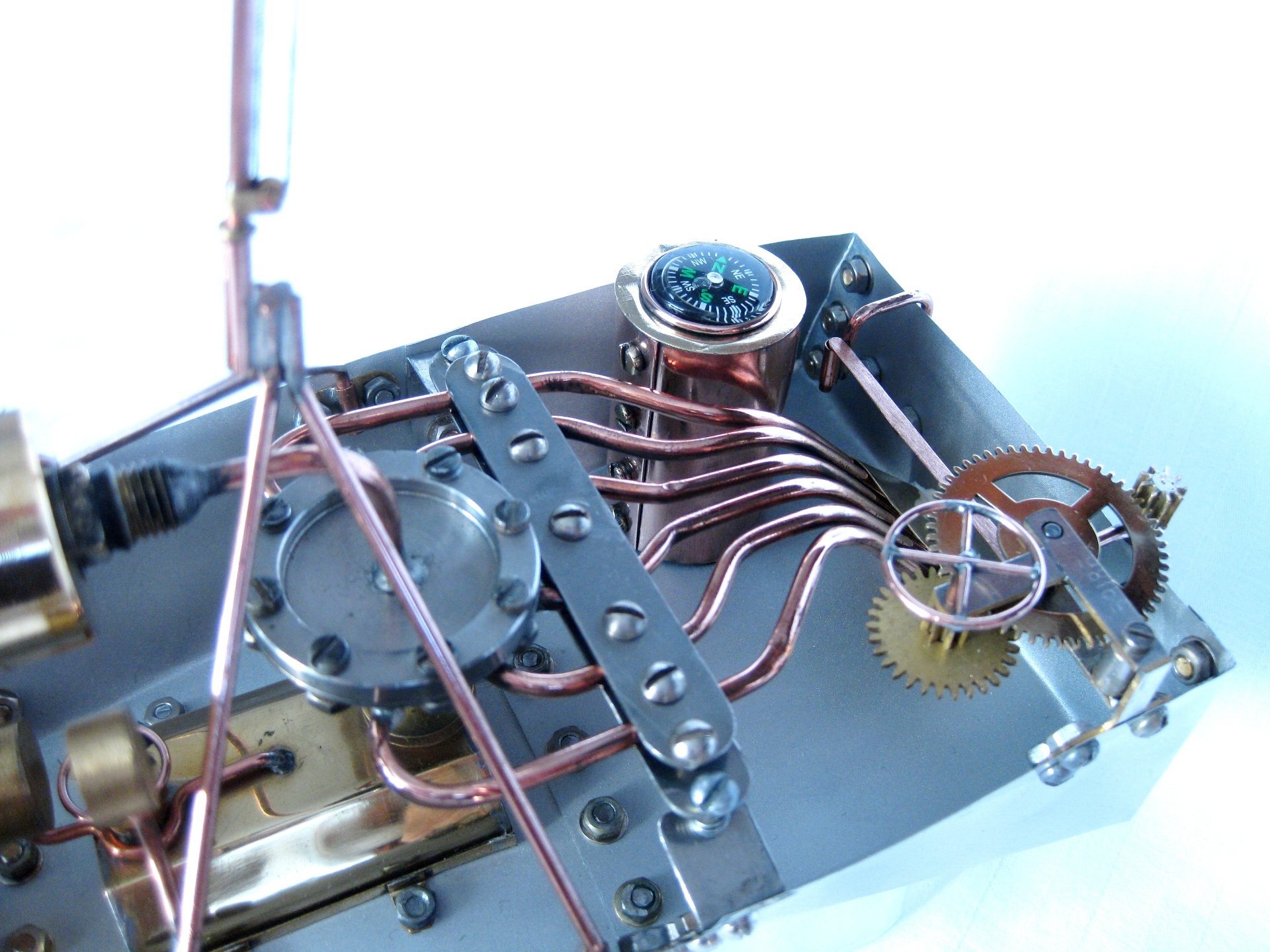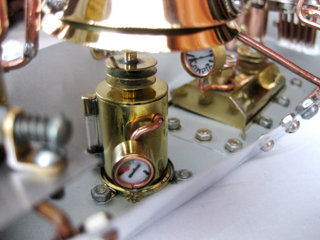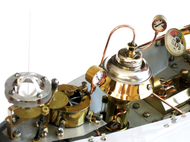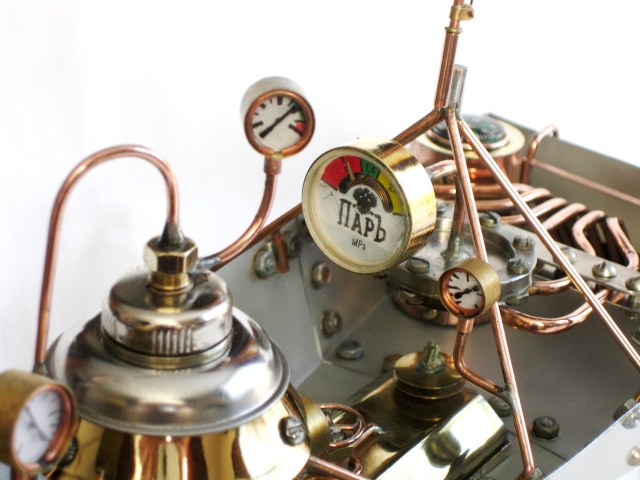 Ну и естественно, с большим удовольствием поковырялся с латунью и медью, трубочками и гаечками, пружинками и конечно -пайкой. Постарался сделать все максимально функциональным и работоспособным. Из бутафории, только манометры ( один, центральный- большой, действующий, ему, как оказалось, мало давления для проворота стрелки)), все остальное действует-работает).