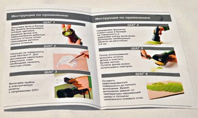 Упакован флокатор достаточно цивильно в коробочке с поролоном. Имеется инструкция на русском языке, но и так без инструкции всё понятно. Клей наносится кисточкой и хорошо отмывается ацетоном /рекомендация производителя/. На запах и цвет/бесцветный, прозрачный/ клей напоминает совдеповский лак для дерева. Работать флокатором очень просто. Смазываешь участок клеем, который после высыхания не видно. Сдаётся мне, что его можно при желании подкрасить в цвет почвы, к примеру. Затем как в рекламной песенке: ты тряси, тряси смартфон, высыпаешь на участок с клеем, пользуясь флоком различных оттенком, можно вперемешку, остатки сдуваются или стряхиваются для очередной порции заправки флокатора. Всё!!!