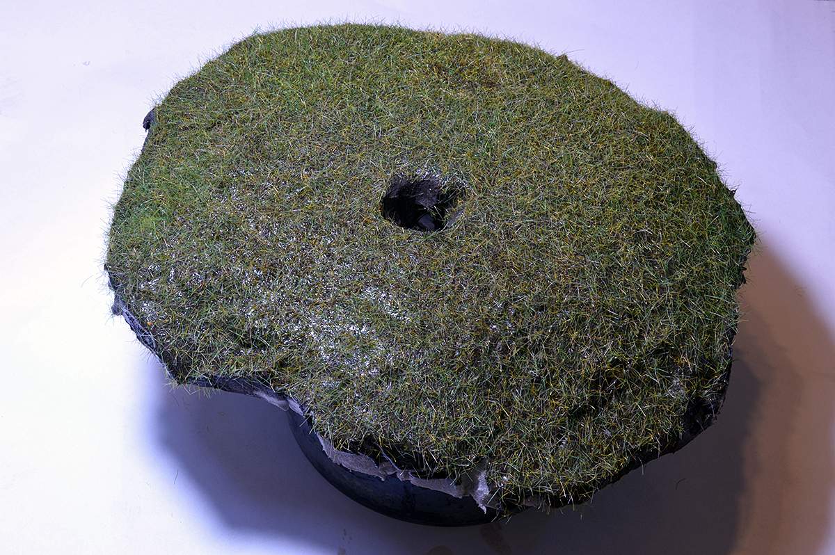 Кусочек поверхности с выращенной травкой разных сортов и высаженных на поверхности из затирки для швов...
