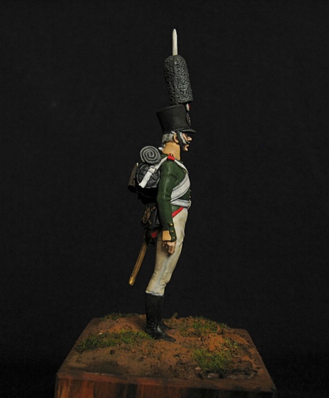 Здравствуйте. Вот такая работа. 54 мм, белый металл. Акрил, эмаль. Представлен гренадер гренадерской роты 1 батальона Азовского мушкетерского полка. К вопросу о шапках, в 1804 году, высочайше был утвержден данный образец, для гренадерских рот мушкетерских полков. Однако, какие полки, и в какие сроки получили данный головной убор, до сих пор неизвестно.