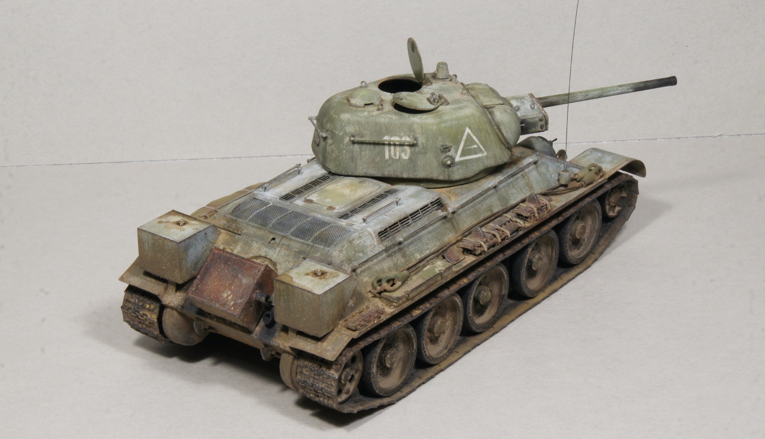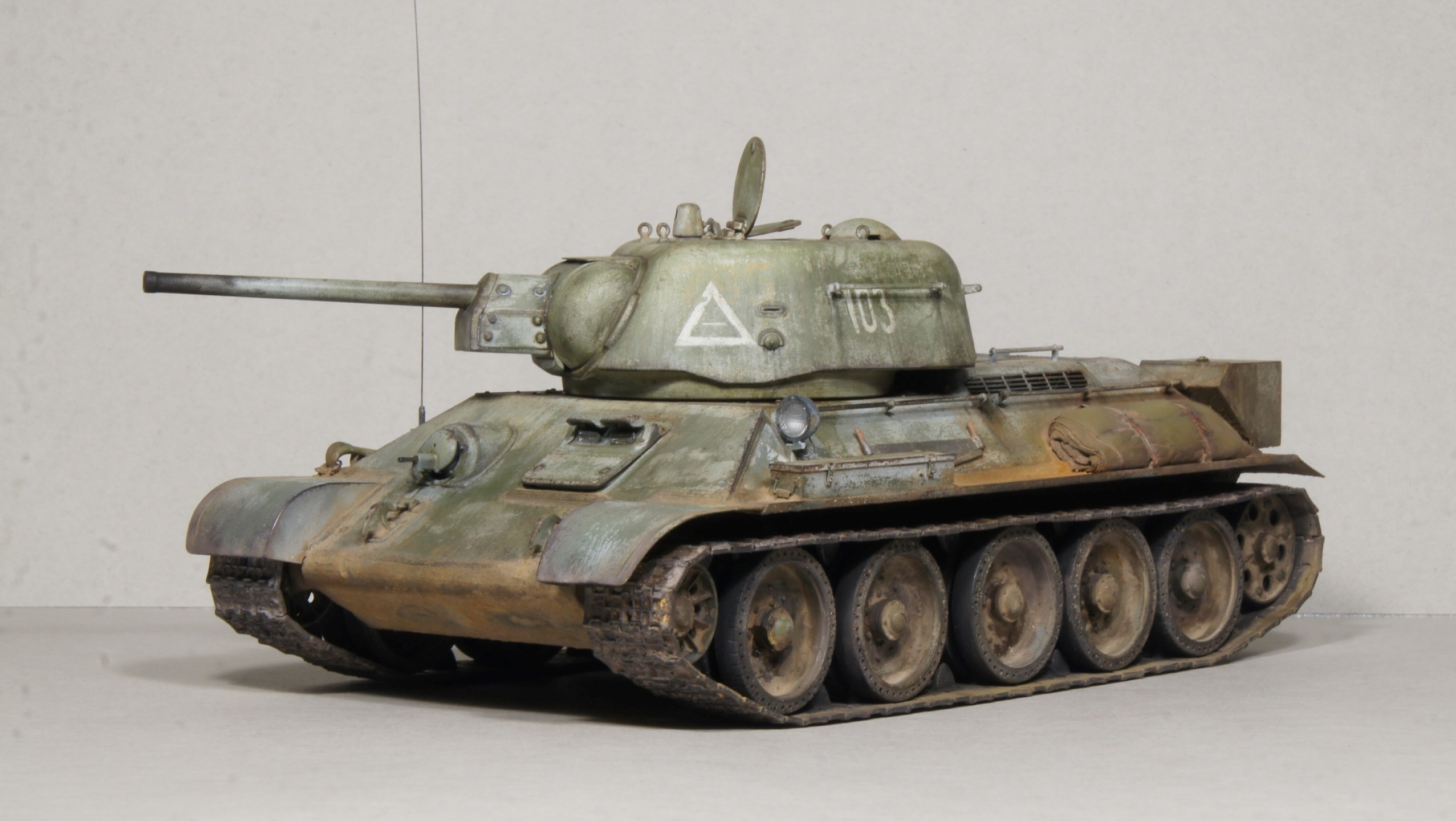 Приветствую друзья. Давно я здесь не появлялся. Решил, все-таки, поделиться с вами своей моделью Т-34/76 УЗТМ от ZVEZDA. Прообразом послужил танк из 85 отдельного танкового полка, Севастополь, апрель-май 1944 г. (как повествует подпись под картинкой), хотя полной идентичности и не добивался. Строил для души, ну и для закрепления некоторых навыков. Основой послужил новый набор от Звезды. Гусеничные ленты от MiniArt. Так и не получаются они у меня рабочими, рассыпаются после применения химии от AK и AmmoMig. Пришлось их собирать на клею. Фототравление и дополнения от Arma-models и Микродизайн. Плюс использовался трос от Микродизайн. Немного накосячил с креплением пилы, надобыло собирать все в месте, а не по отдельности, поэточу получилась небольшая щель. Скатку слепил из эпоксилина от "момента". Модель окрашивалась красками Ammo mig, AK-Interactive, Pasifiс88 и TAMIYA. Использовал белую смываемую краску от Arma-models. В принципе, работать с ней понравилось. Немного "затерся" желтый номер 705, надо было сделать поярче. Эффекты и пигменты также от Ammo mig, AK-Interactive и Wilder. В итоге что получилось, то получилось. Надеюсь в последствии доделаю к нему небольшую подставку. Приятного просмотра.