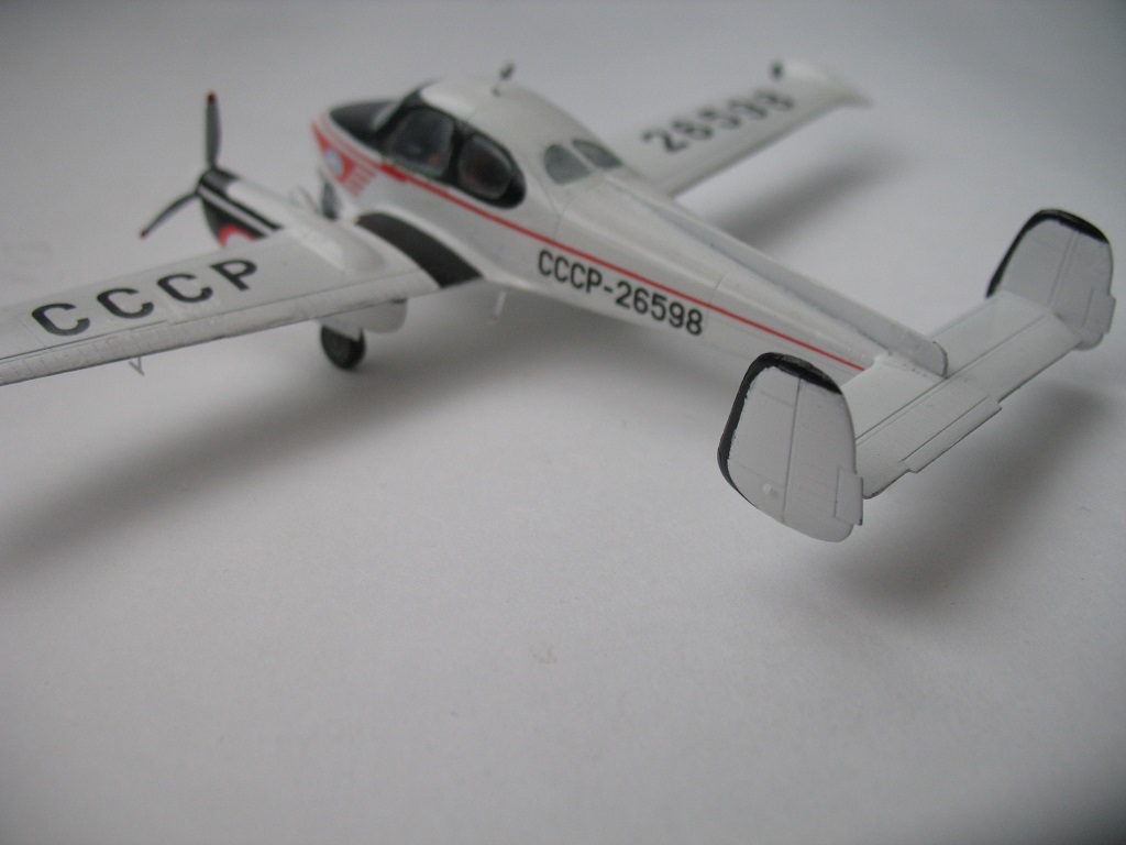 Ну а что ж вы его как неаккуратно покрасили-то, Александр? Ведь даже декаль заказную использовали... Обязательный минимум работ можно уж было и сделать. Красить модели желательно всё-таки напылением, а не кисточками. Антибликовая панель (да и всё остальное чёрное) блестит как начищенный сапог, т.е матовым лаком модель не припыляли. Стекла не самолёте совсем мало, чай не японец ВМВ с "теплицей" - можно уж было и постараться.