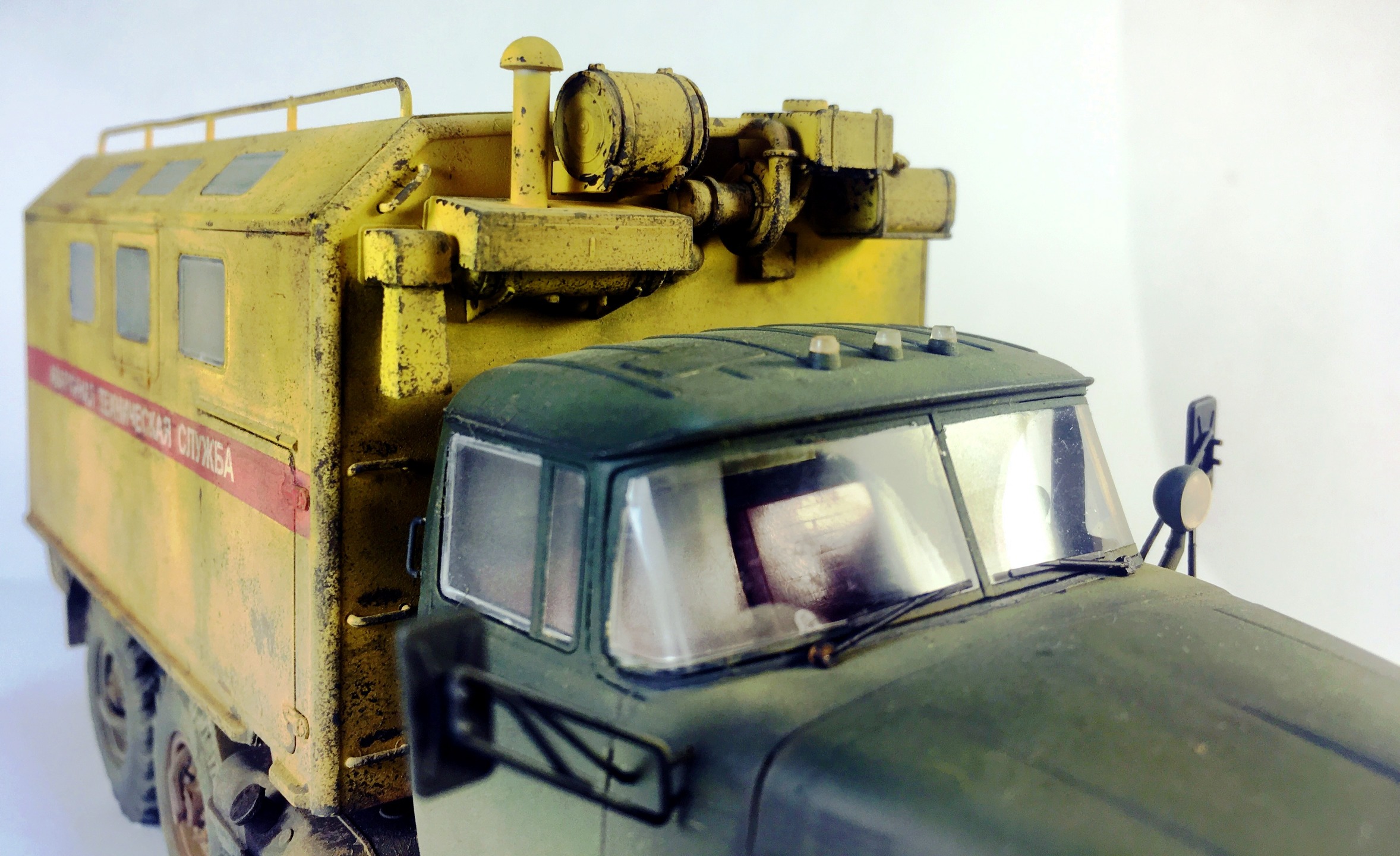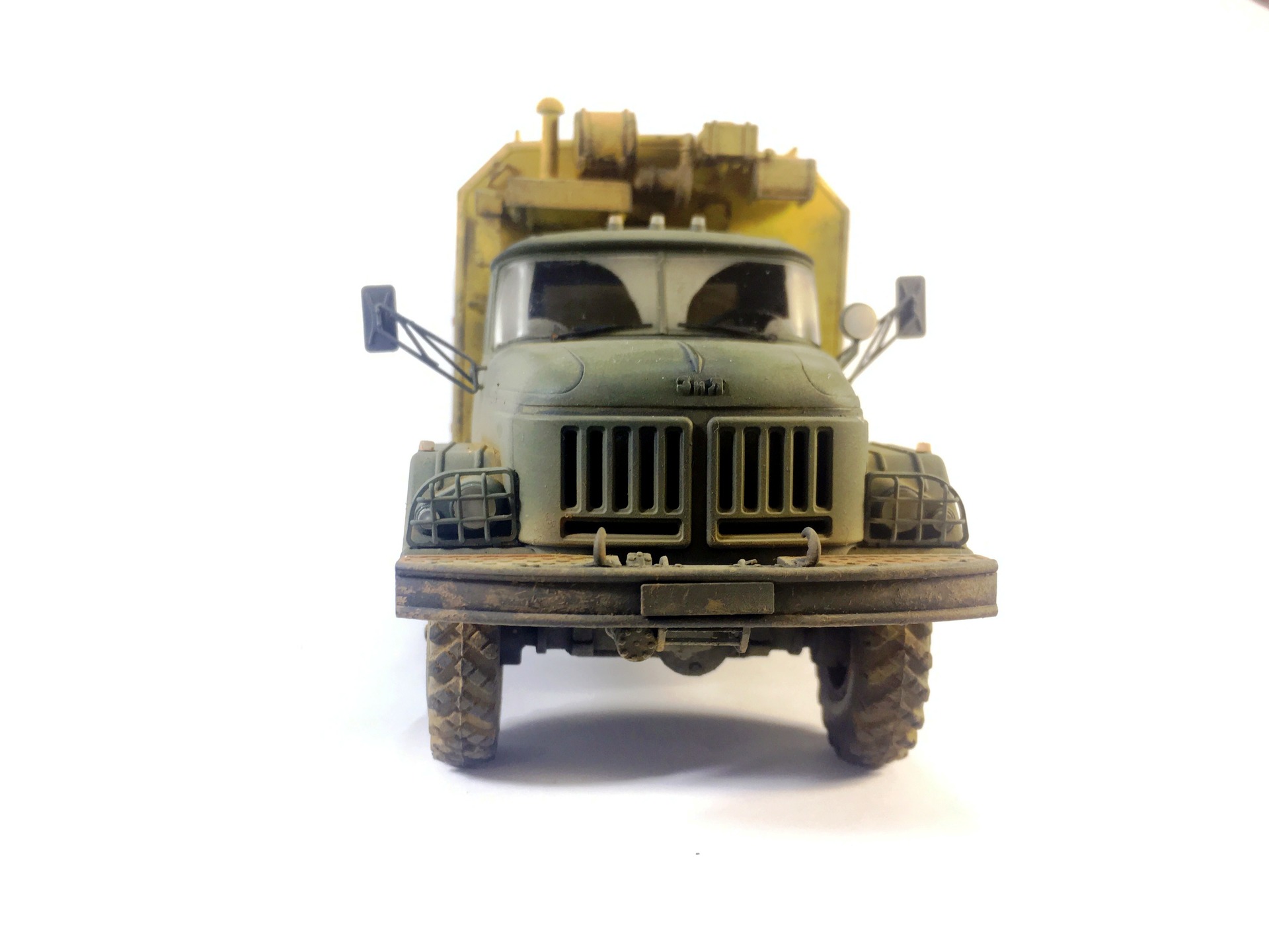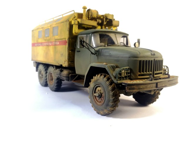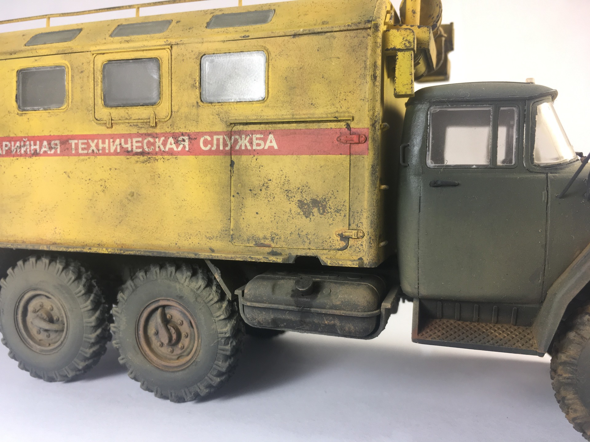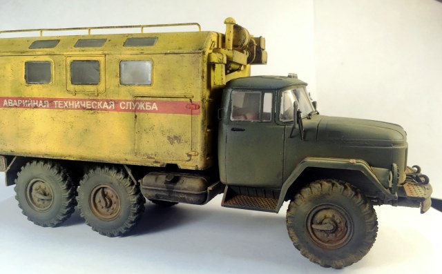 КУНГ понравился,кроме канистры, она "не привязана"! На кабине несделана расшивка на боковинах под капотом,плохо покрашен уплотнитель лобового стекла,крепления топл.баков и брызговики надо было сточить до масштабной толщины или изготовить новые . И беда этого набора это колёса и защита фар,но это не к вам претензии