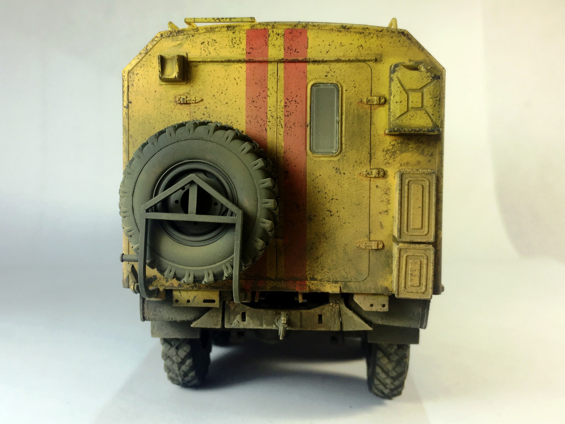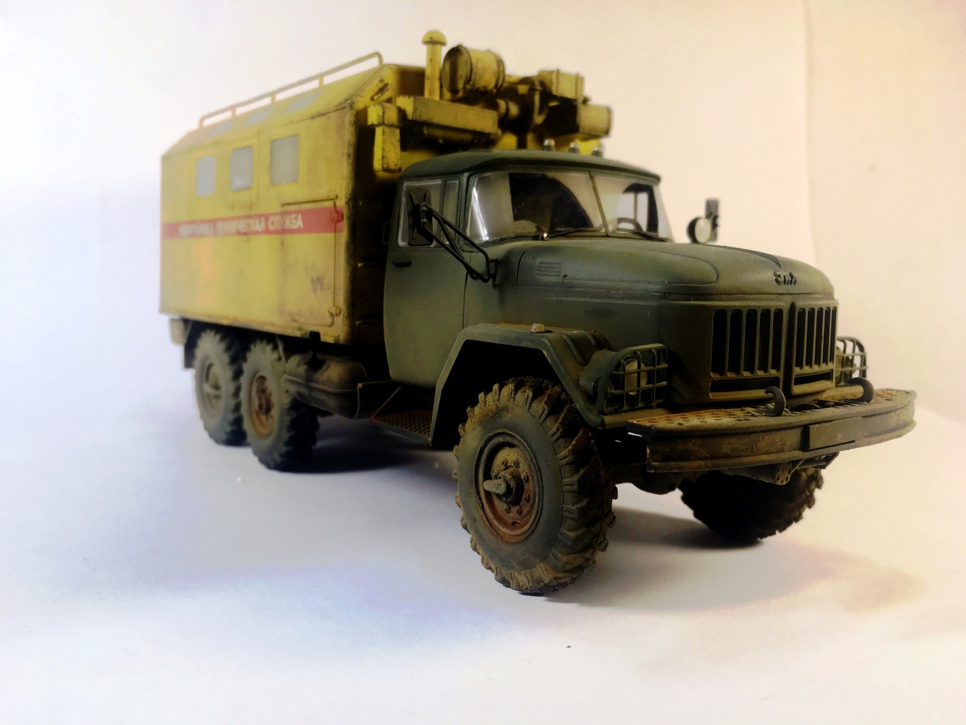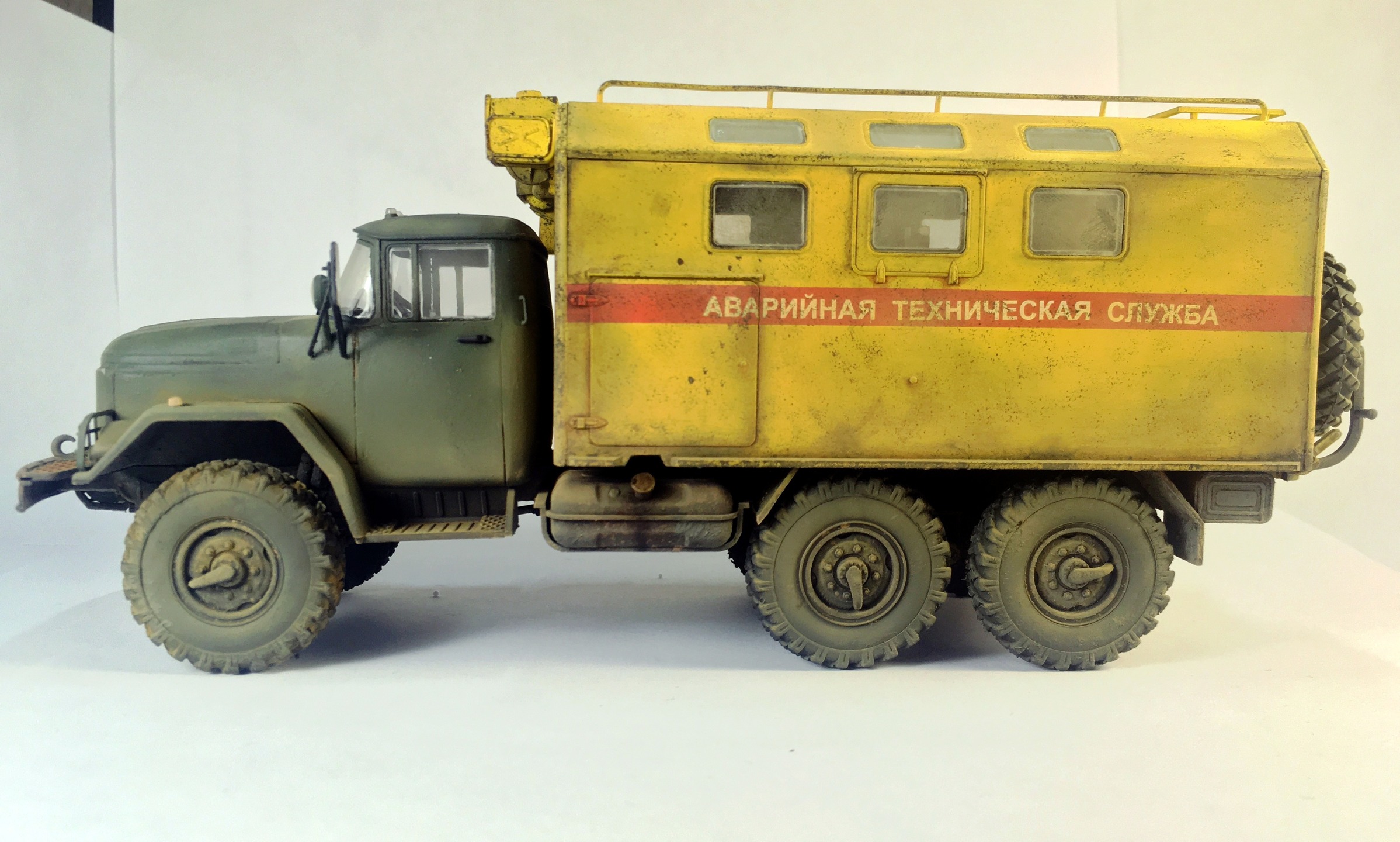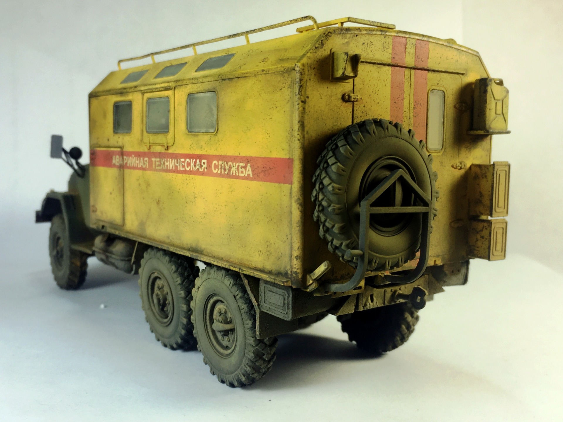 КУНГ понравился,кроме канистры, она "не привязана"! На кабине несделана расшивка на боковинах под капотом,плохо покрашен уплотнитель лобового стекла,крепления топл.баков и брызговики надо было сточить до масштабной толщины или изготовить новые . И беда этого набора это колёса и защита фар,но это не к вам претензии