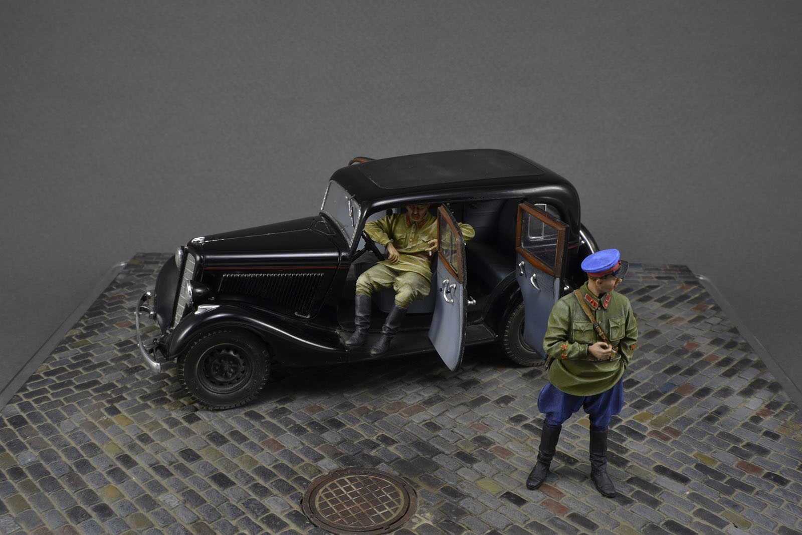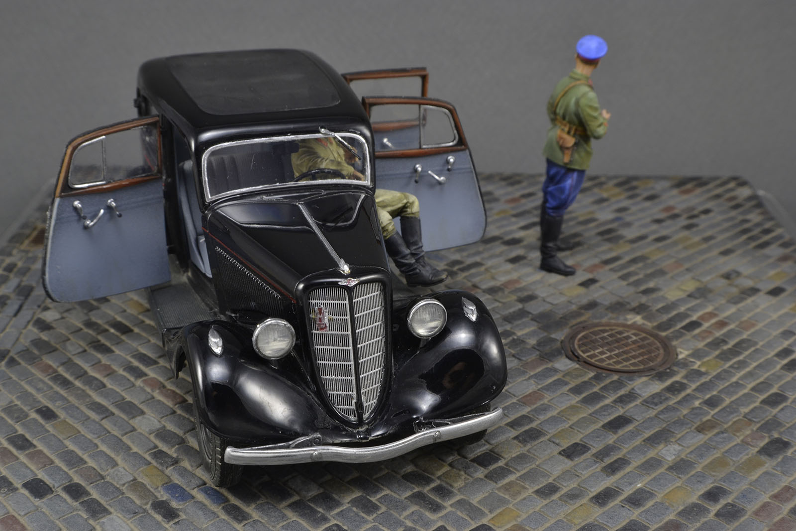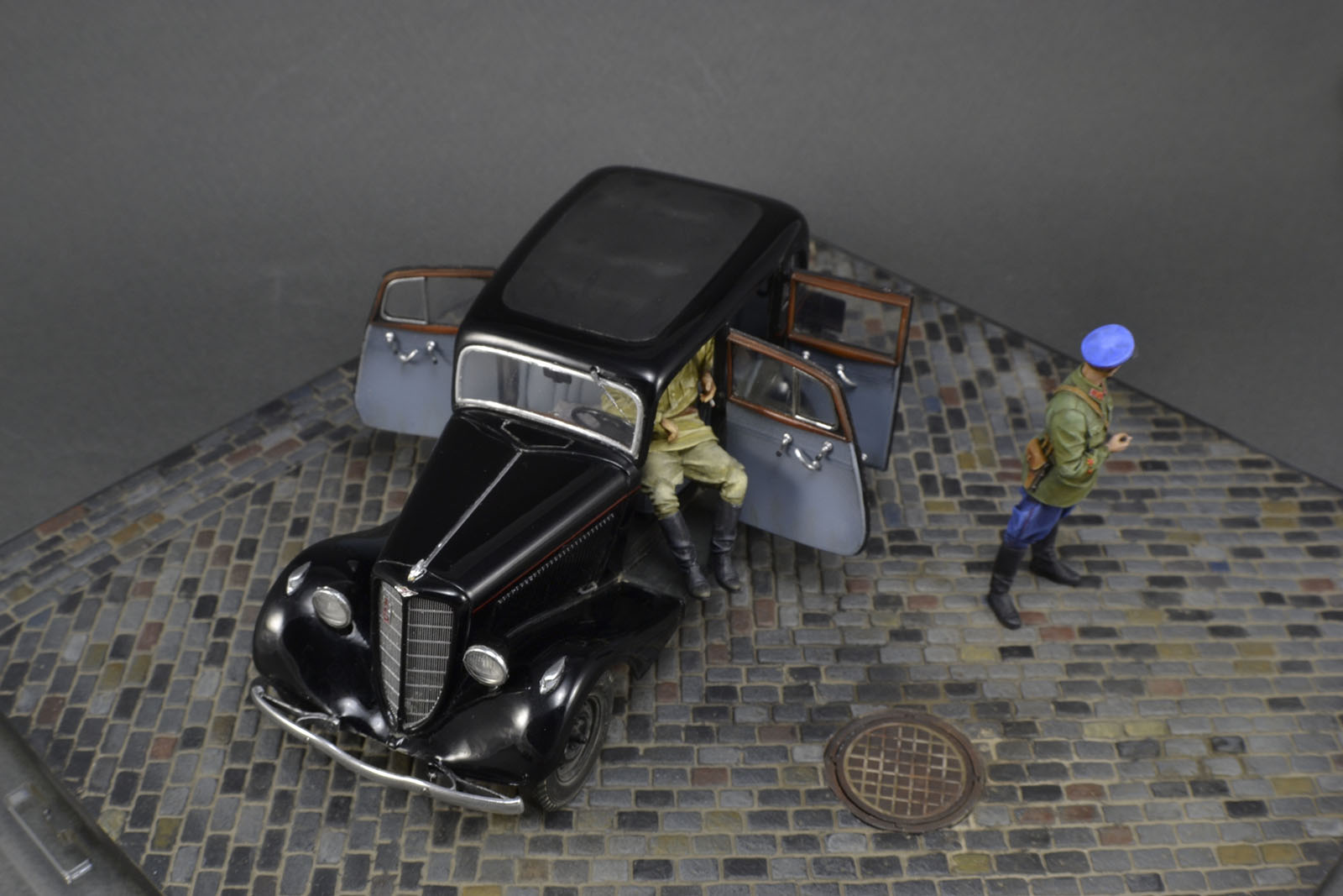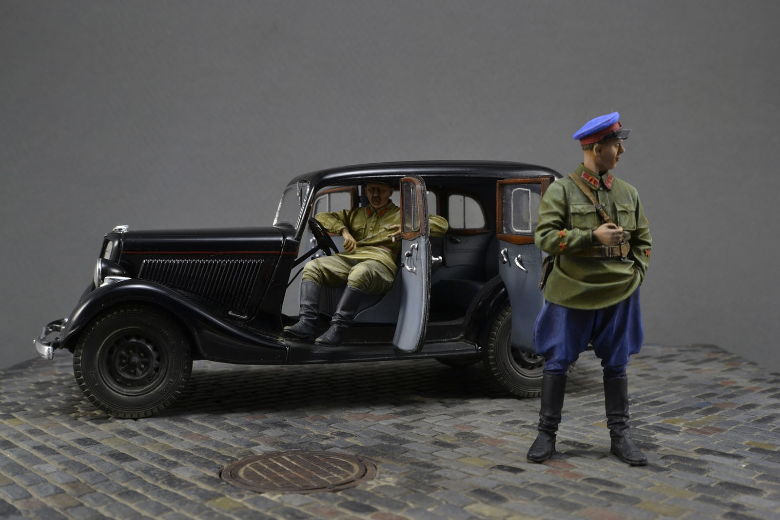 Хорошо получилась и машина и фигурки. Брусчатка только пестровато выглядит. Если слегка пигментом пыли пройтись, будет гармоничнее. ИМХО.