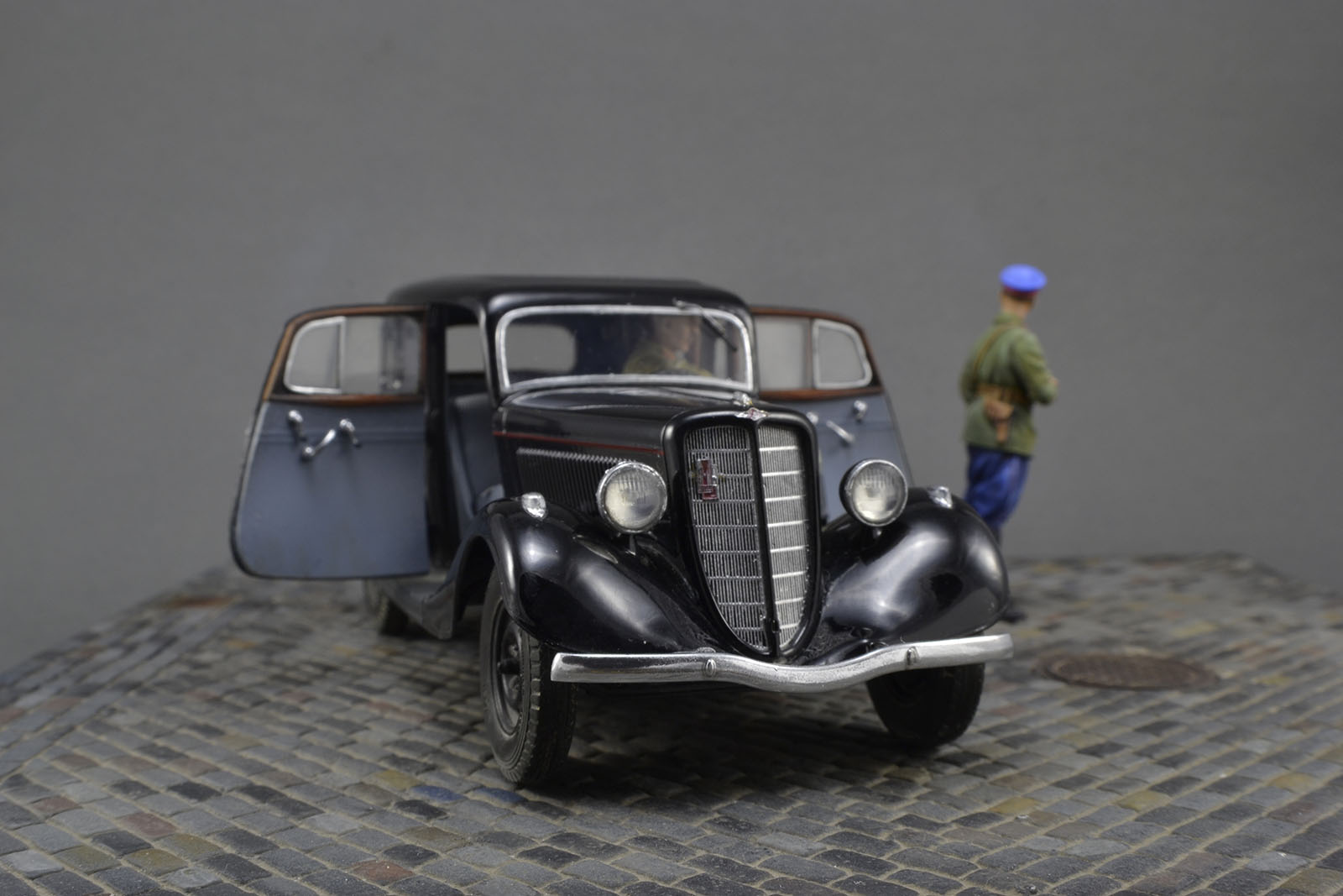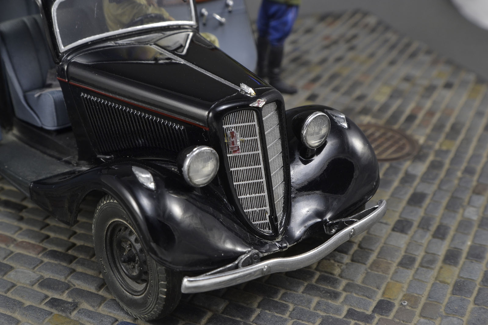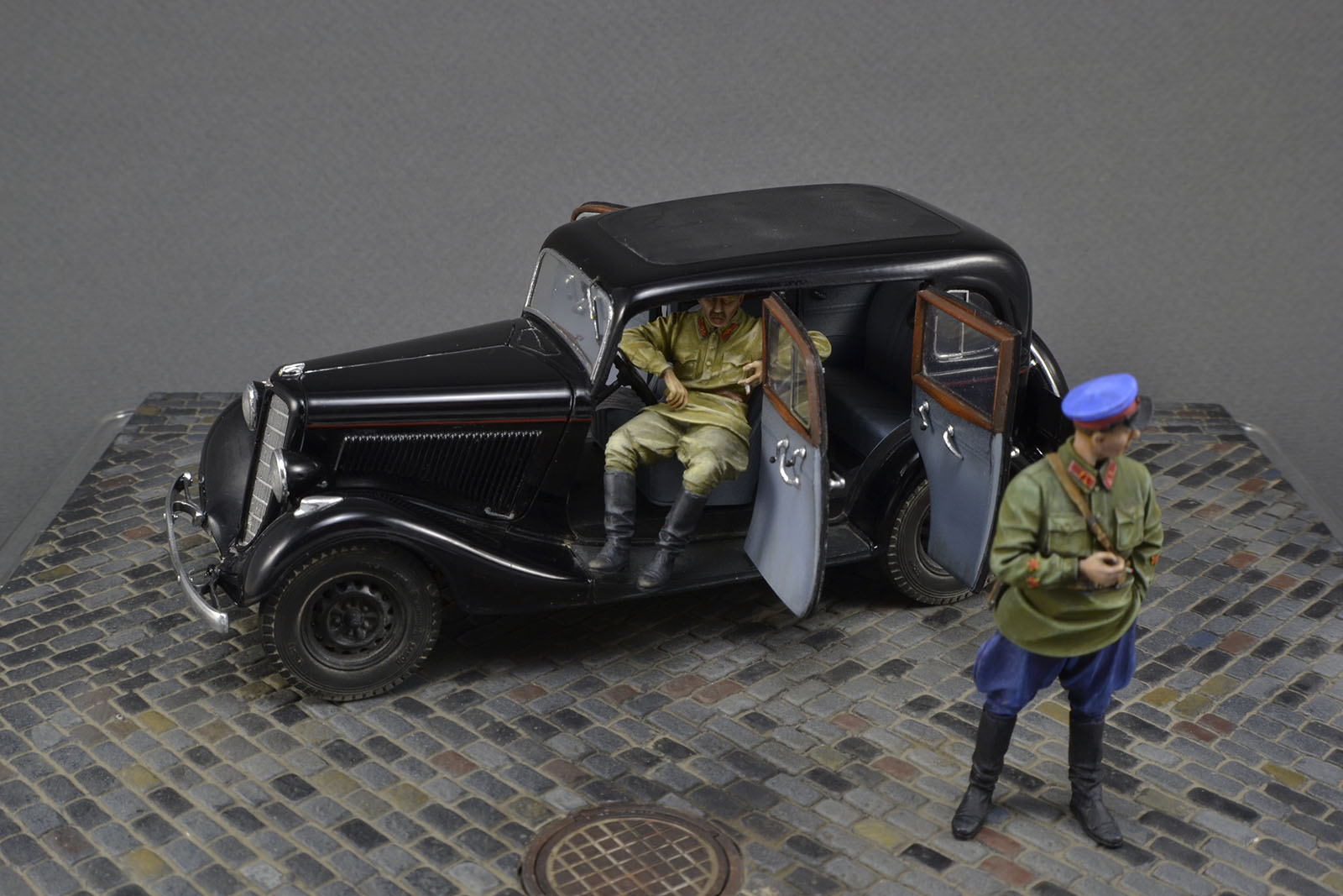 Хорошо получилась и машина и фигурки. Брусчатка только пестровато выглядит. Если слегка пигментом пыли пройтись, будет гармоничнее. ИМХО.