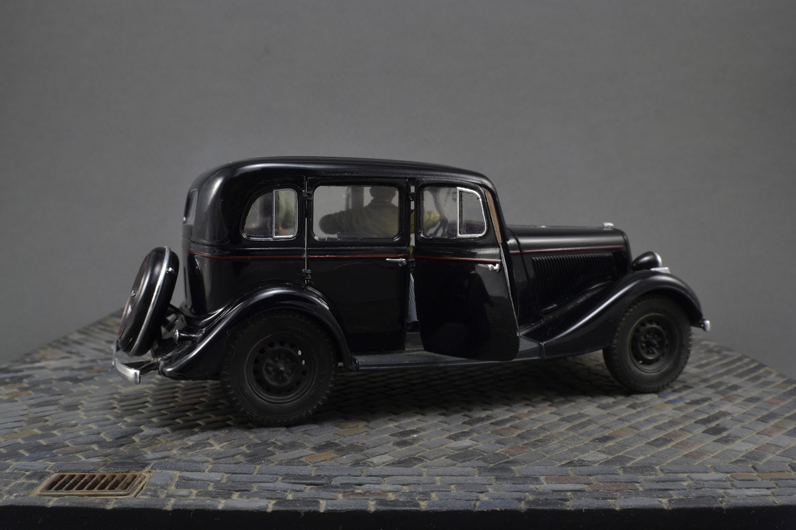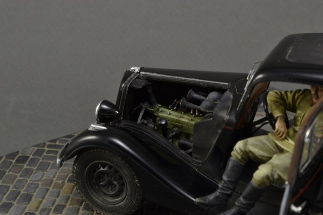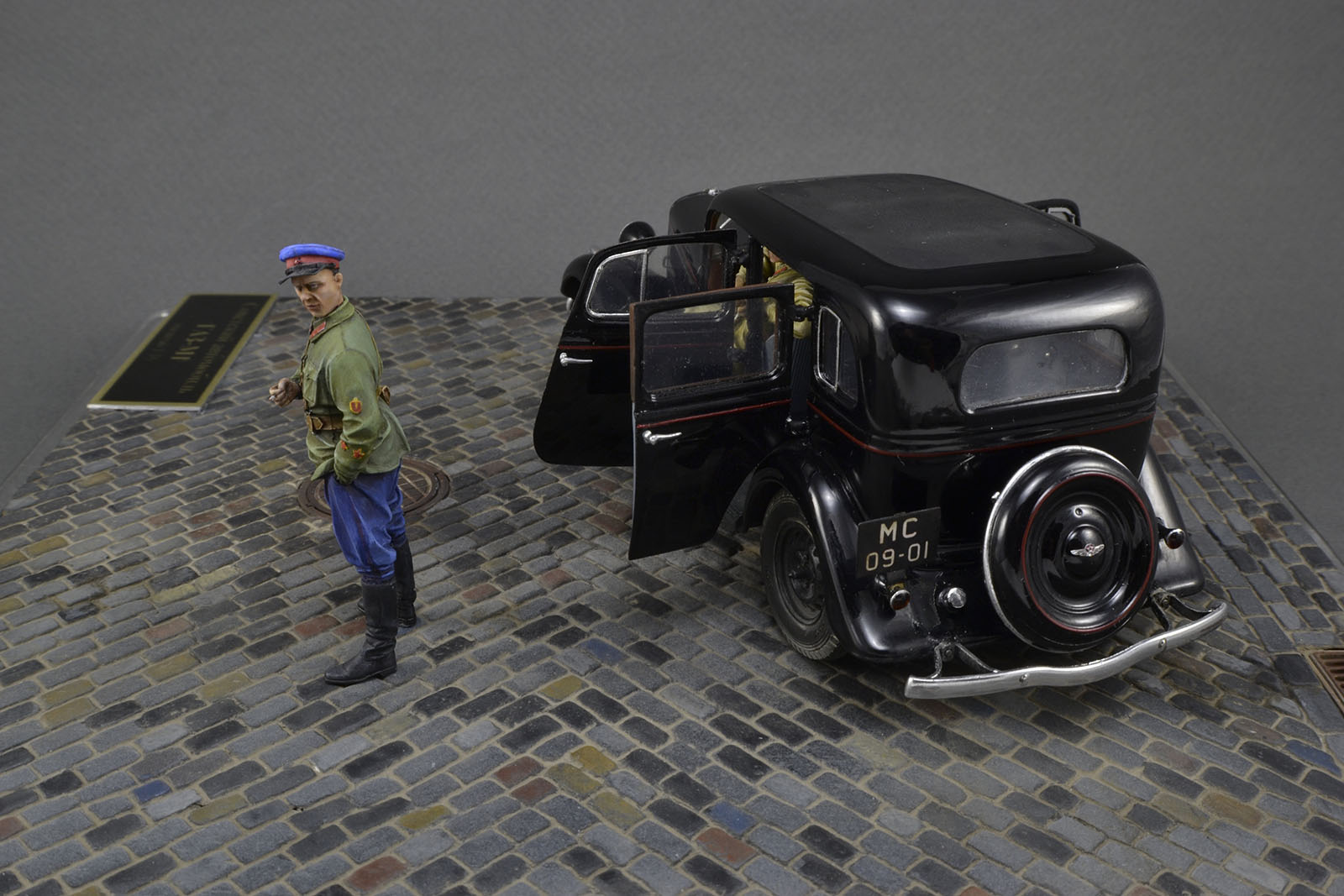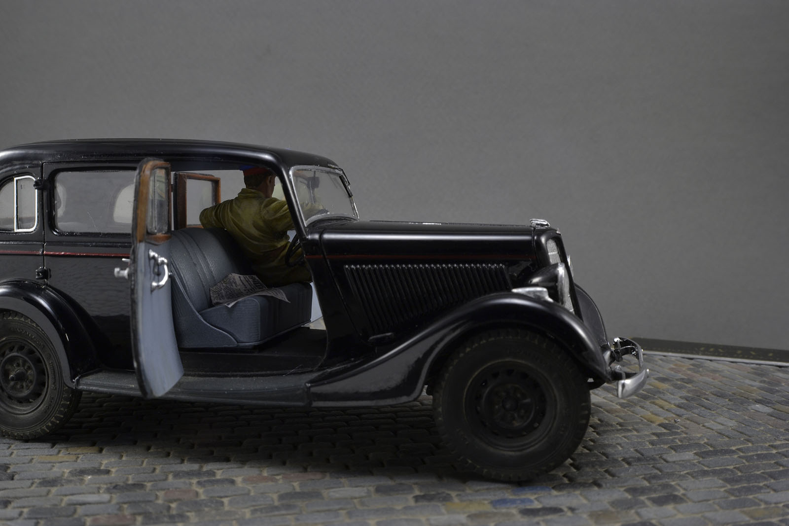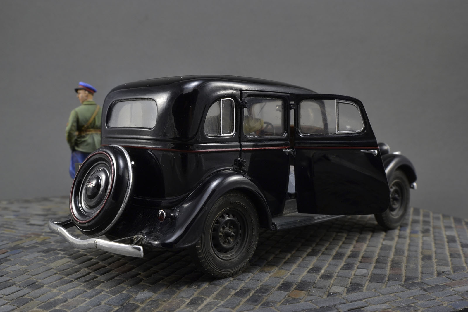 Хорошо получилась и машина и фигурки. Брусчатка только пестровато выглядит. Если слегка пигментом пыли пройтись, будет гармоничнее. ИМХО.