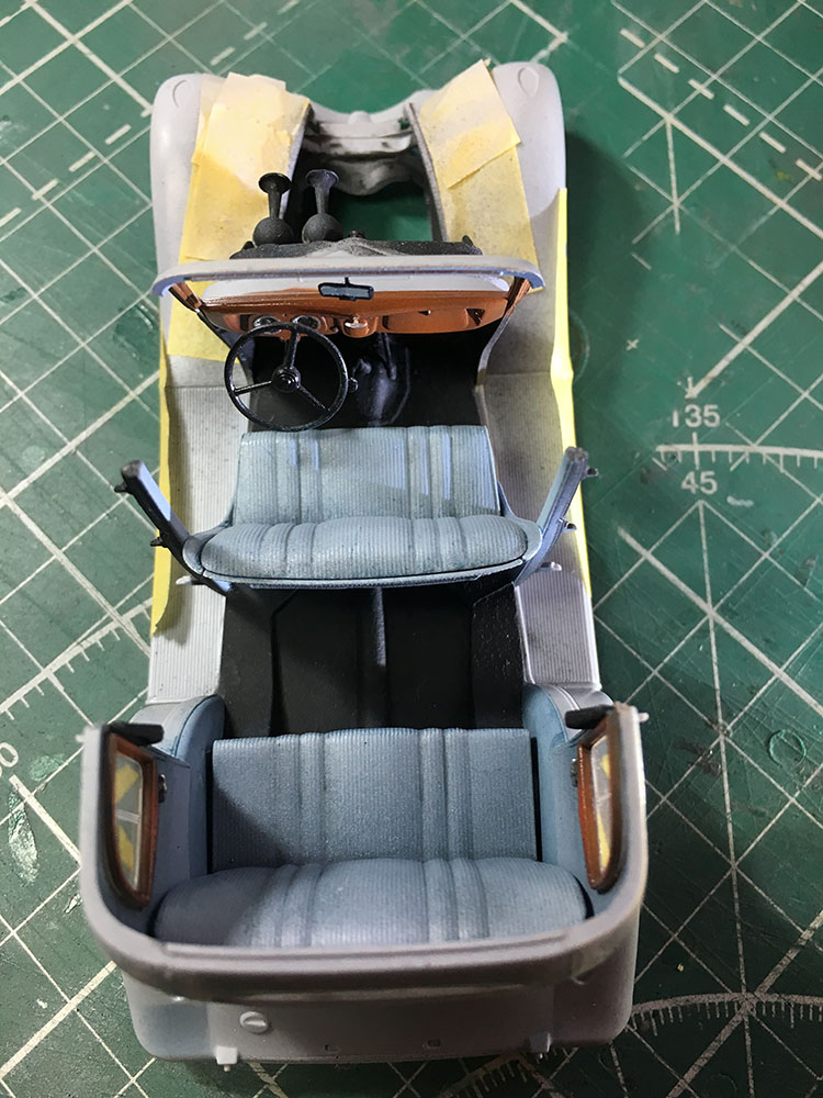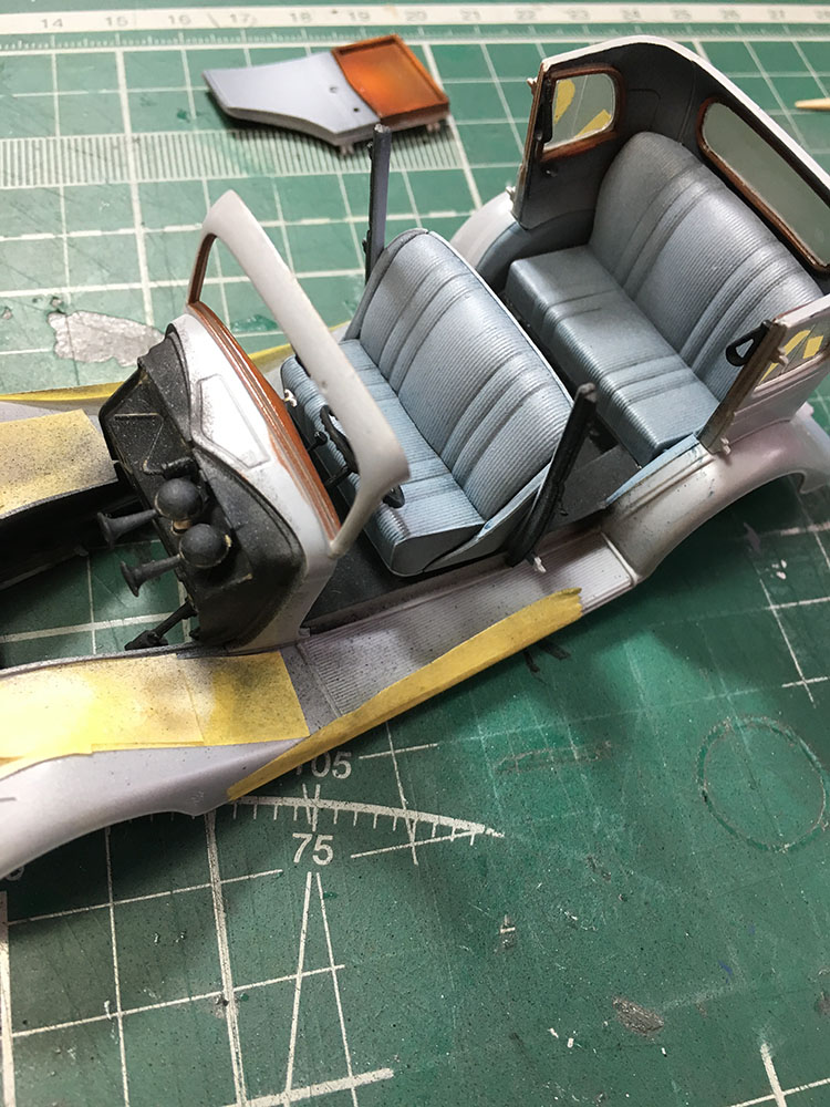 Фигурка водителя видимо на место не совсем селя, у меня от фуражки водителя до потолка еще два миллиметра и рука на руль легла полностью. Сиденье переднее на модели клеится произвольно на полозья поэтому сначала надо посадить фигурку ,что бы прикинуть на каком месте клеить сидение, что бы фигурка "села" на место ,иначе можно не попасть.