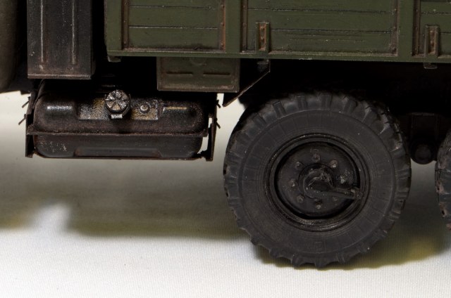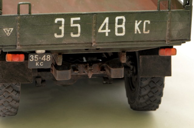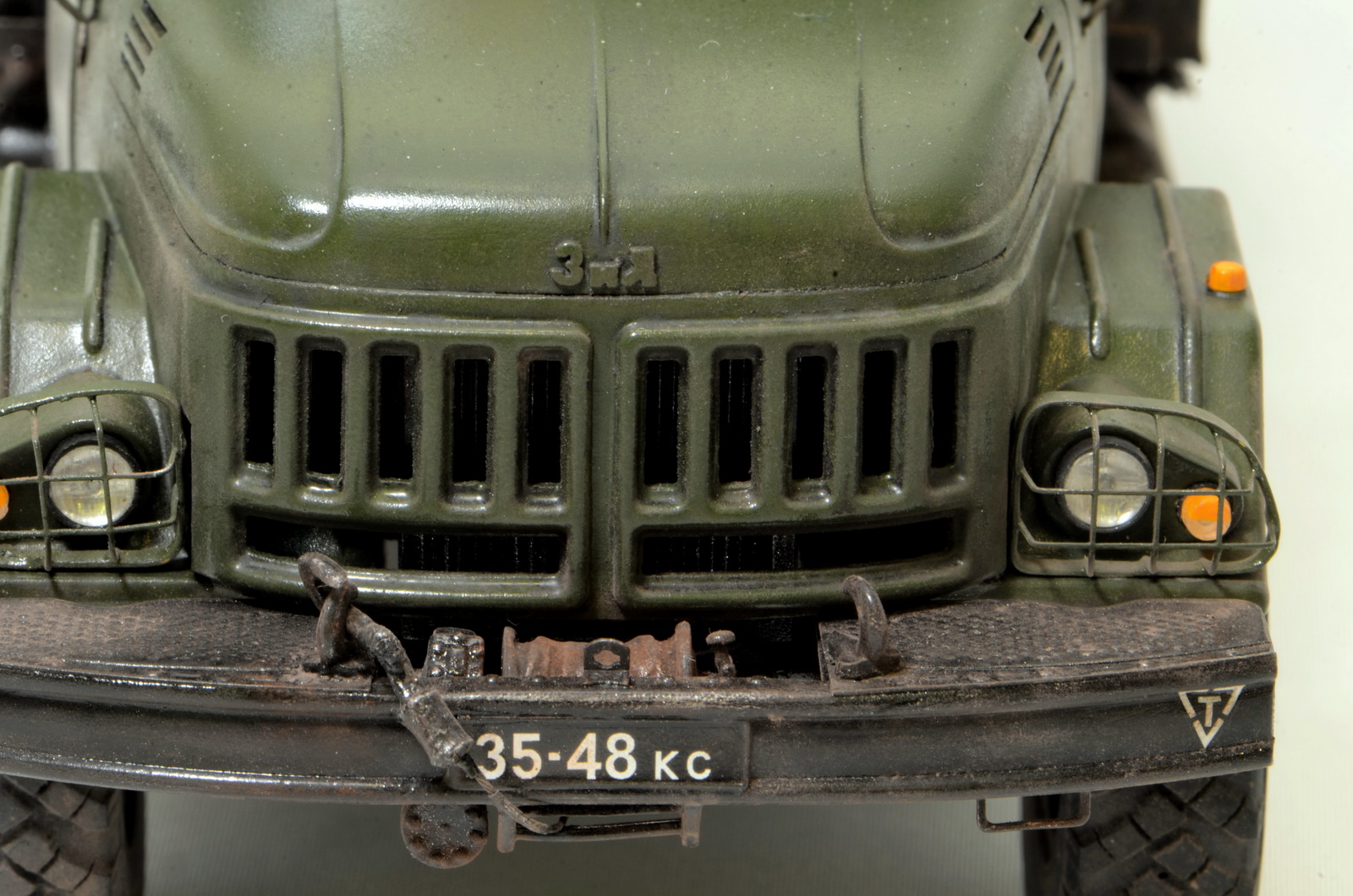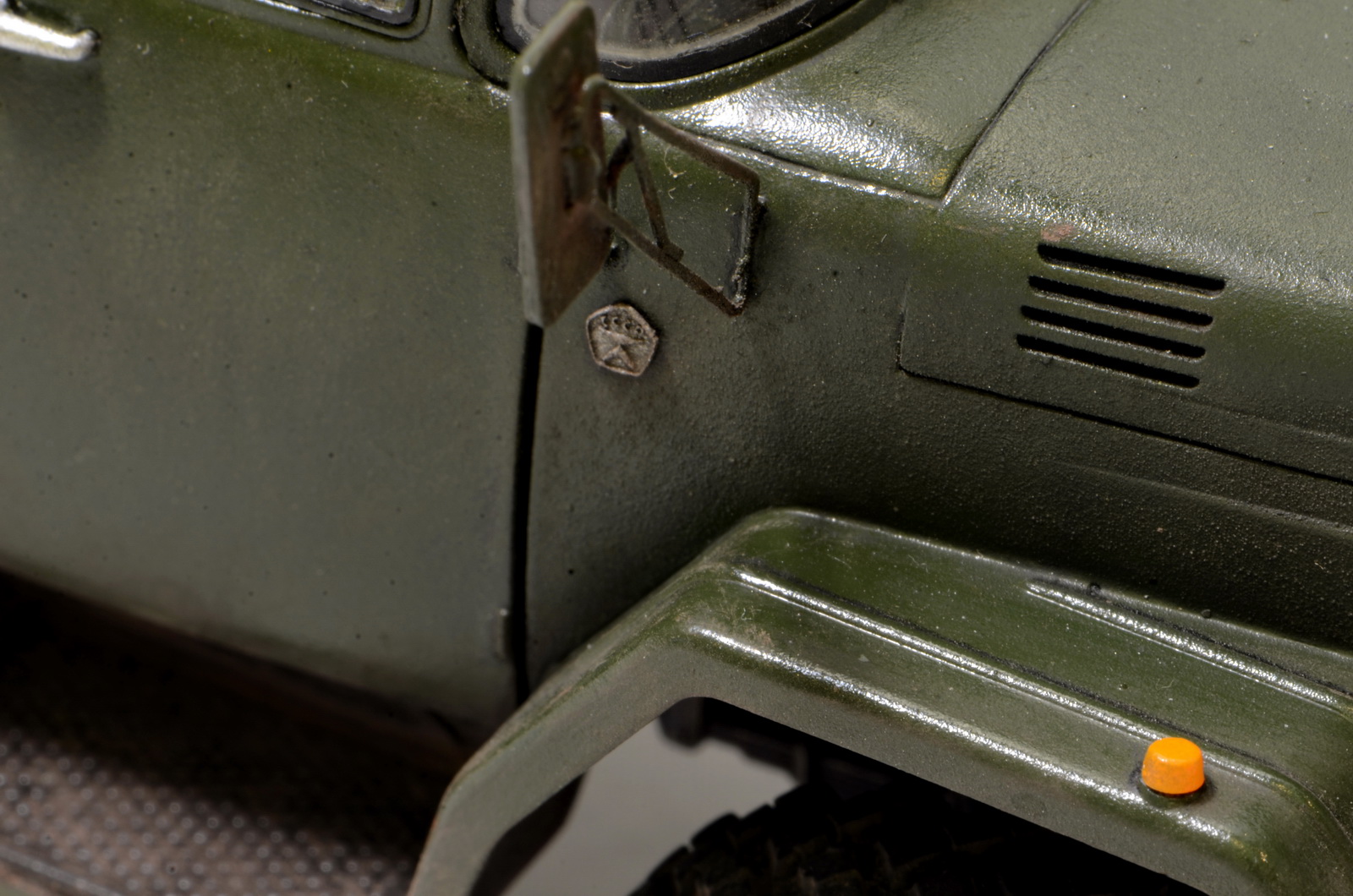 На будущее надо не забыть сделать скобы крепления кузова к шасси, поздно спохватился. Ну и трос другой нужен, этот нормально смотрелся ровно до момента нанесения грунта, который залил весь рисунок. Крюк делал из пластика, скопировав родной из набора ЗИЛ-131 МТО.