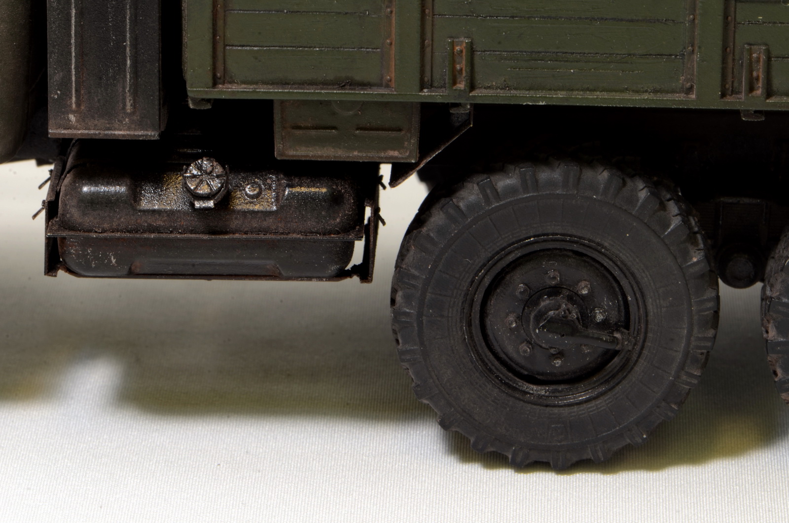 Не на всех,а только на двух передних осях,на заднем мосту стоят как надо))) И распространённая ошибка многих (сам такой же),нет прорези по задней кромке капота на боковинках,это же съёмные части оперения кабины. В остальном работа понравилась.