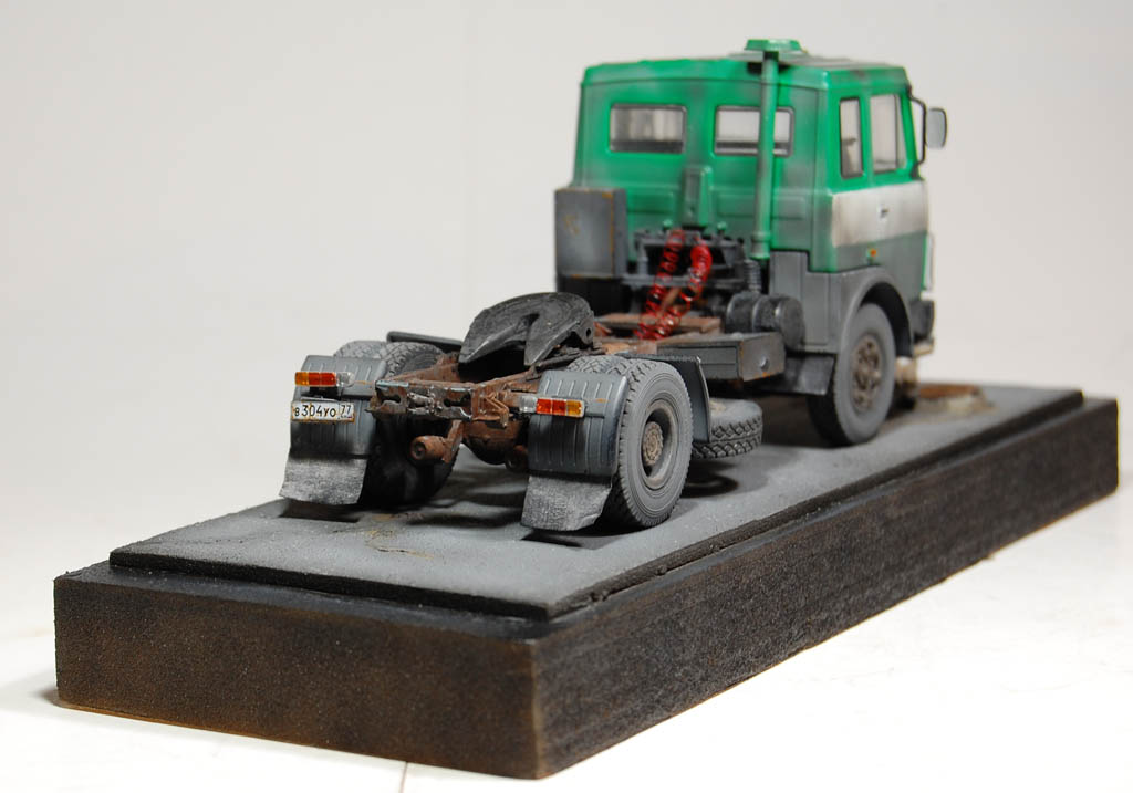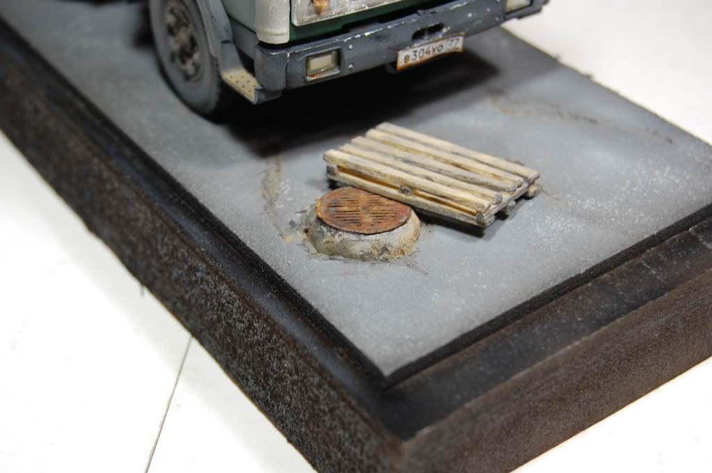 Здравия всем!Переделка Маза от АвтоИстории и подставка под него.Немного добавил фенечек а точнее:проводка на бак,брызговики из наждачки,заменил поворотники на решетке,номера,поддон самодельный,имитация асфальта из подложки под ламинат и лючек колодца от Петрограда.