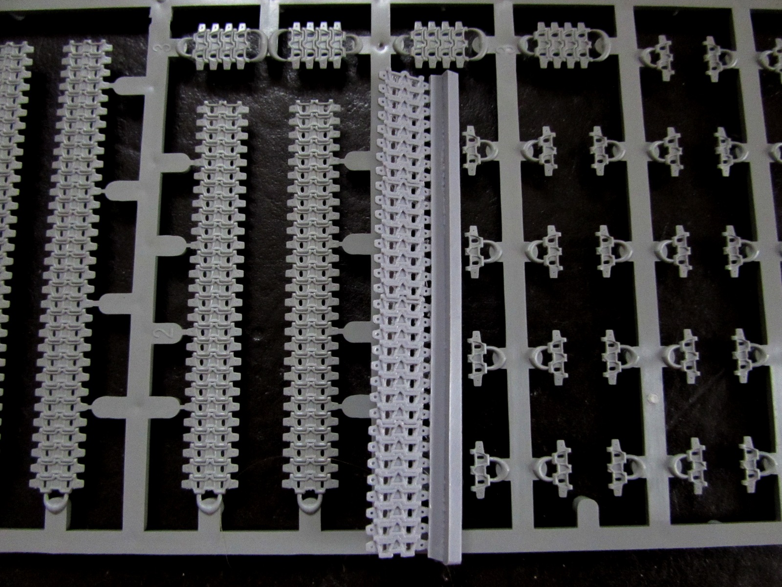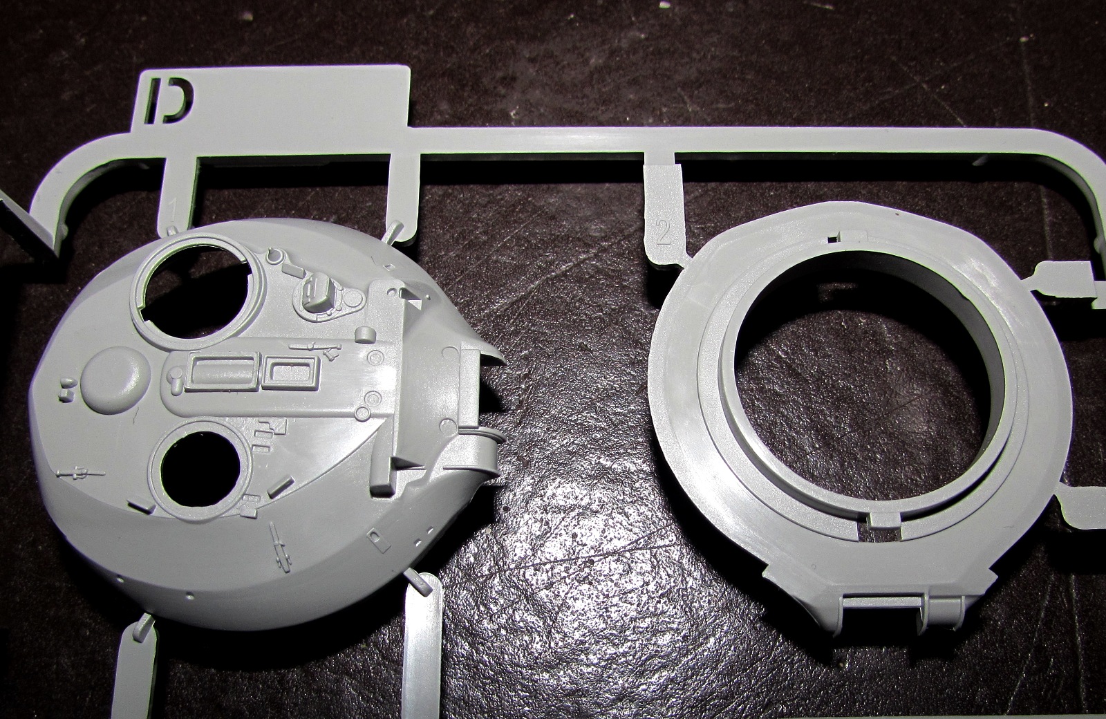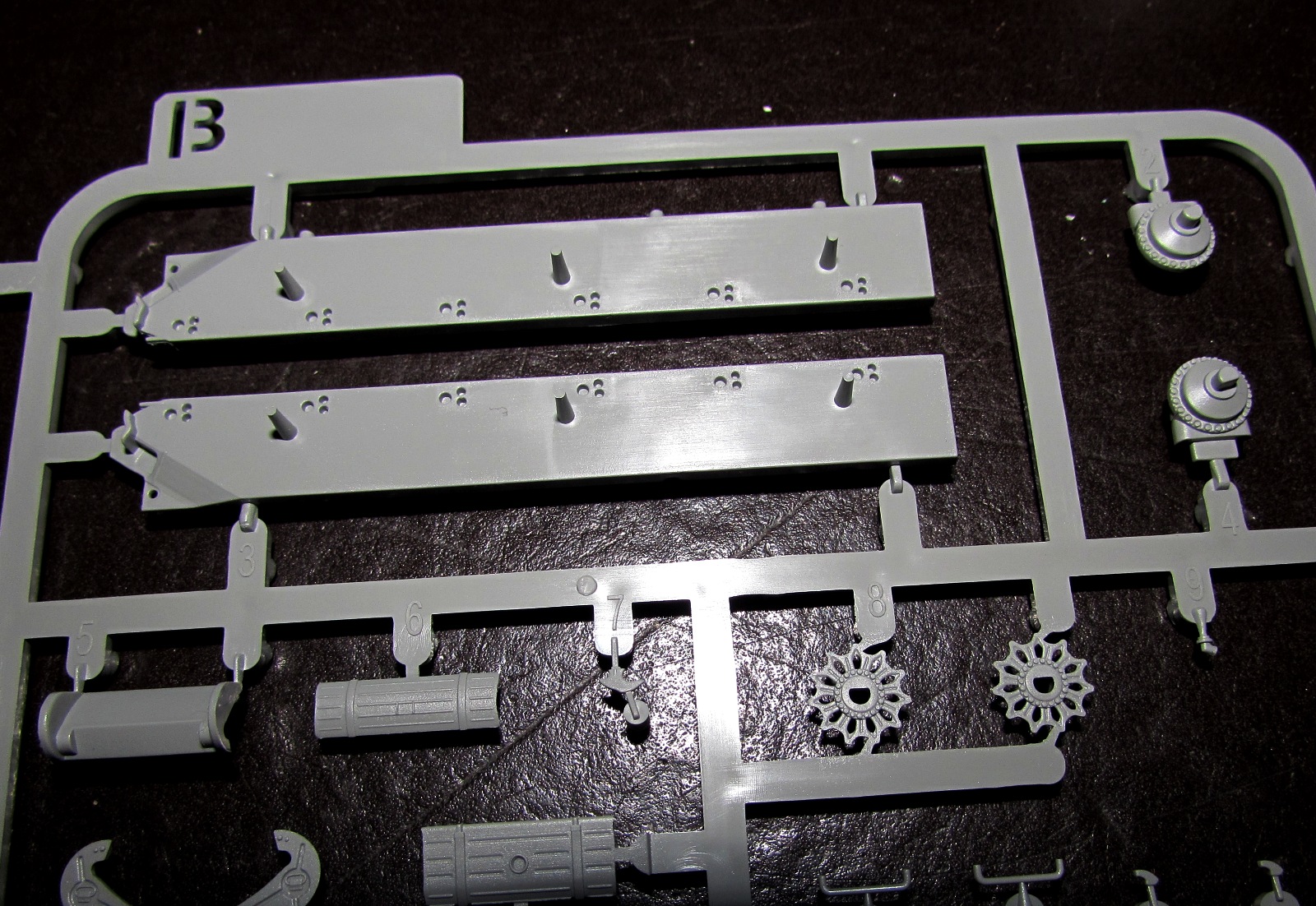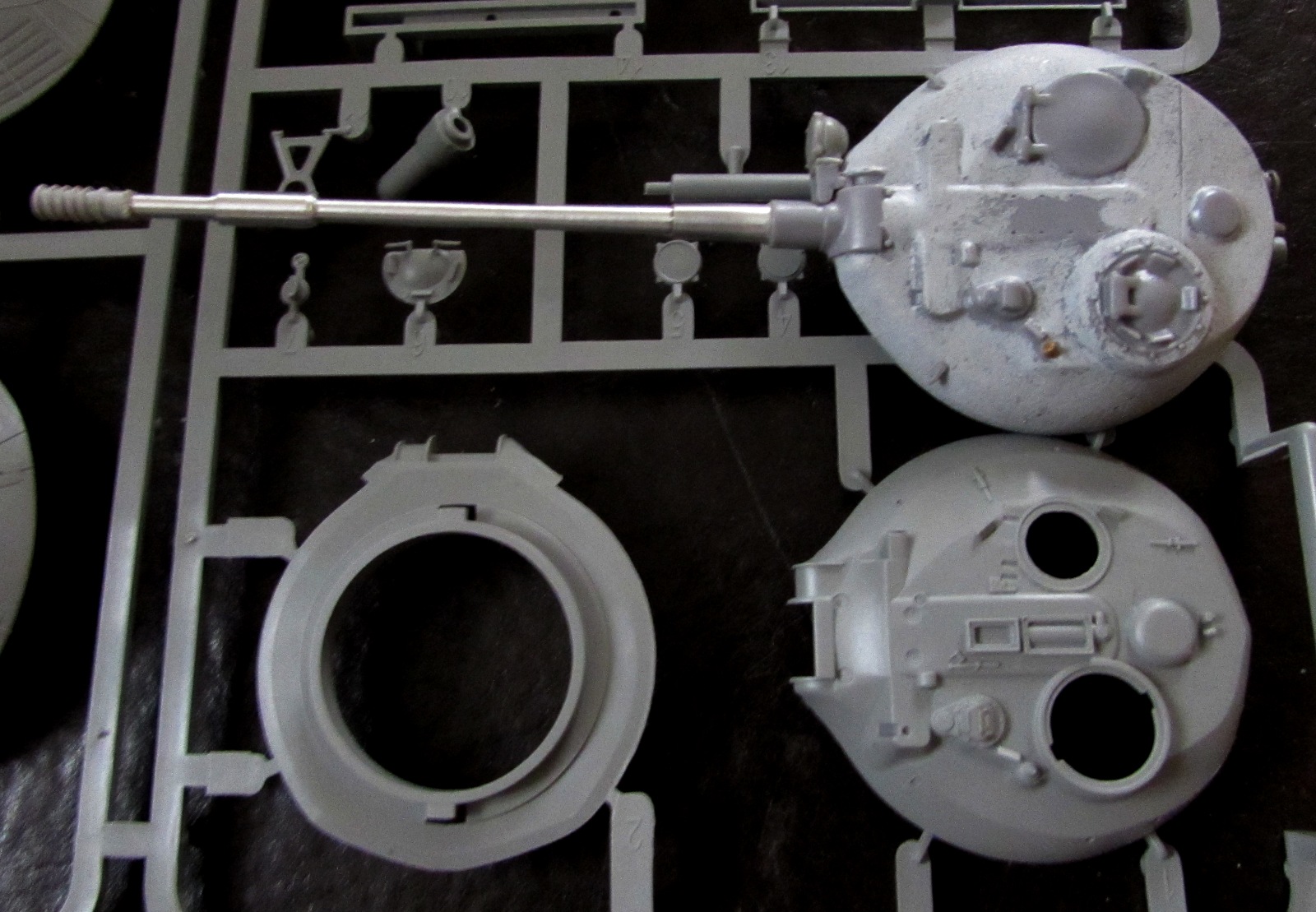 Во-первых, ОЧЕНЬ странный пластик. Я имел в свое время дело с моделью 1/35 от Такома (собирал Сен-Шамон), и так пластик был хоть и не очень хорошо местами стыкующийся, но хороший и по качеству, и по удобству обработки. Этот же пластик похож на худшие образцы от Трумпетера - ломкий, хрупкий, заходящий питателями литника на детали. Из-за хрупкости его очень трудно зачищать, трудно отделять от литника, не заработав "рытвин" на деталях. Но если с корпусом и башней это не критично (в первом случае лечится шпатлевкой, во втором - закроется фактурой литья), то в случае с мелкими и рельефными деталями типа люков и мелочевки это критично - вы физически не зачистите это до конца. Даже использование шлифовальных насадок не исправит местами ситуацию полностью.