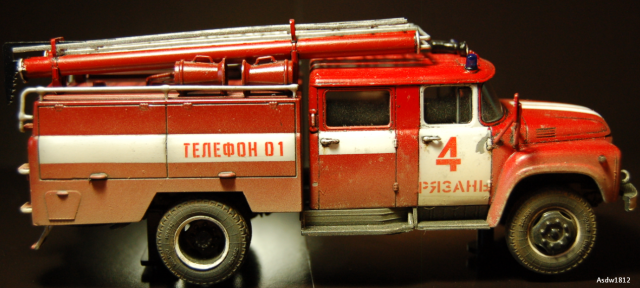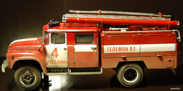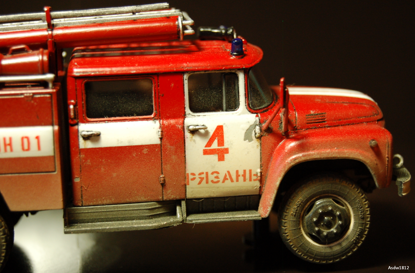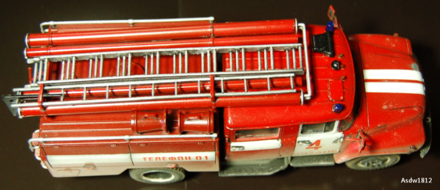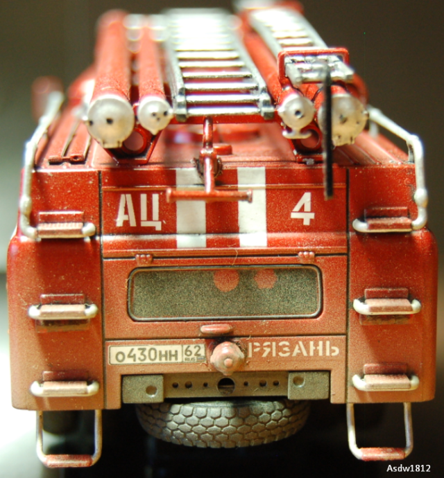 День добрый, как человек отработавший начальником караула в ОПО, скажу автору так: такой убитости не будет даже в колхозе должнике, машины стоят на балансе отряда, а не поселковой администрации, может по окраске после ремонта части автомобиля отличаться, но убитость передать надо было в малой толике, а именно обозначить следы легкой ржы на хромированых трубках в местах примыканий на крыше отсека, по поводу мат.части, отсутствие лестницы палки допустимо, но гидроэлеватор присутствовать обязан, большего писать не буду, головка насоса в цвет алюмия, ручки на отсеках хром или никель декаль на корме не понятна- АЦ и на правой половине№ 4, это неверно, АЦ-40 должно быть так, то есть на левой АЦ на правой 40 это тип пожарного автомобиля АЦ-автоцистерна, АЛ- автолестница и т.д., цифры это чем оборудован автомобиль 40-это мощность насоса, изивините вызвали на вскрытие позже допишу и вообще я бы ее в галерею отправил после добавления фотографий, тем более первая модель все погнал спасть город